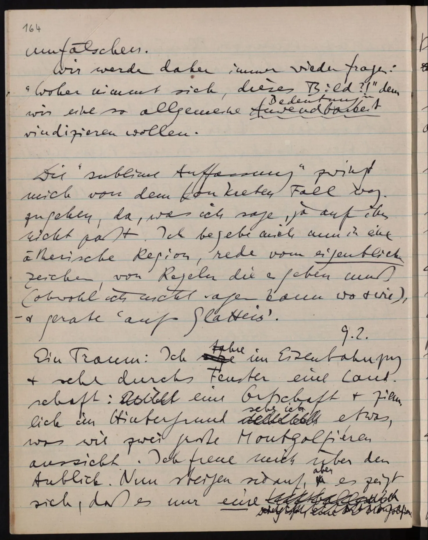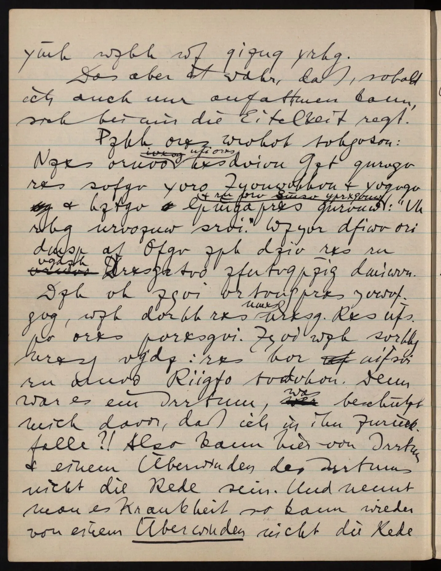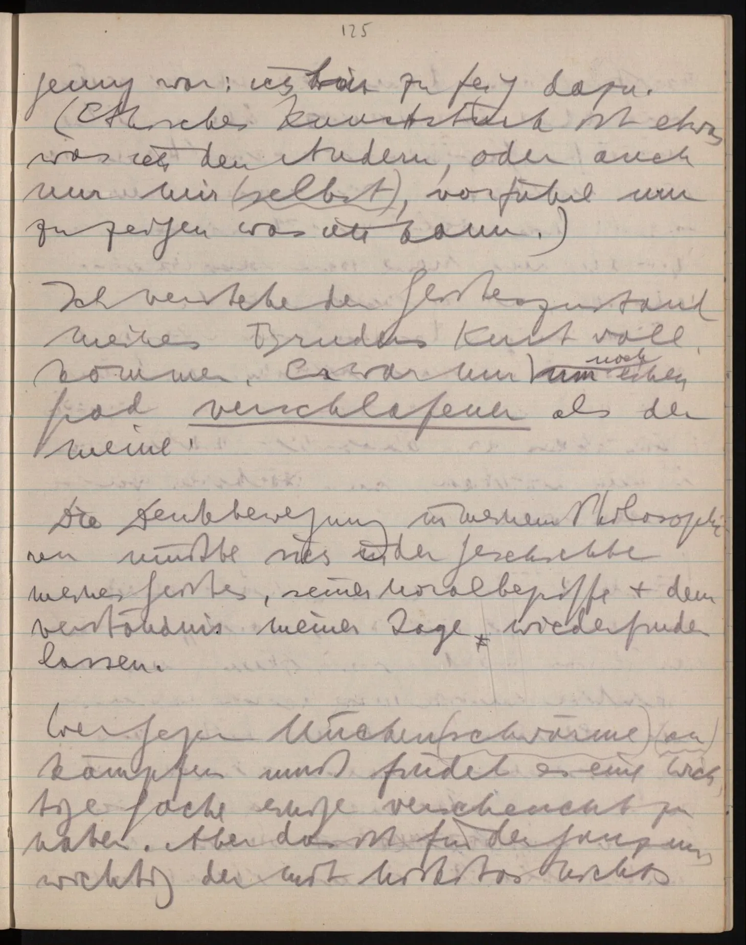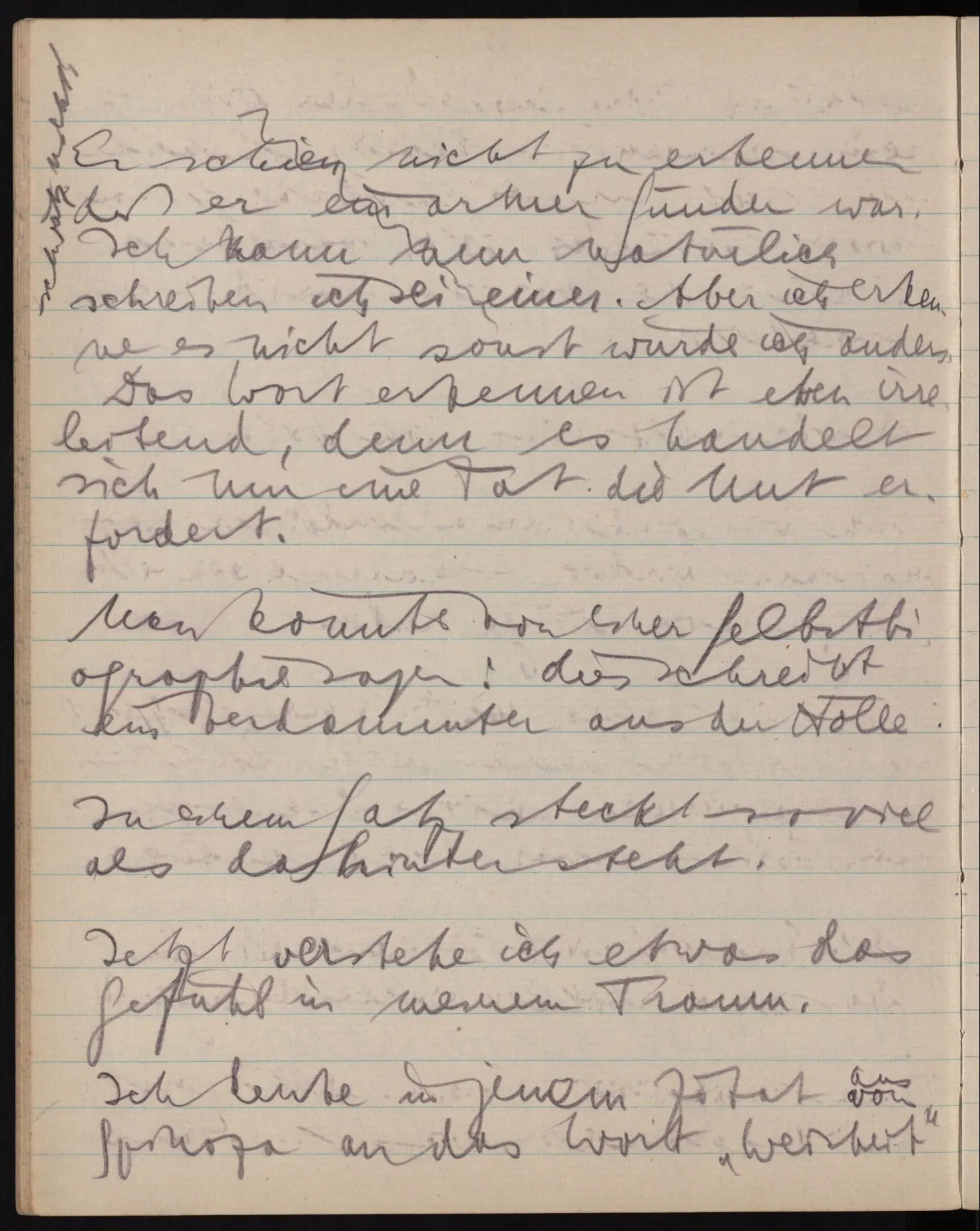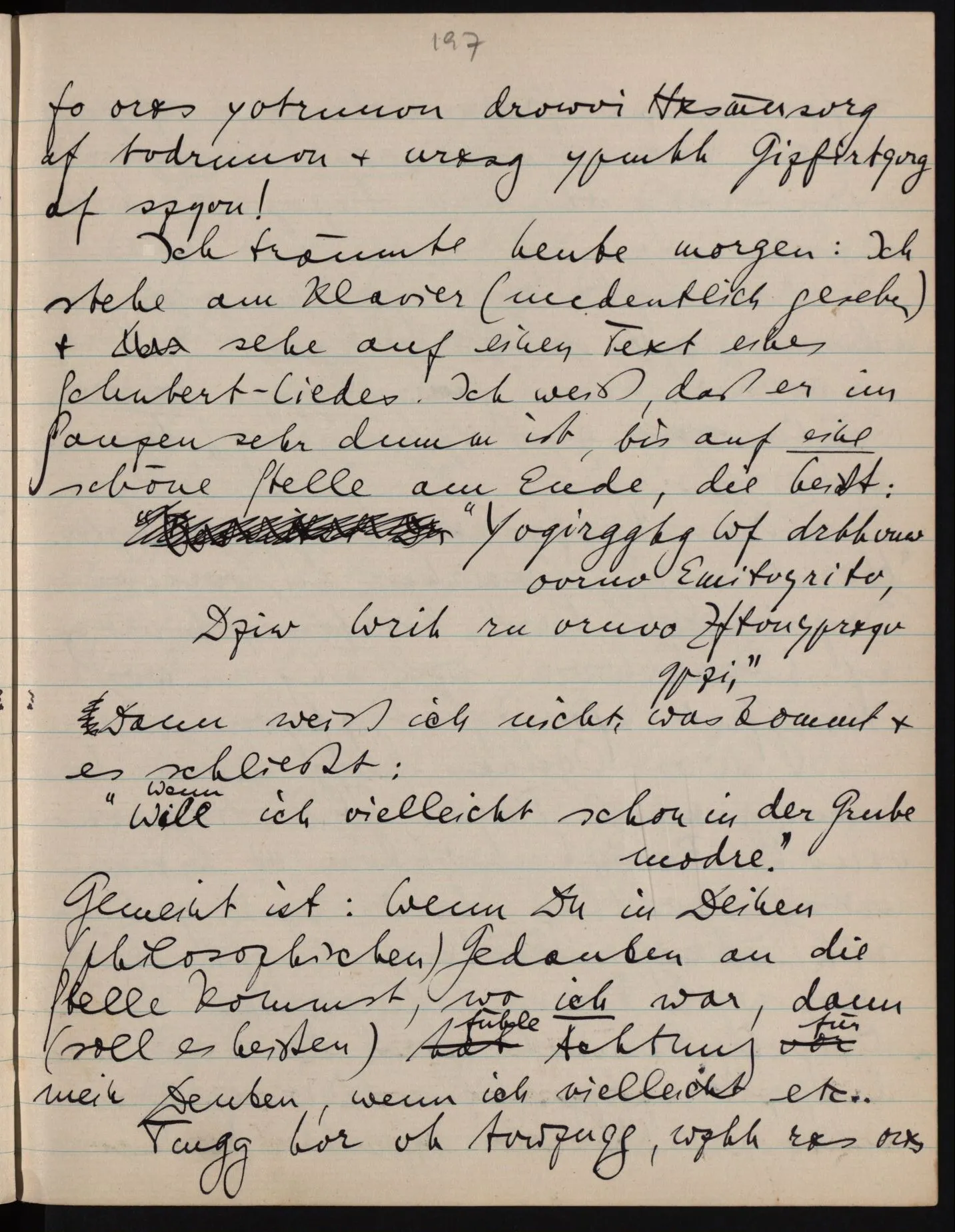 Neulich las ich zufällig in den Buddenbrooks vom Typhus & wie Hanno B. in seiner letzten Krankheit niemand mehr erkannte außer einem Freund. Und da fiel mir auf daß man das gemeinhin als selbstverständlich ansieht & denkt, natürlich, wenn das Gehirn einmal so zerrüttet ist so ist das nur natürlich. Aber in Wirklichkeit ist es zwar nicht das Gewöhnliche daß wir Menschen sehen & sie nicht erkennen aber das was wir „Erkennen” nennen ist nur eine spezielle Fähigkeit die uns sehr wohl abhanden kommen könnte ohne daß wir als minderwertig zu betrachten wären. Ich meine: Es erscheint mir als selbstverständlich daß wir Menschen „erkennen” & als totale Zerrüttung wenn jemand sie nicht erkennt. Aber es kann dieser Stein sehr wohl in dem Gebäude fehlen & von Zerrüttung nicht die Rede sein. (Dieser Gedanke ist wieder mit den Freud’schen nahe verwandt, mit dem, über die Fehlleistungen.)