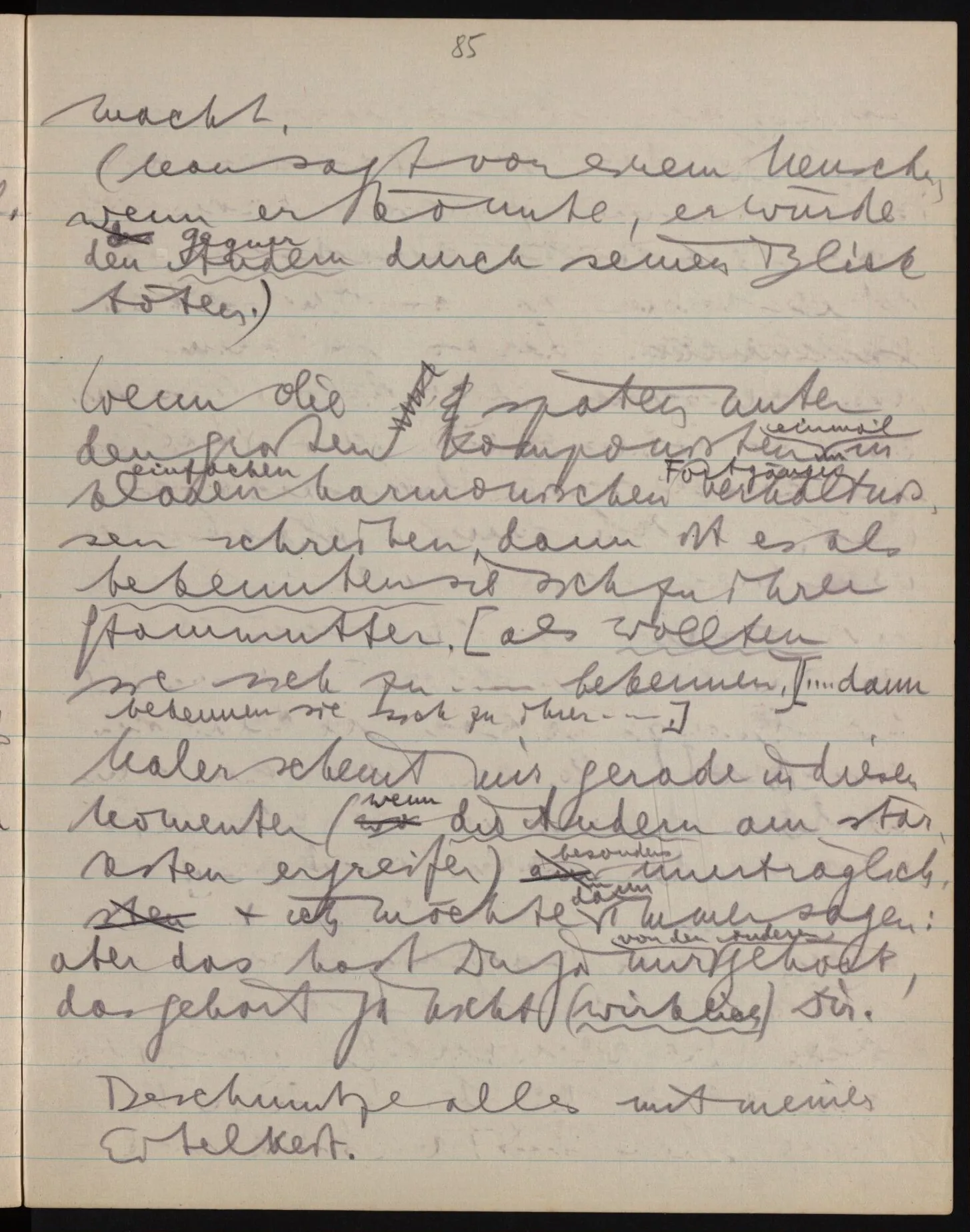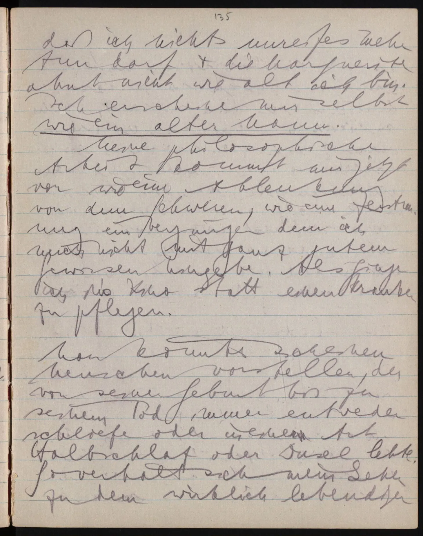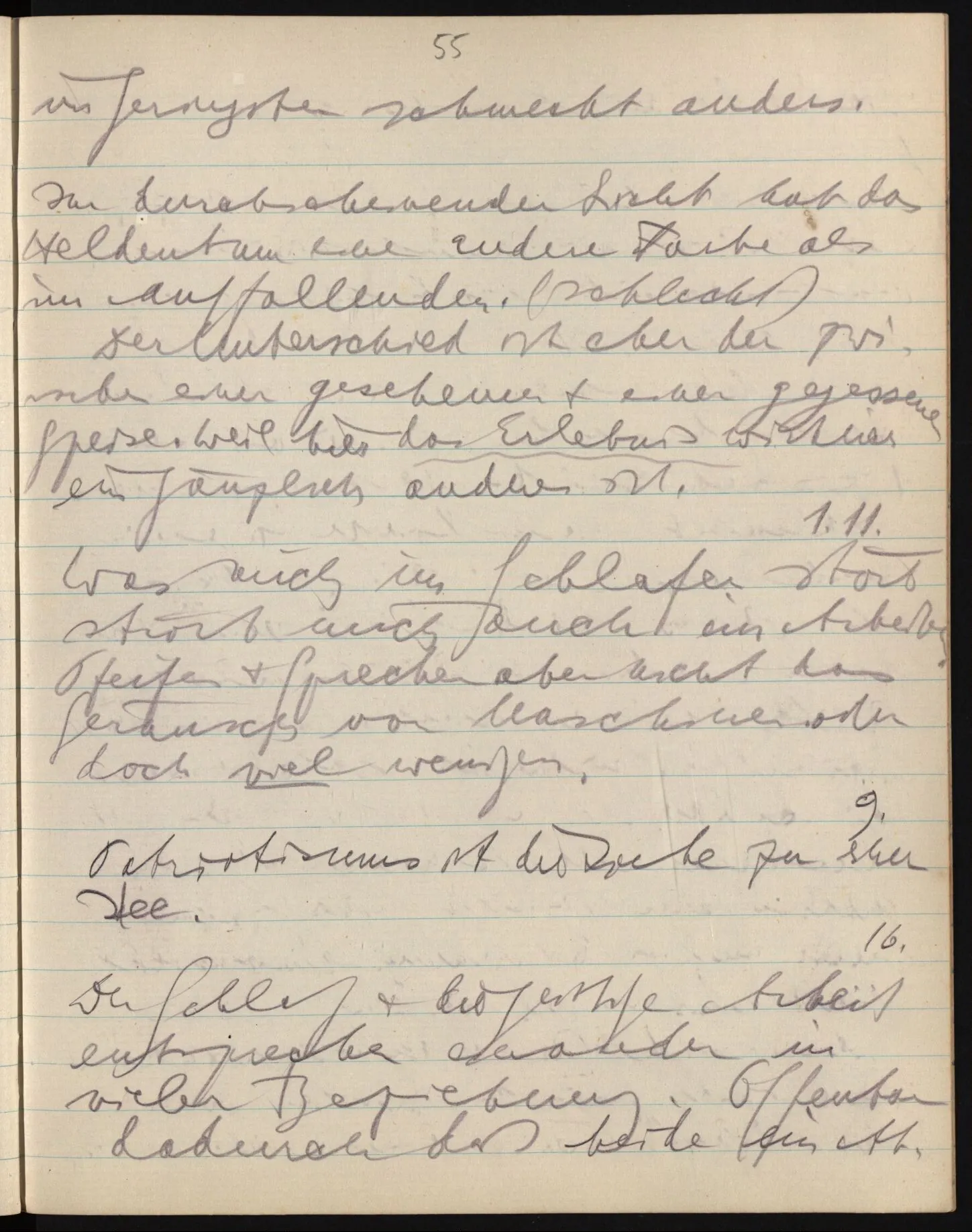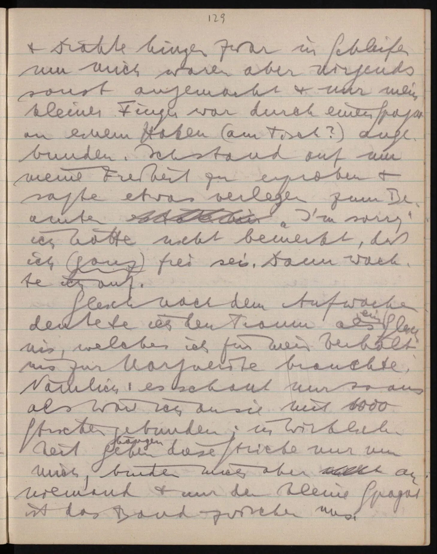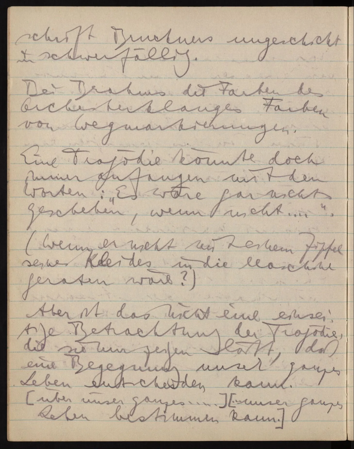 Neulich las ich zufällig in den Buddenbrooks vom Typhus & wie Hanno B. in seiner letzten Krankheit niemand mehr erkannte außer einem Freund. Und da fiel mir auf daß man das gemeinhin als selbstverständlich ansieht & denkt, natürlich, wenn das Gehirn einmal so zerrüttet ist so ist das nur natürlich. Aber in Wirklichkeit ist es zwar nicht das Gewöhnliche daß wir Menschen sehen & sie nicht erkennen aber das was wir „Erkennen” nennen ist nur eine spezielle Fähigkeit die uns sehr wohl abhanden kommen könnte ohne daß wir als minderwertig zu betrachten wären. Ich meine: Es erscheint mir als selbstverständlich daß wir Menschen „erkennen” & als totale Zerrüttung wenn jemand sie nicht erkennt. Aber es kann dieser Stein sehr wohl in dem Gebäude fehlen & von Zerrüttung nicht die Rede sein. (Dieser Gedanke ist wieder mit den Freud’schen nahe verwandt, mit dem, über die Fehlleistungen.)