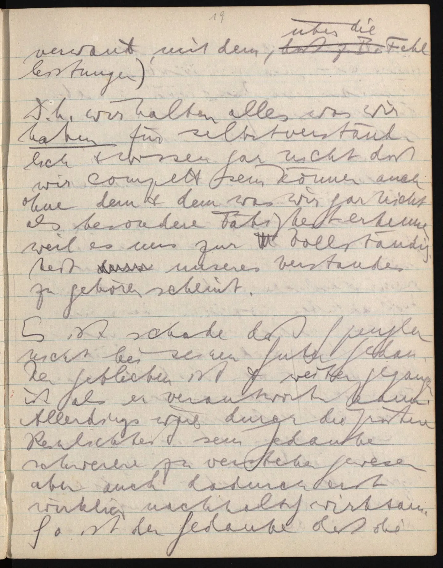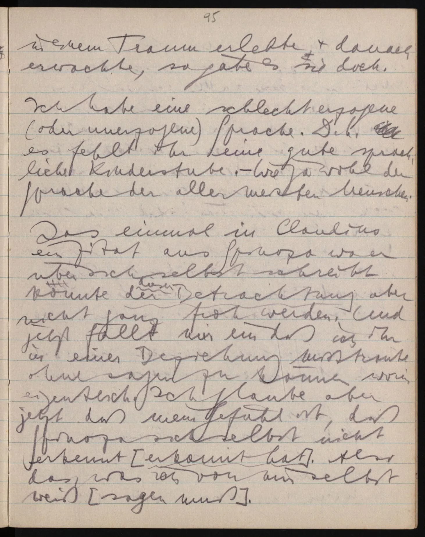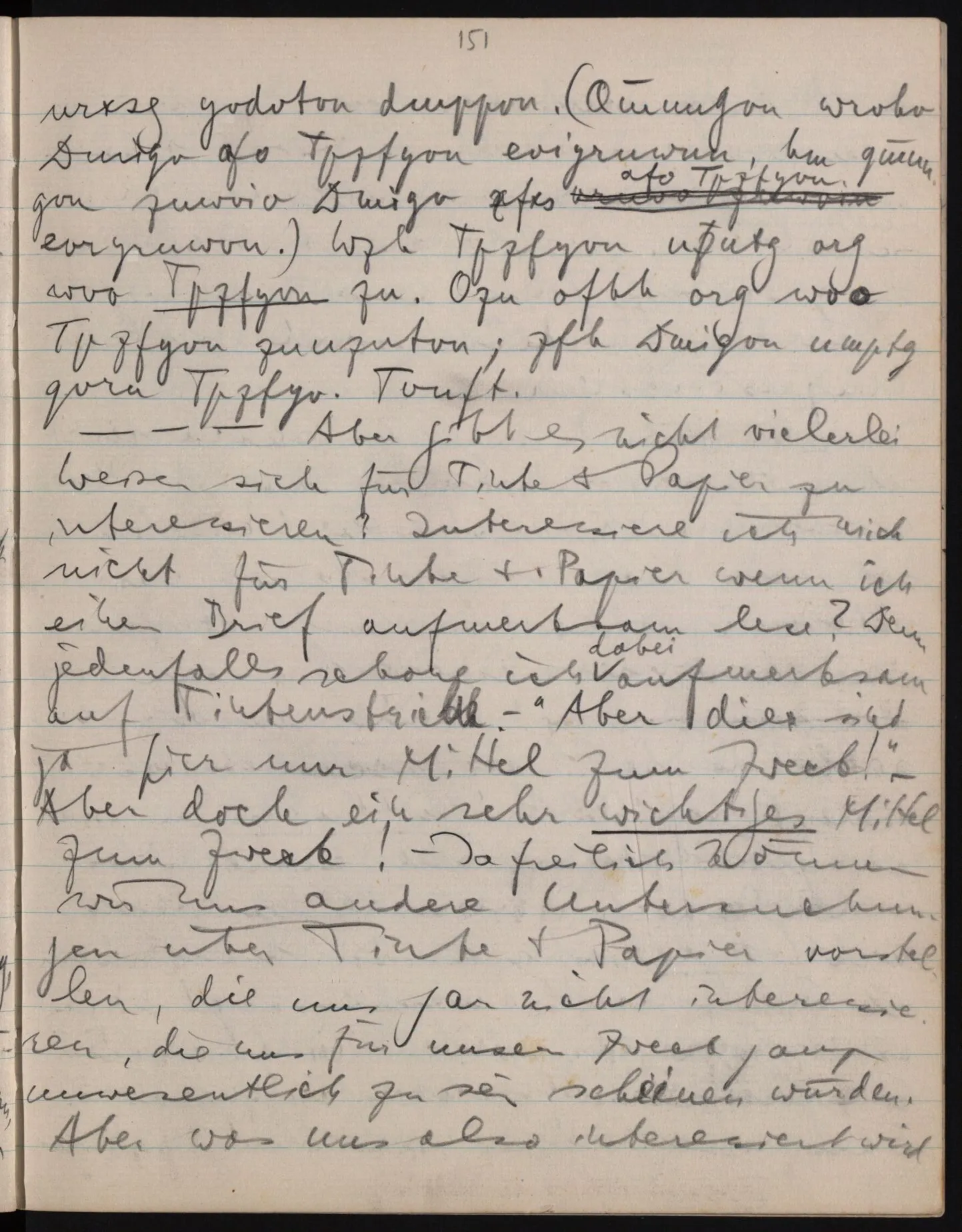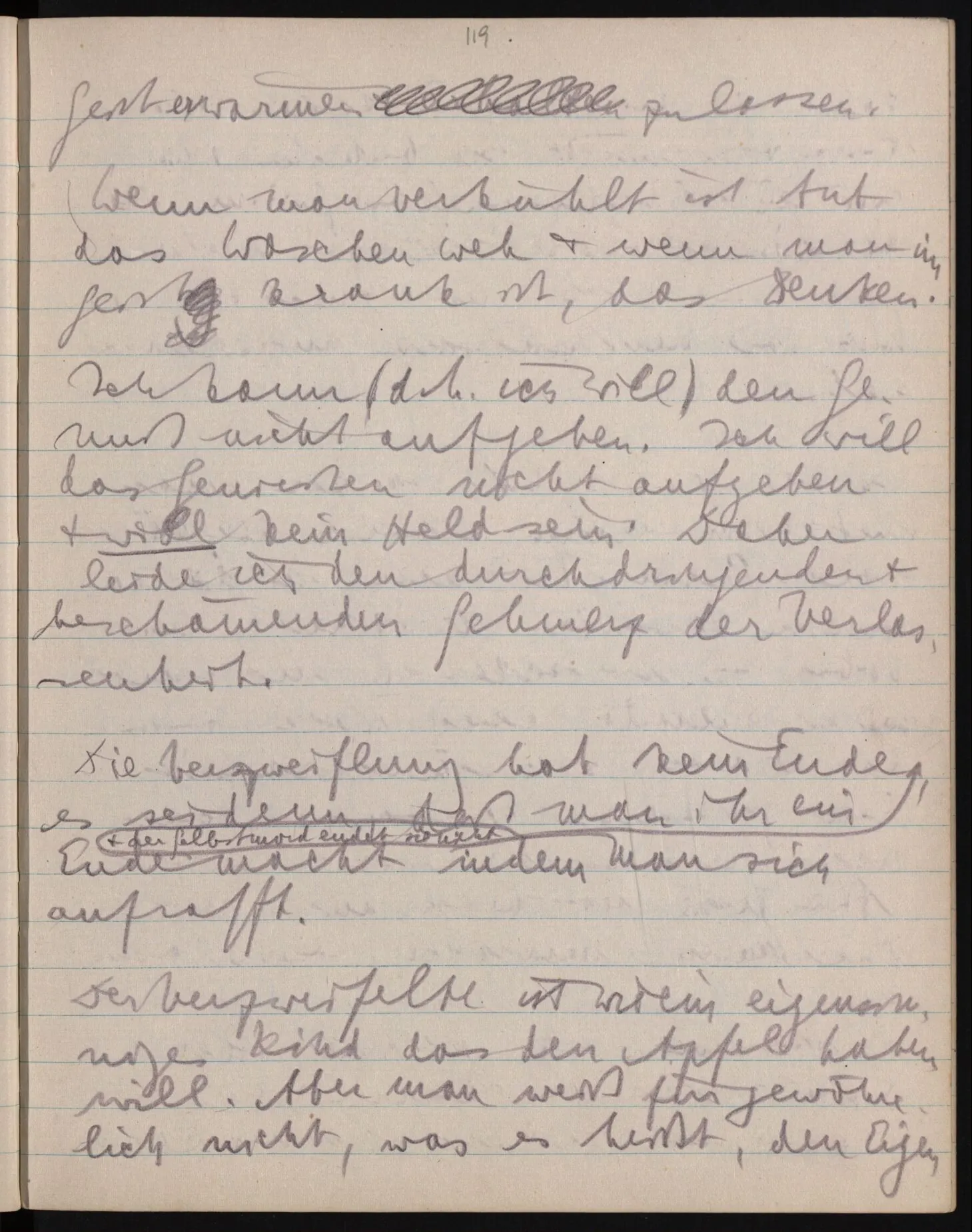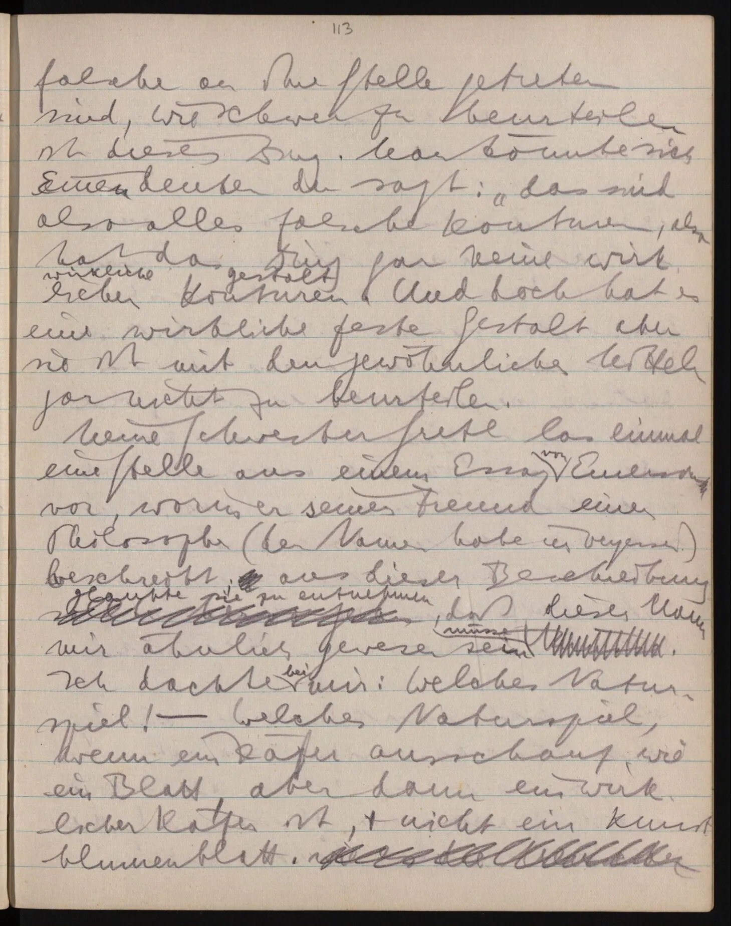Neulich las ich zufällig in den Buddenbrooks vom Typhus & wie Hanno B. in seiner letzten Krankheit niemand mehr erkannte außer einem Freund. Und da fiel mir auf daß man das gemeinhin als selbstverständlich ansieht & denkt, natürlich, wenn das Gehirn einmal so zerrüttet ist so ist das nur natürlich. Aber in Wirklichkeit ist es zwar nicht das Gewöhnliche daß wir Menschen sehen & sie nicht erkennen aber das was wir „Erkennen” nennen ist nur eine spezielle Fähigkeit die uns sehr wohl abhanden kommen könnte ohne daß wir als minderwertig zu betrachten wären. Ich meine: Es erscheint mir als selbstverständlich daß wir Menschen „erkennen” & als totale Zerrüttung wenn jemand sie nicht erkennt. Aber es kann dieser Stein sehr wohl in dem Gebäude fehlen & von Zerrüttung nicht die Rede sein. (Dieser Gedanke ist wieder mit den Freud’schen nahe verwandt, mit dem, über die Fehlleistungen.)