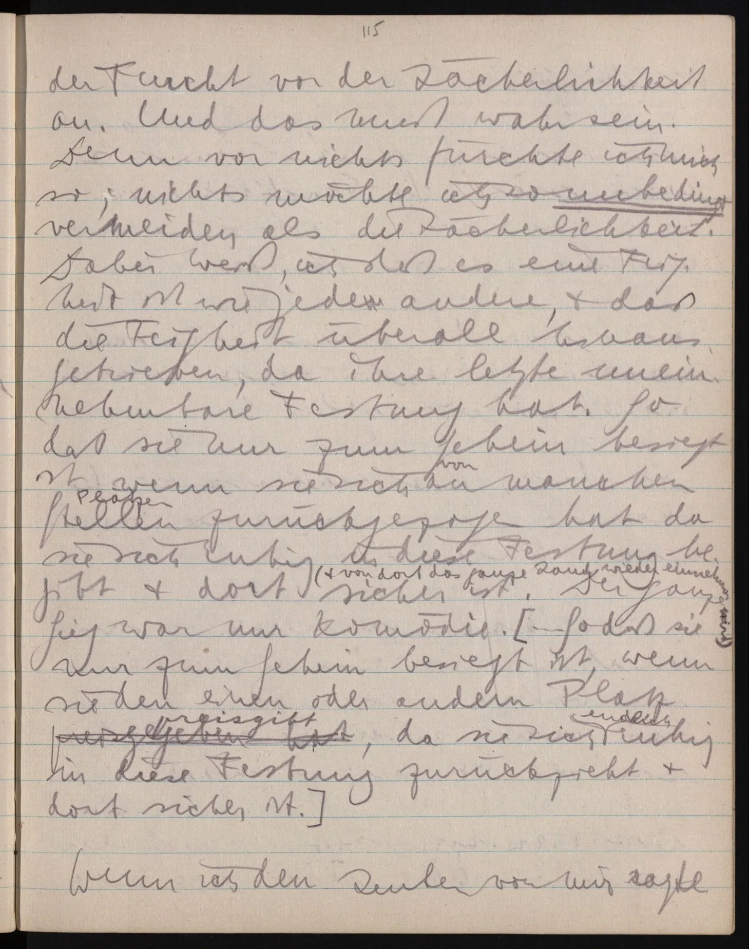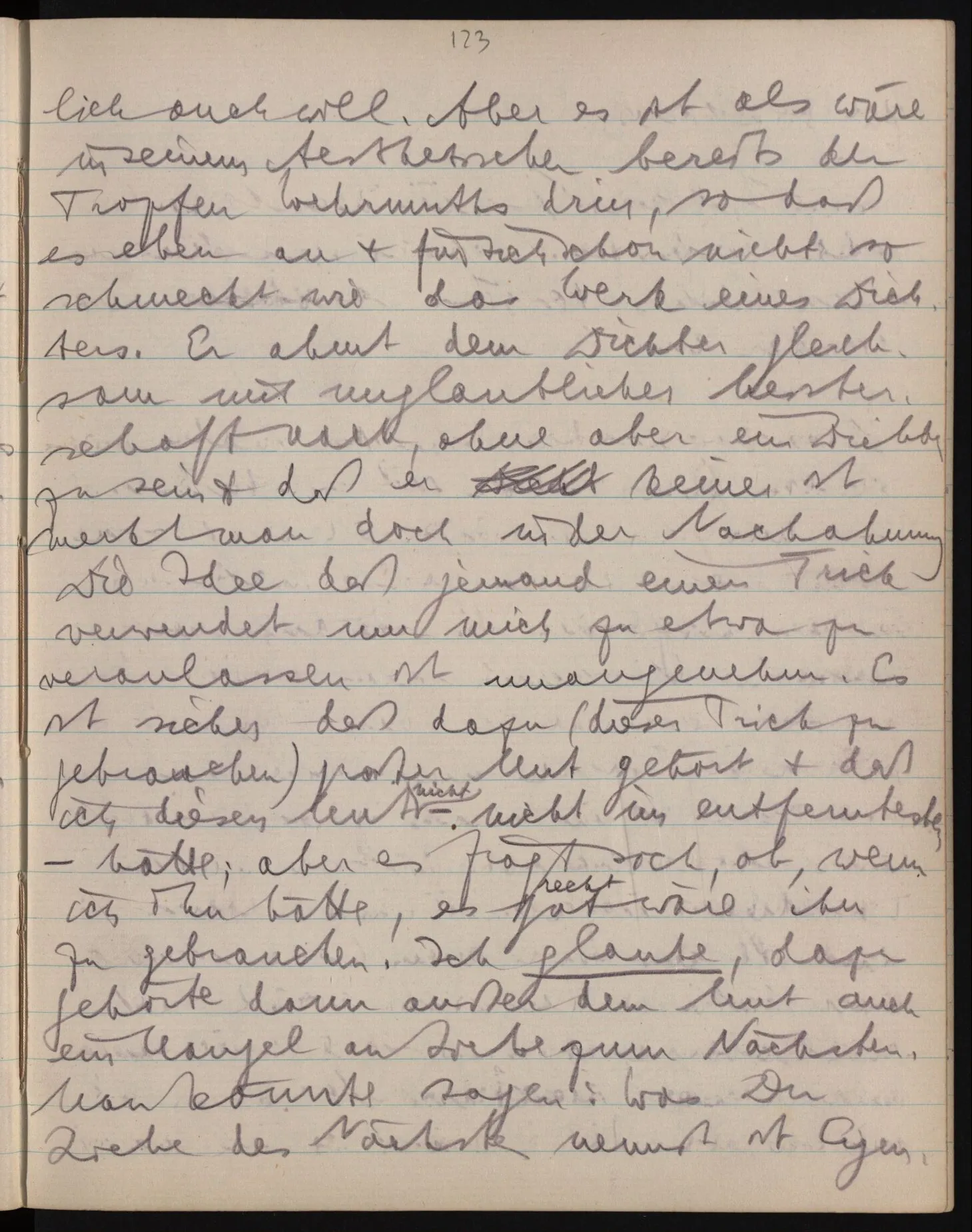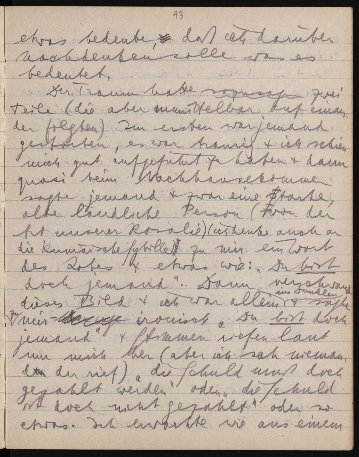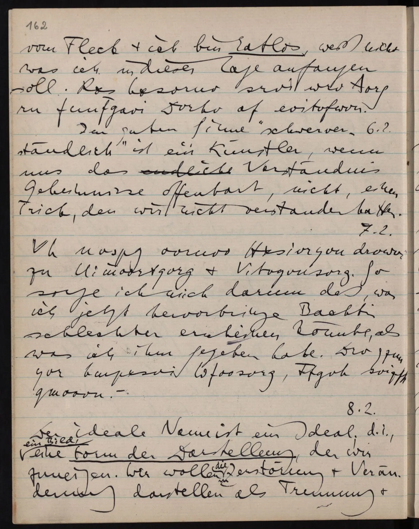 Neulich las ich zufällig in den Buddenbrooks vom Typhus & wie Hanno B. in seiner letzten Krankheit niemand mehr erkannte außer einem Freund. Und da fiel mir auf daß man das gemeinhin als selbstverständlich ansieht & denkt, natürlich, wenn das Gehirn einmal so zerrüttet ist so ist das nur natürlich. Aber in Wirklichkeit ist es zwar nicht das Gewöhnliche daß wir Menschen sehen & sie nicht erkennen aber das was wir „Erkennen” nennen ist nur eine spezielle Fähigkeit die uns sehr wohl abhanden kommen könnte ohne daß wir als minderwertig zu betrachten wären. Ich meine: Es erscheint mir als selbstverständlich daß wir Menschen „erkennen” & als totale Zerrüttung wenn jemand sie nicht erkennt. Aber es kann dieser Stein sehr wohl in dem Gebäude fehlen & von Zerrüttung nicht die Rede sein. (Dieser Gedanke ist wieder mit den Freud’schen nahe verwandt, mit dem, über die Fehlleistungen.)