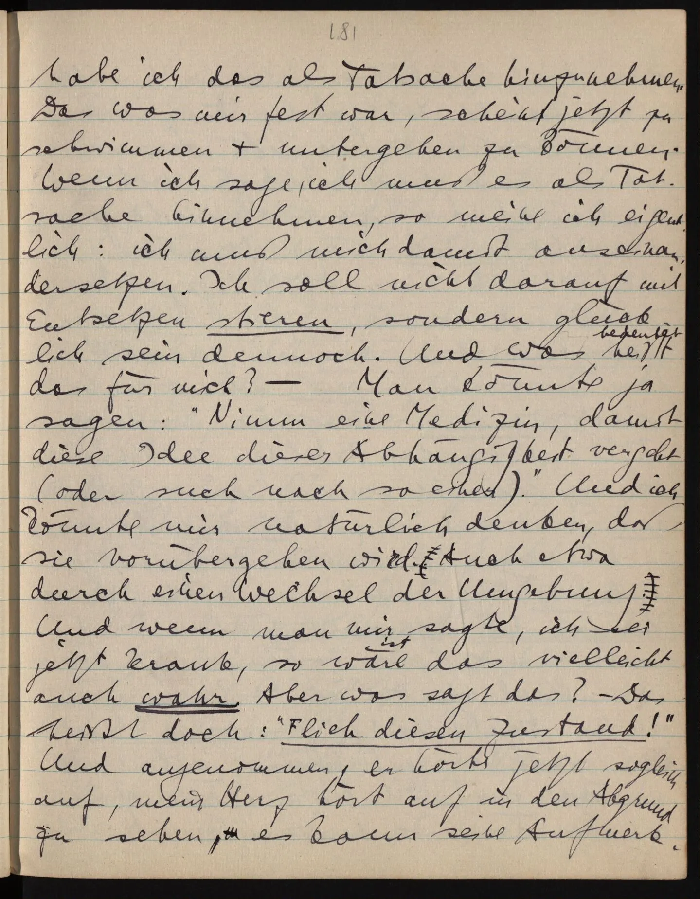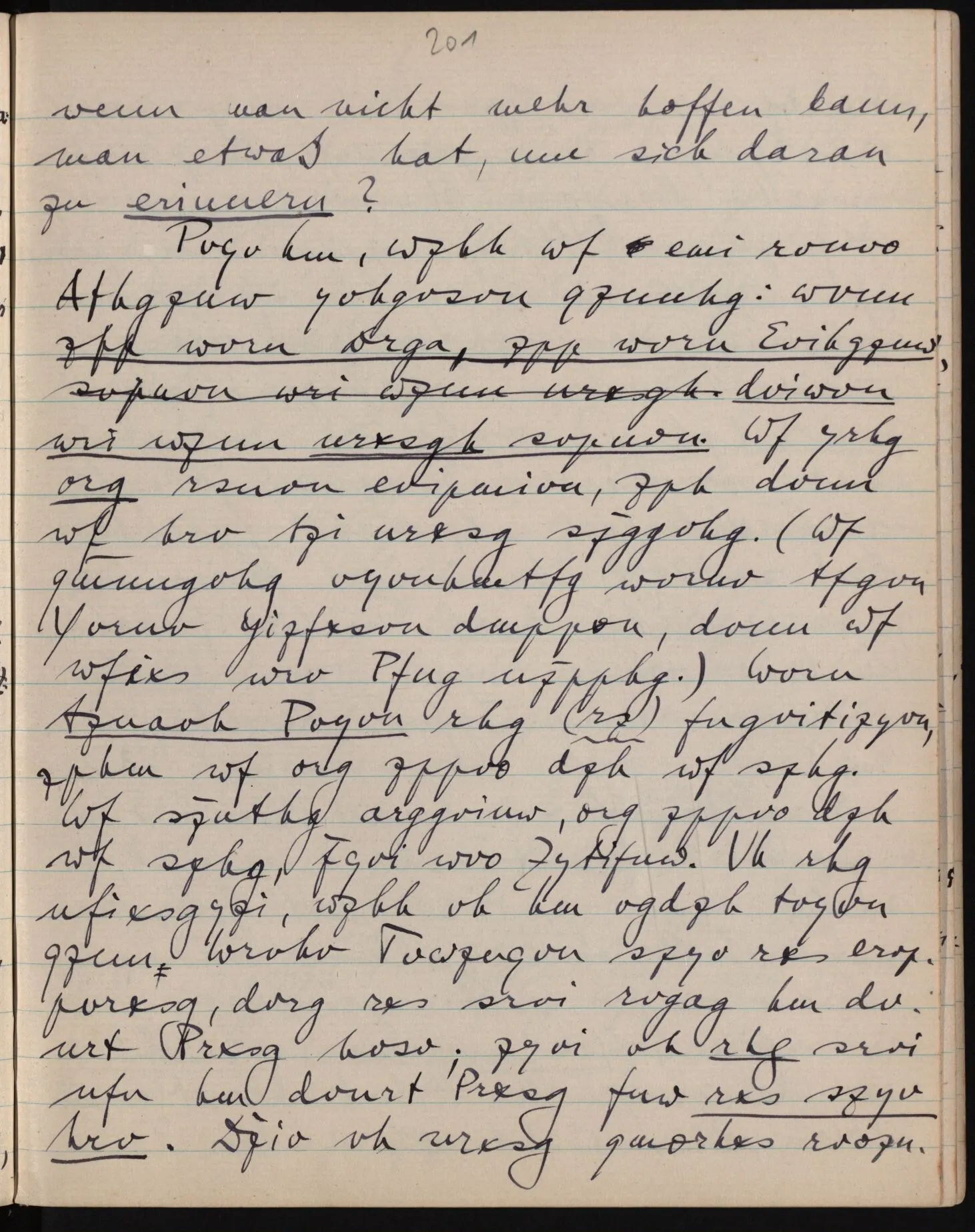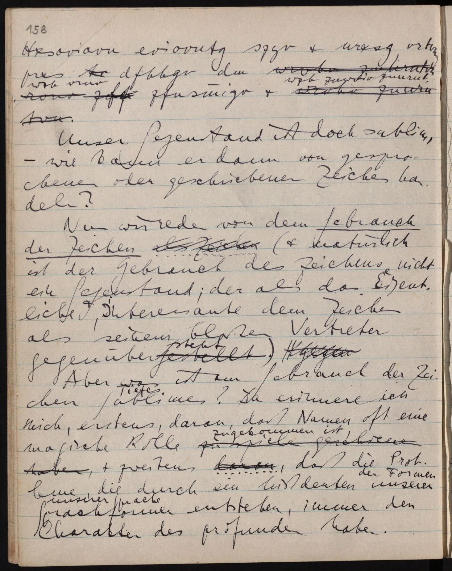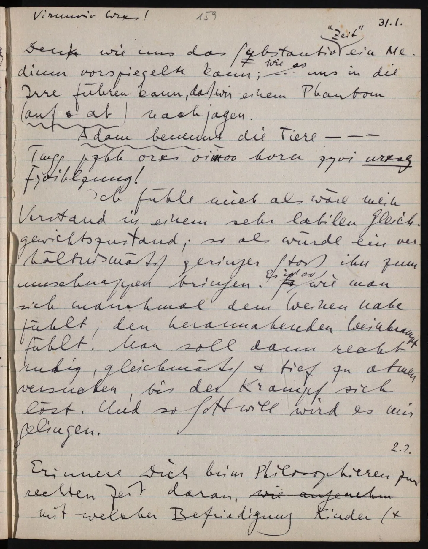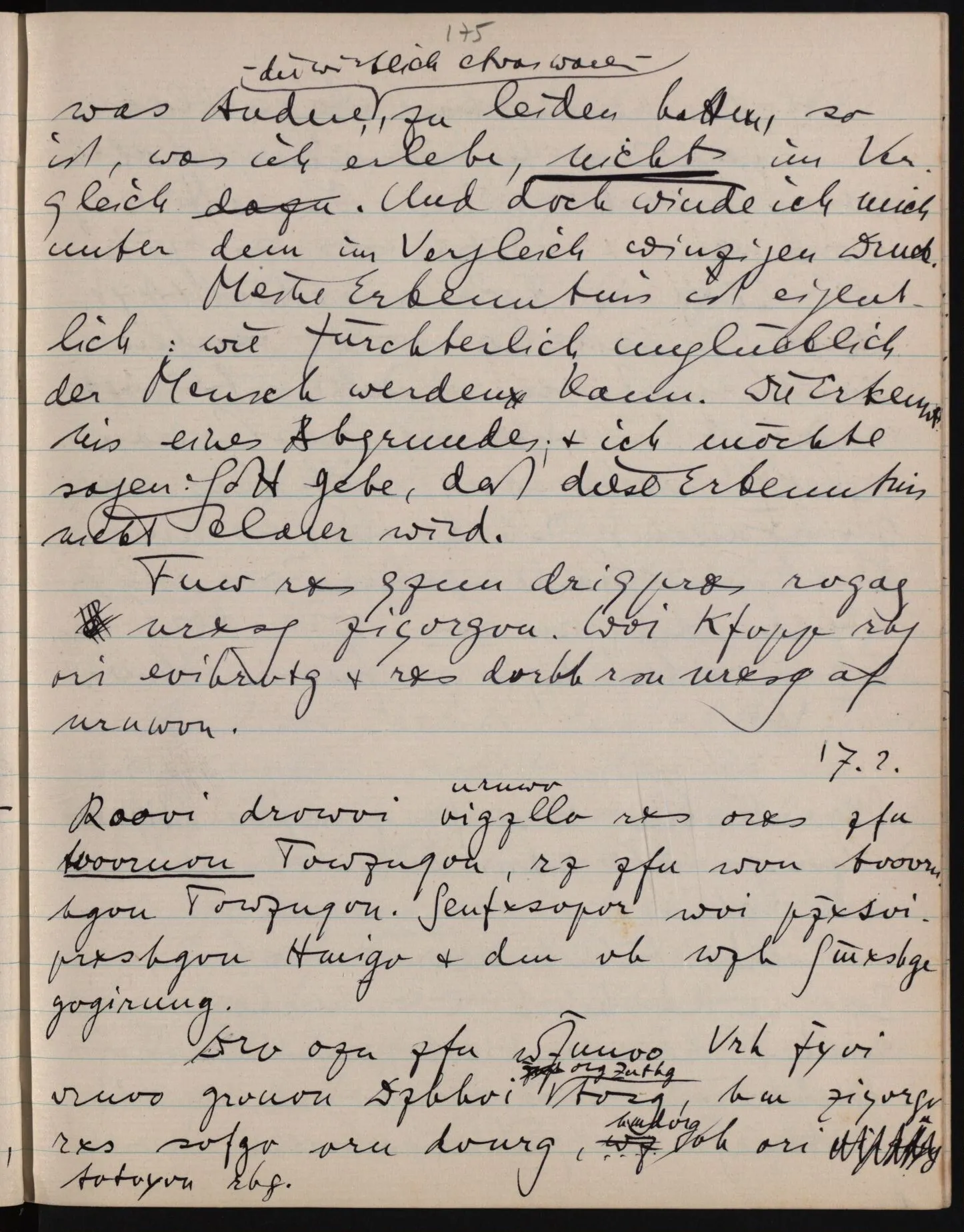 Neulich las ich zufällig in den Buddenbrooks vom Typhus & wie Hanno B. in seiner letzten Krankheit niemand mehr erkannte außer einem Freund. Und da fiel mir auf daß man das gemeinhin als selbstverständlich ansieht & denkt, natürlich, wenn das Gehirn einmal so zerrüttet ist so ist das nur natürlich. Aber in Wirklichkeit ist es zwar nicht das Gewöhnliche daß wir Menschen sehen & sie nicht erkennen aber das was wir „Erkennen” nennen ist nur eine spezielle Fähigkeit die uns sehr wohl abhanden kommen könnte ohne daß wir als minderwertig zu betrachten wären. Ich meine: Es erscheint mir als selbstverständlich daß wir Menschen „erkennen” & als totale Zerrüttung wenn jemand sie nicht erkennt. Aber es kann dieser Stein sehr wohl in dem Gebäude fehlen & von Zerrüttung nicht die Rede sein. (Dieser Gedanke ist wieder mit den Freud’schen nahe verwandt, mit dem, über die Fehlleistungen.)