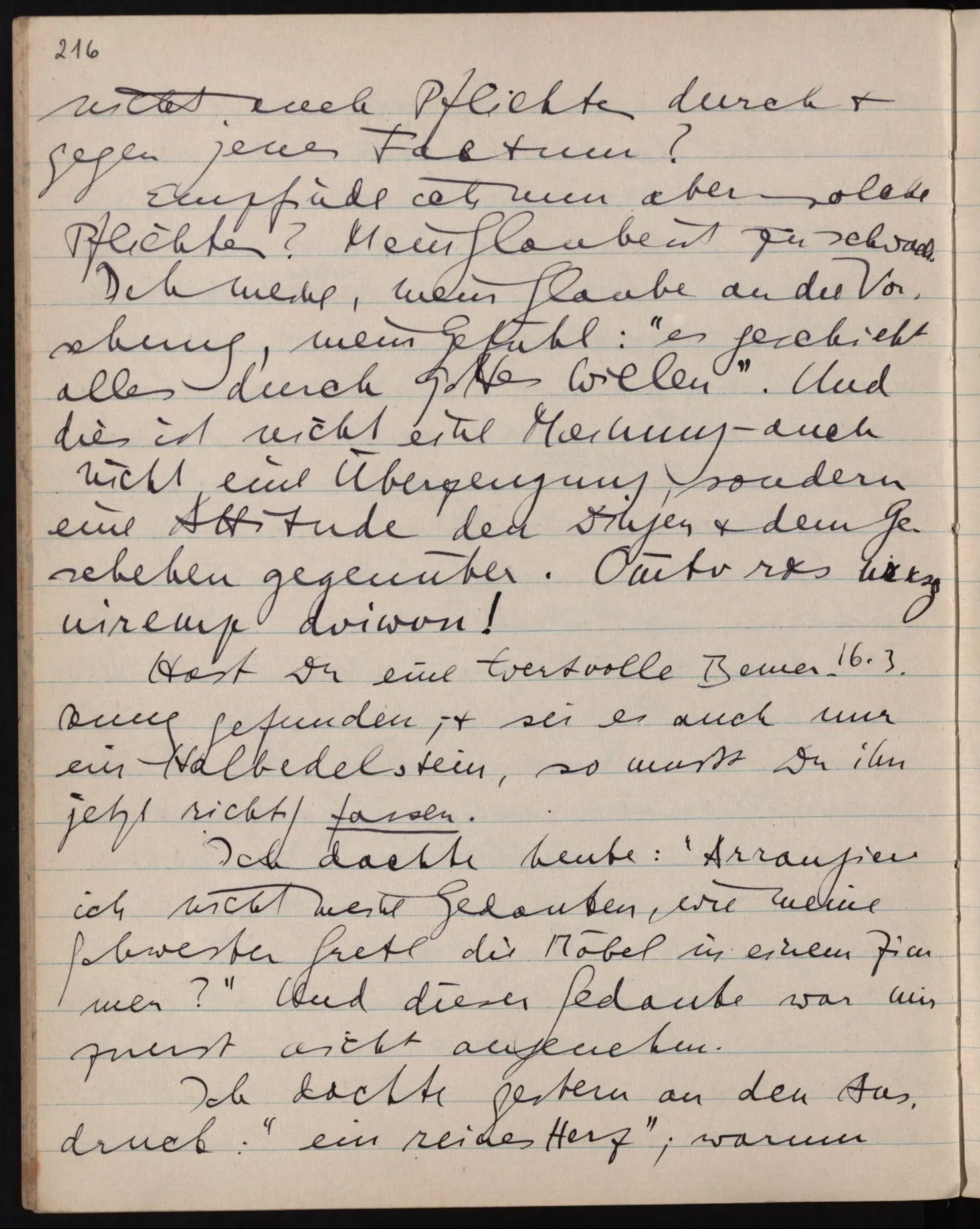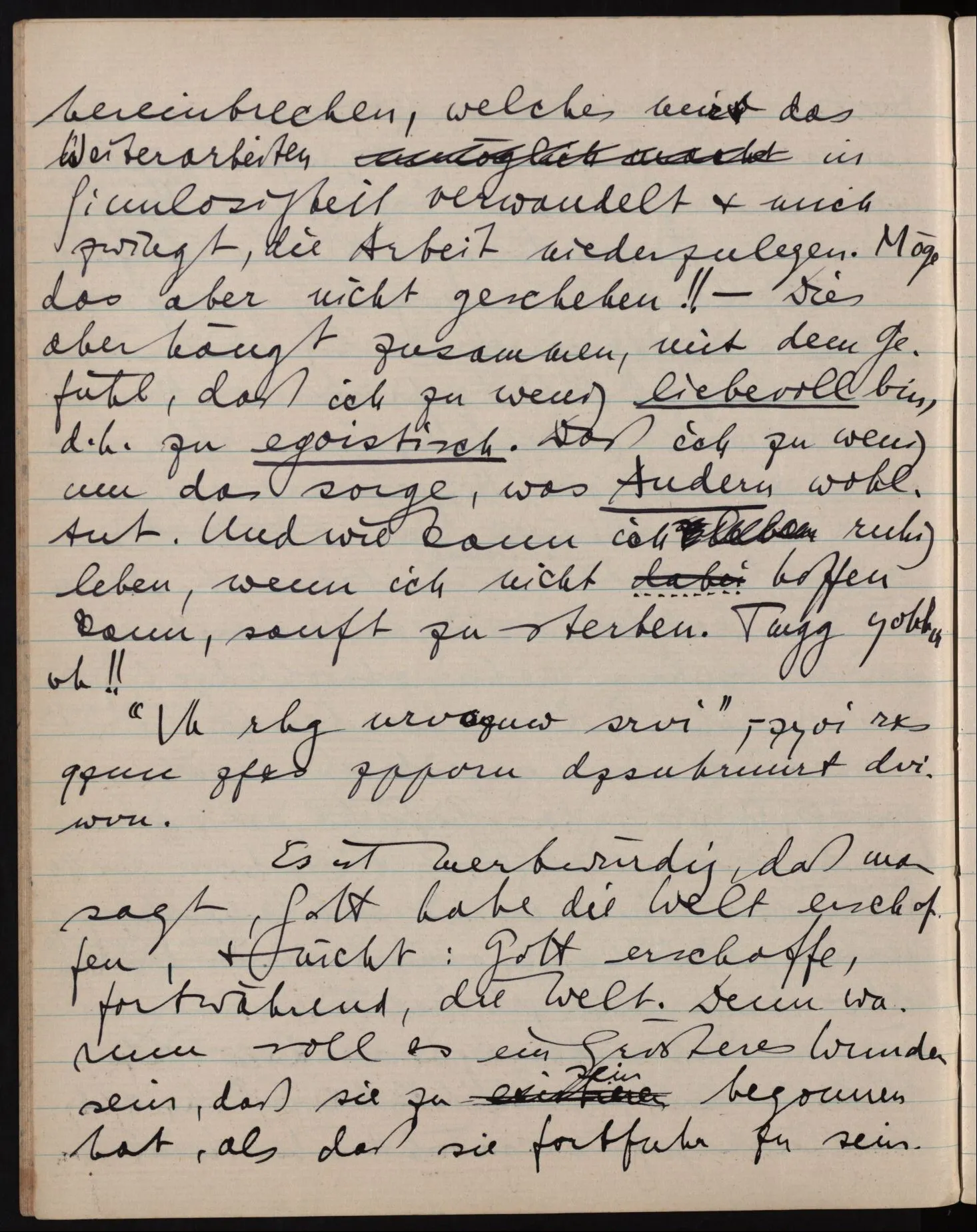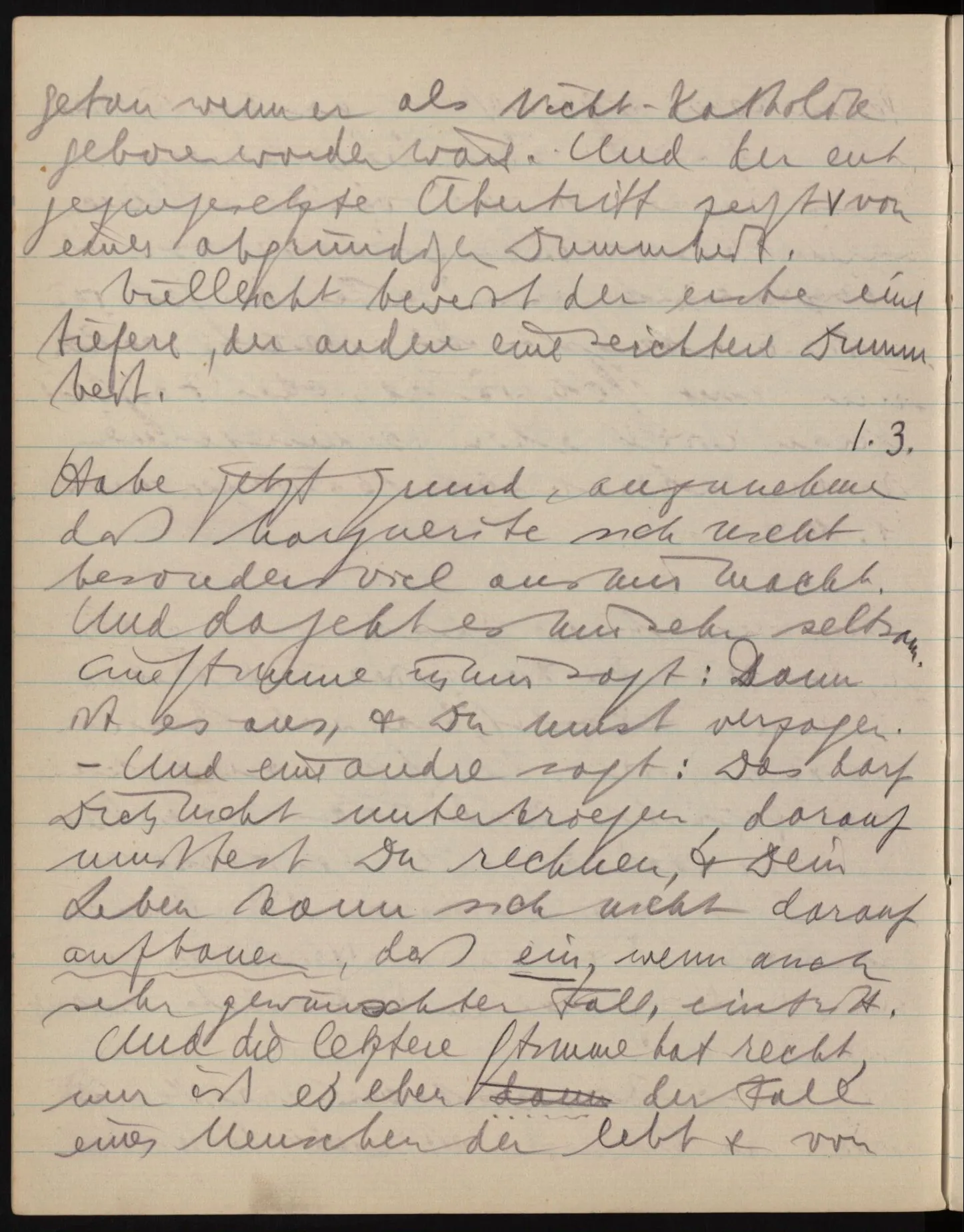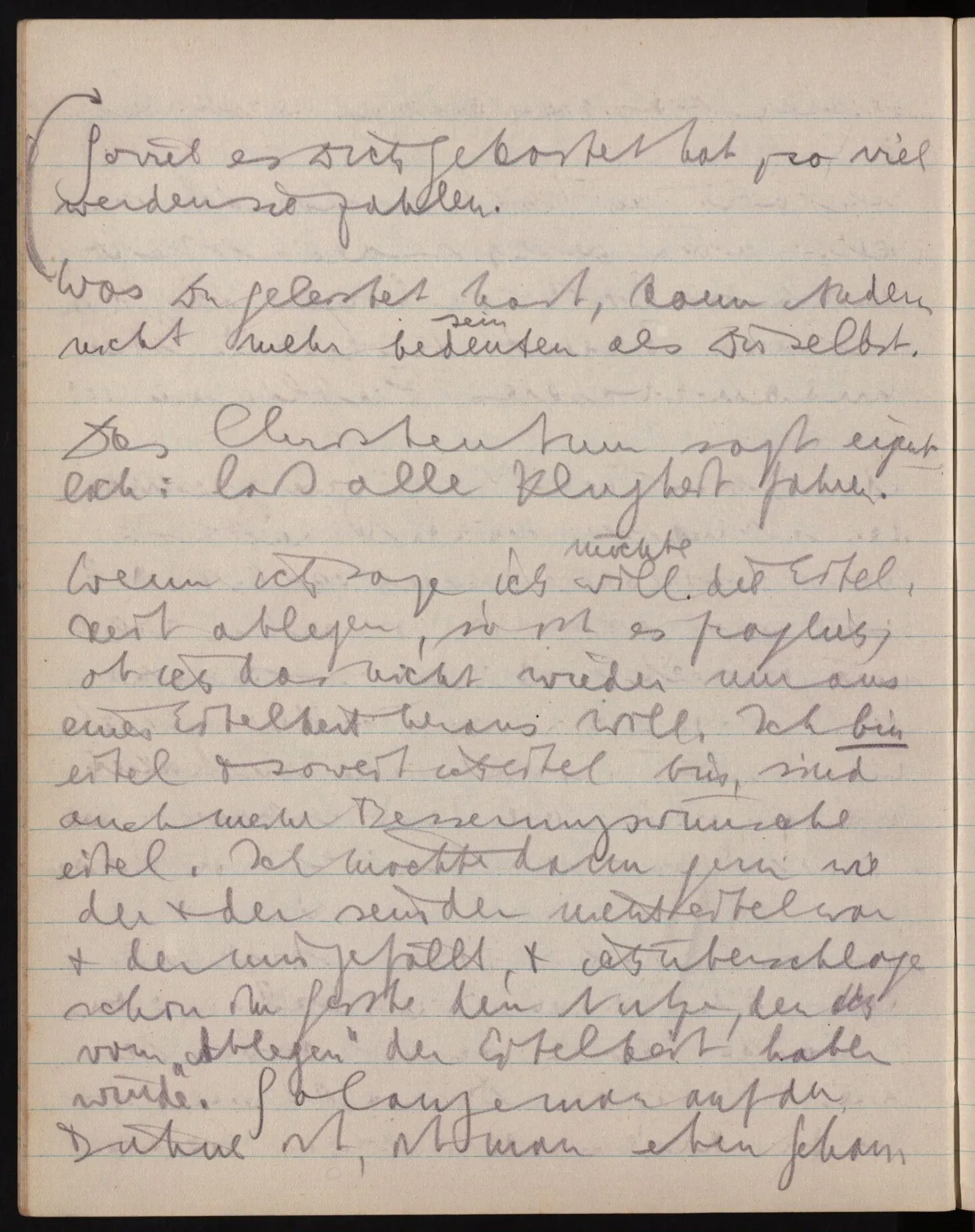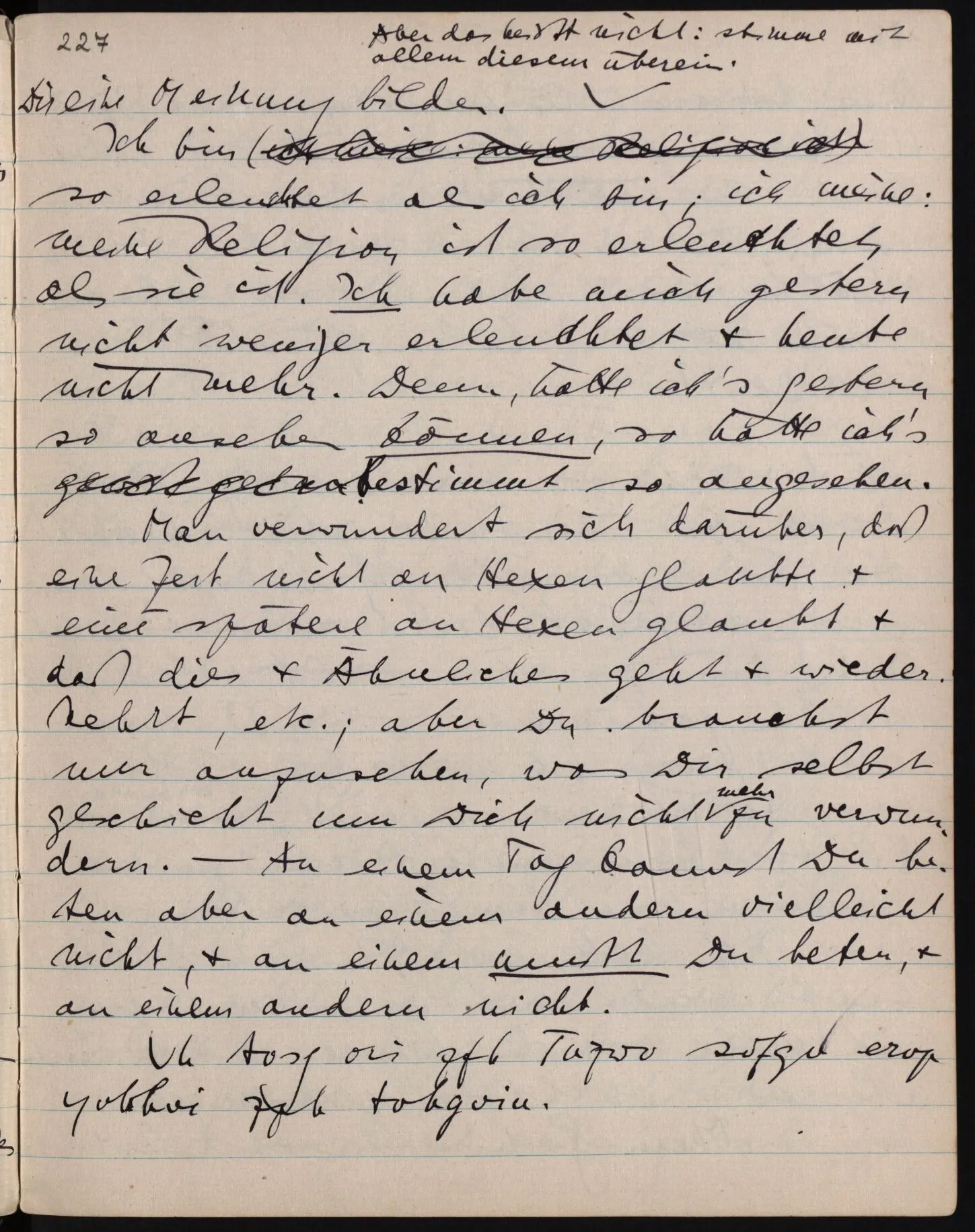 26.03.1937 Kritisiere nicht, was Ernste Ernstes geschrieben haben, denn Du weißt nicht, was Du kritisierst. Warum sollst Du über Alles Dir eine Meinung bilden. Aber das heißt nicht: stimme mit allem diesem überein. Ich bin so erleuchtet als ich bin; ich meine: meine Religion ist so erleuchtet, als sie ist. Ich habe mich gestern nicht weniger erleuchtet & heute nicht mehr. Denn, hätte ich’s gestern so ansehen können, so hätte ich’s bestimmt so angesehen. Man verwundert sich darüber, daß eine Zeit nicht an Hexen glaubte & eine spätere an Hexen glaubt & daß dies & Ähnliches geht & wiederkehrt, etc.; aber Du brauchst nur anzusehen, was Dir selbst geschieht um Dich nicht mehr zu verwundern. – An einem Tag kannst Du beten aber an einem andern vielleicht nicht, & an einem mußt Du beten, & an einem andern nicht. Es geht mir aus Gnade heute viel besser als gestern.