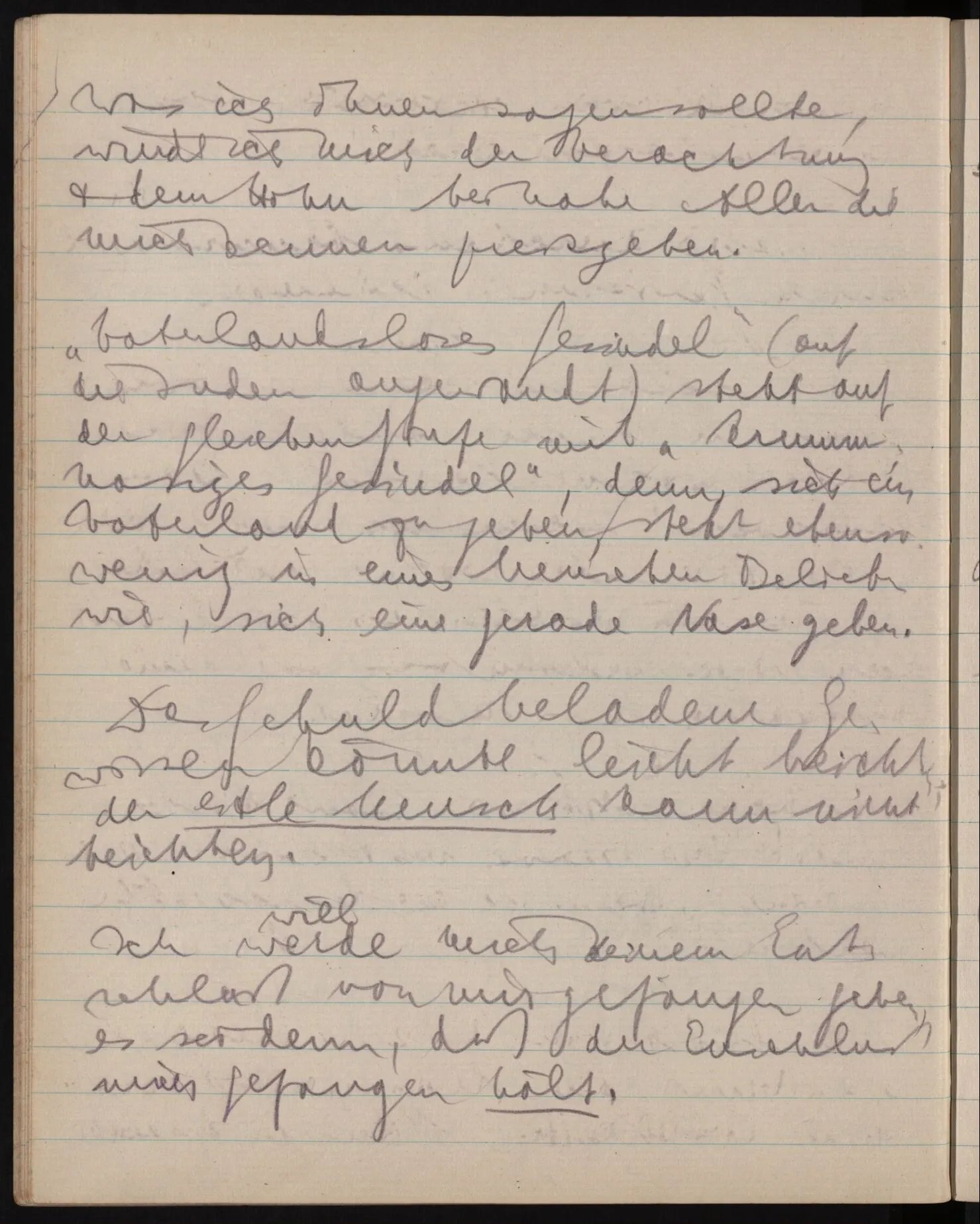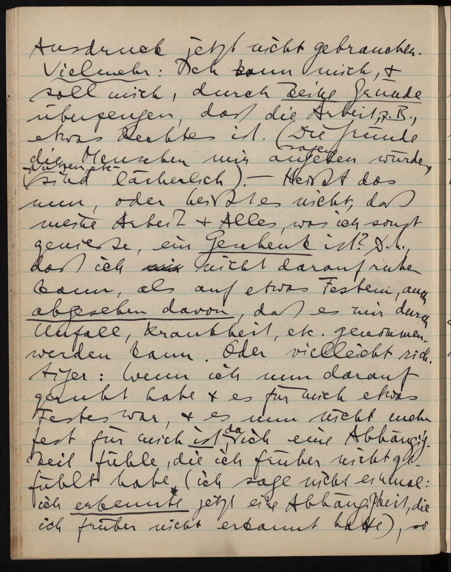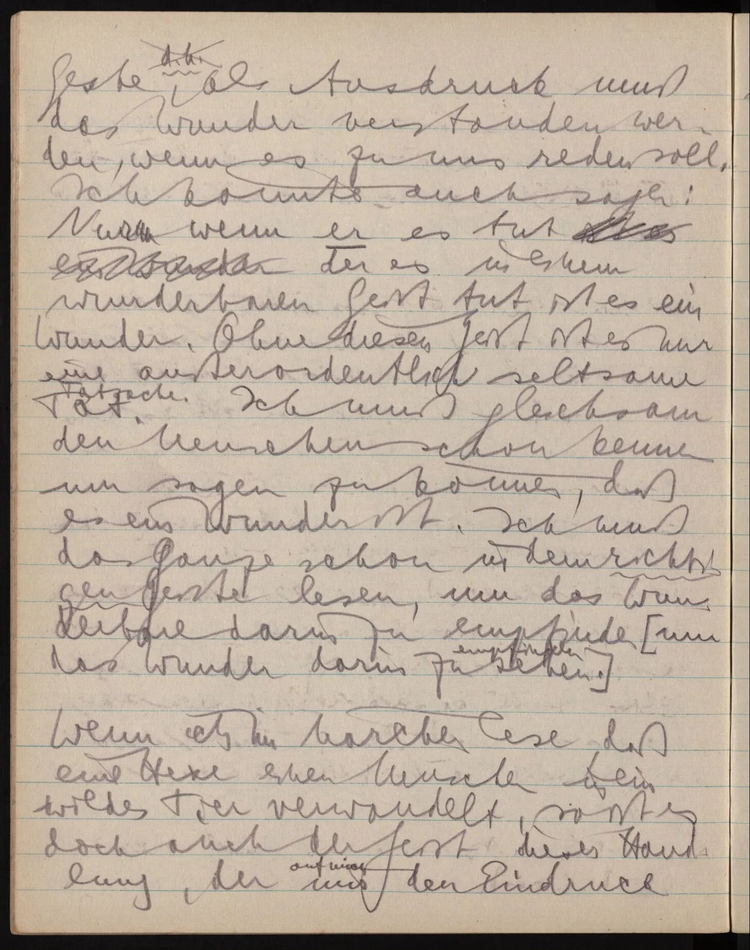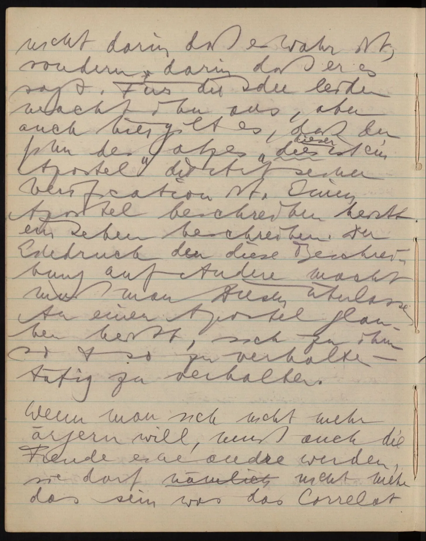 26.03.1937 Kritisiere nicht, was Ernste Ernstes geschrieben haben, denn Du weißt nicht, was Du kritisierst. Warum sollst Du über Alles Dir eine Meinung bilden. Aber das heißt nicht: stimme mit allem diesem überein. Ich bin so erleuchtet als ich bin; ich meine: meine Religion ist so erleuchtet, als sie ist. Ich habe mich gestern nicht weniger erleuchtet & heute nicht mehr. Denn, hätte ich’s gestern so ansehen können, so hätte ich’s bestimmt so angesehen. Man verwundert sich darüber, daß eine Zeit nicht an Hexen glaubte & eine spätere an Hexen glaubt & daß dies & Ähnliches geht & wiederkehrt, etc.; aber Du brauchst nur anzusehen, was Dir selbst geschieht um Dich nicht mehr zu verwundern. – An einem Tag kannst Du beten aber an einem andern vielleicht nicht, & an einem mußt Du beten, & an einem andern nicht. Es geht mir aus Gnade heute viel besser als gestern.