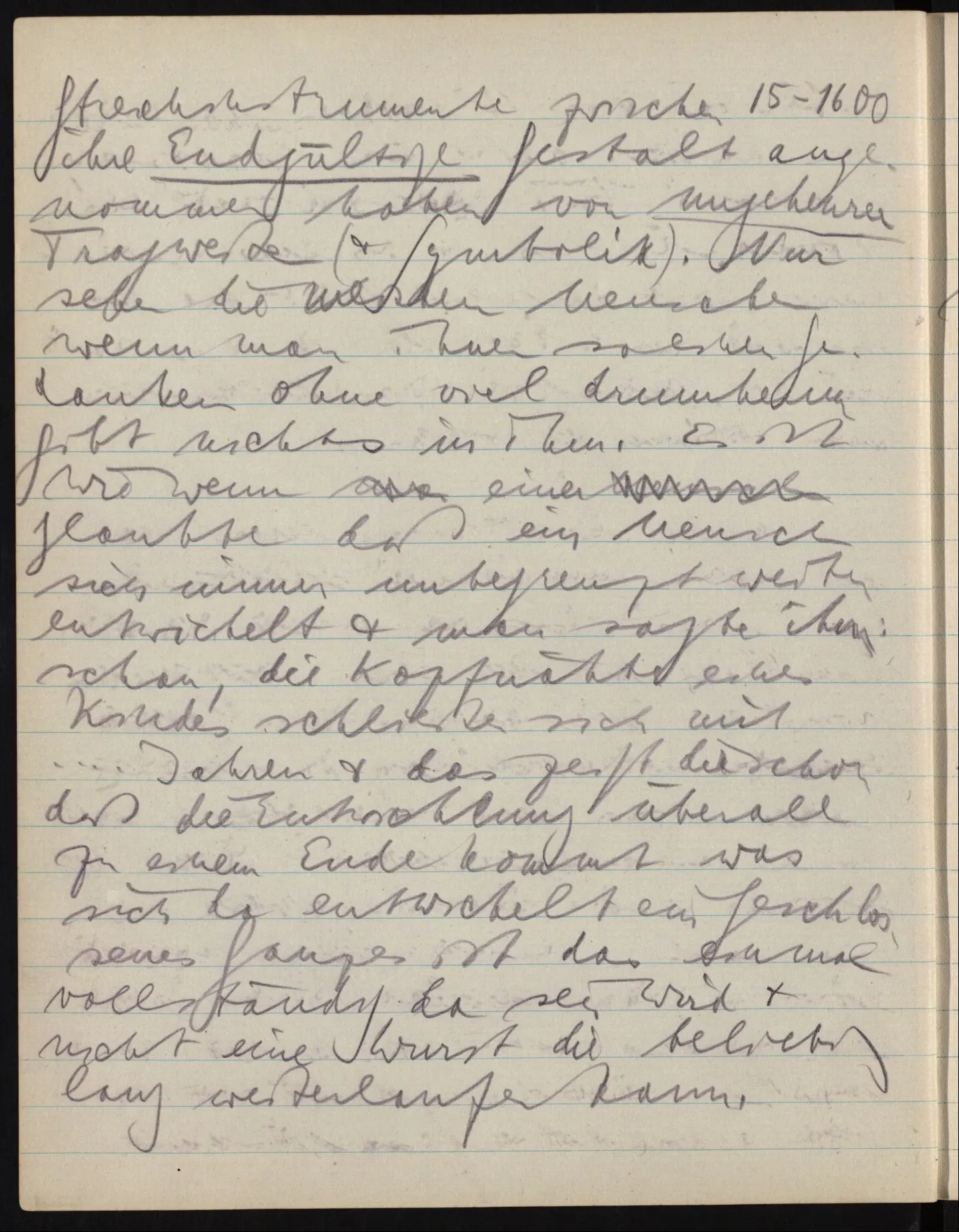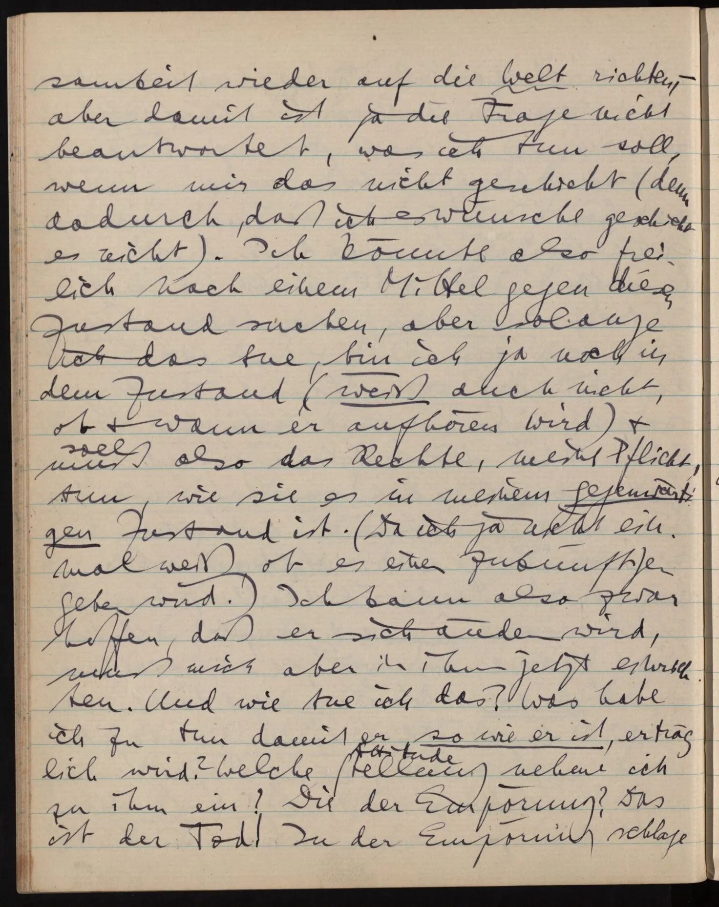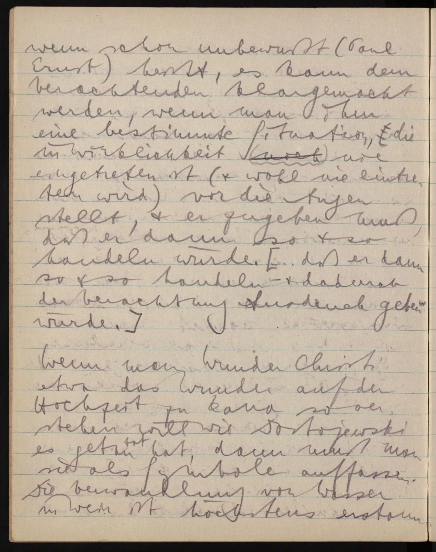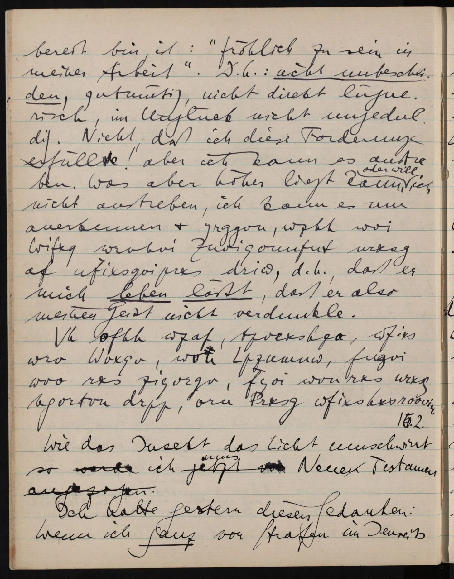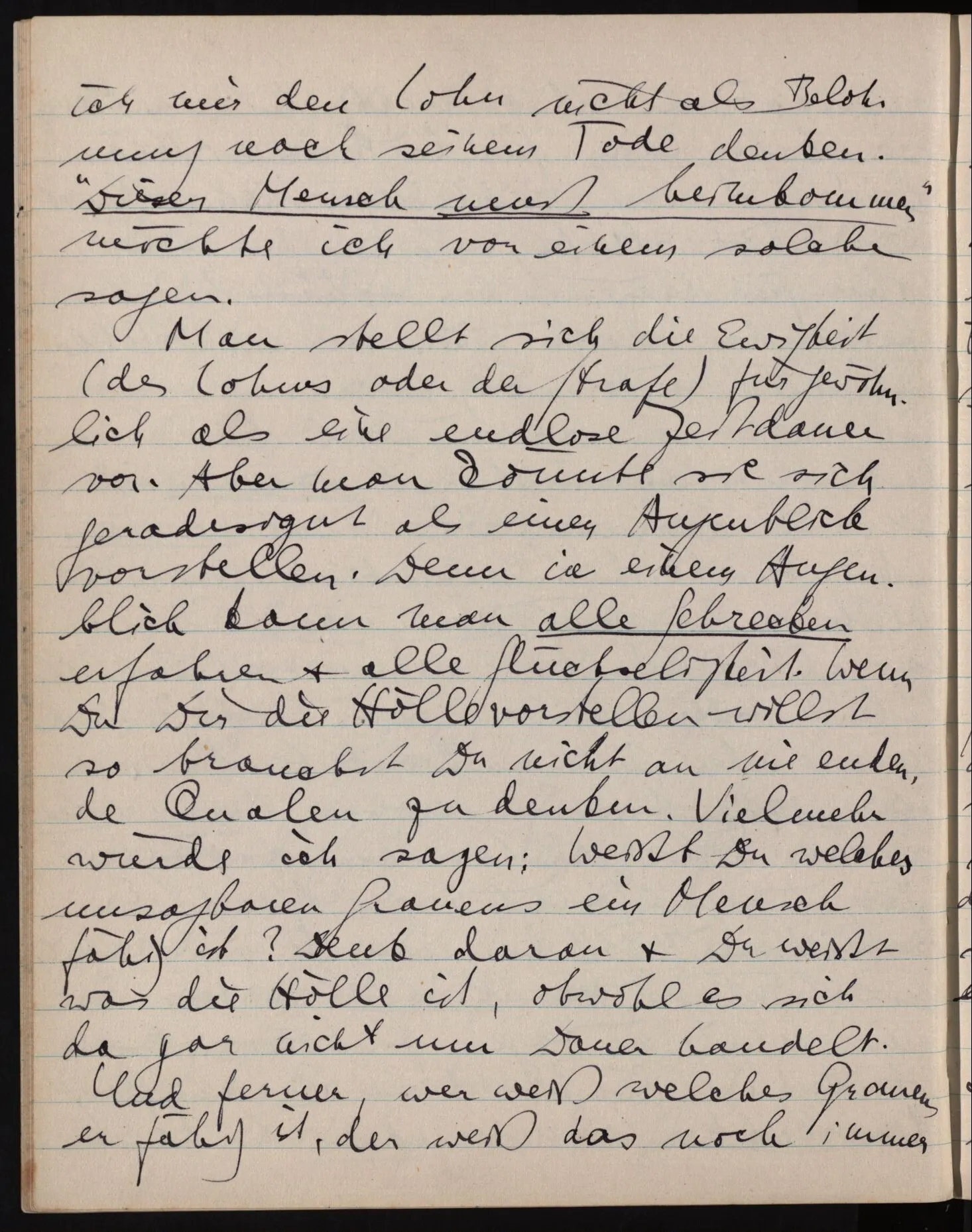 26.03.1937 Kritisiere nicht, was Ernste Ernstes geschrieben haben, denn Du weißt nicht, was Du kritisierst. Warum sollst Du über Alles Dir eine Meinung bilden. Aber das heißt nicht: stimme mit allem diesem überein. Ich bin so erleuchtet als ich bin; ich meine: meine Religion ist so erleuchtet, als sie ist. Ich habe mich gestern nicht weniger erleuchtet & heute nicht mehr. Denn, hätte ich’s gestern so ansehen können, so hätte ich’s bestimmt so angesehen. Man verwundert sich darüber, daß eine Zeit nicht an Hexen glaubte & eine spätere an Hexen glaubt & daß dies & Ähnliches geht & wiederkehrt, etc.; aber Du brauchst nur anzusehen, was Dir selbst geschieht um Dich nicht mehr zu verwundern. – An einem Tag kannst Du beten aber an einem andern vielleicht nicht, & an einem mußt Du beten, & an einem andern nicht. Es geht mir aus Gnade heute viel besser als gestern.