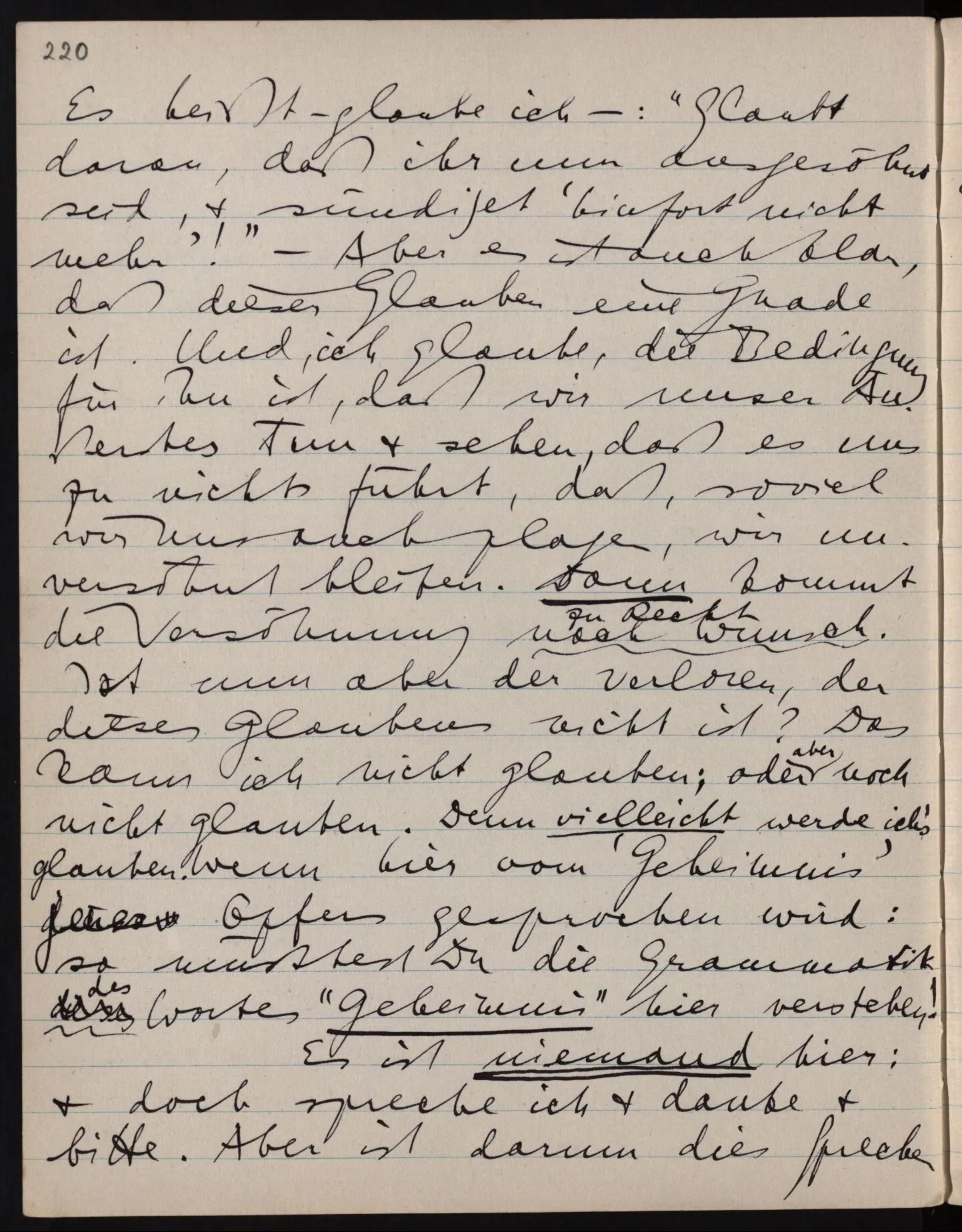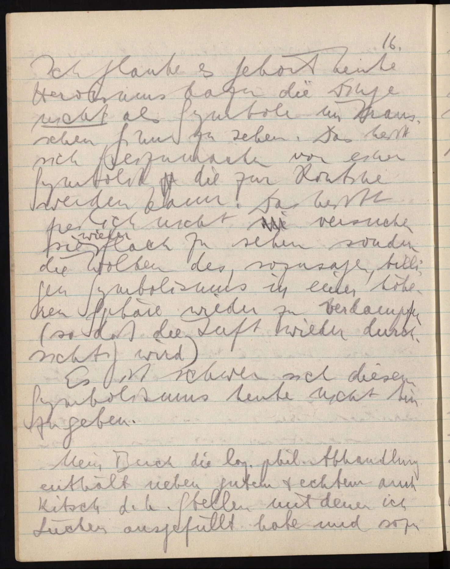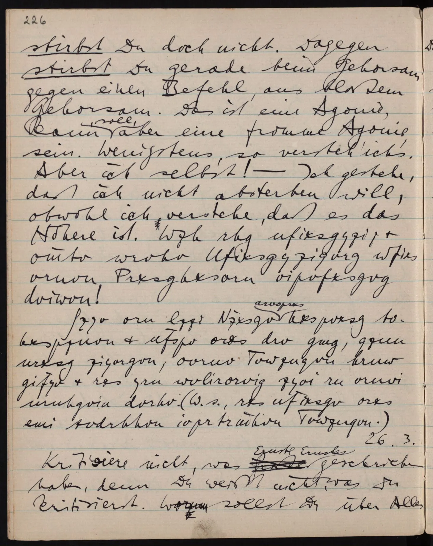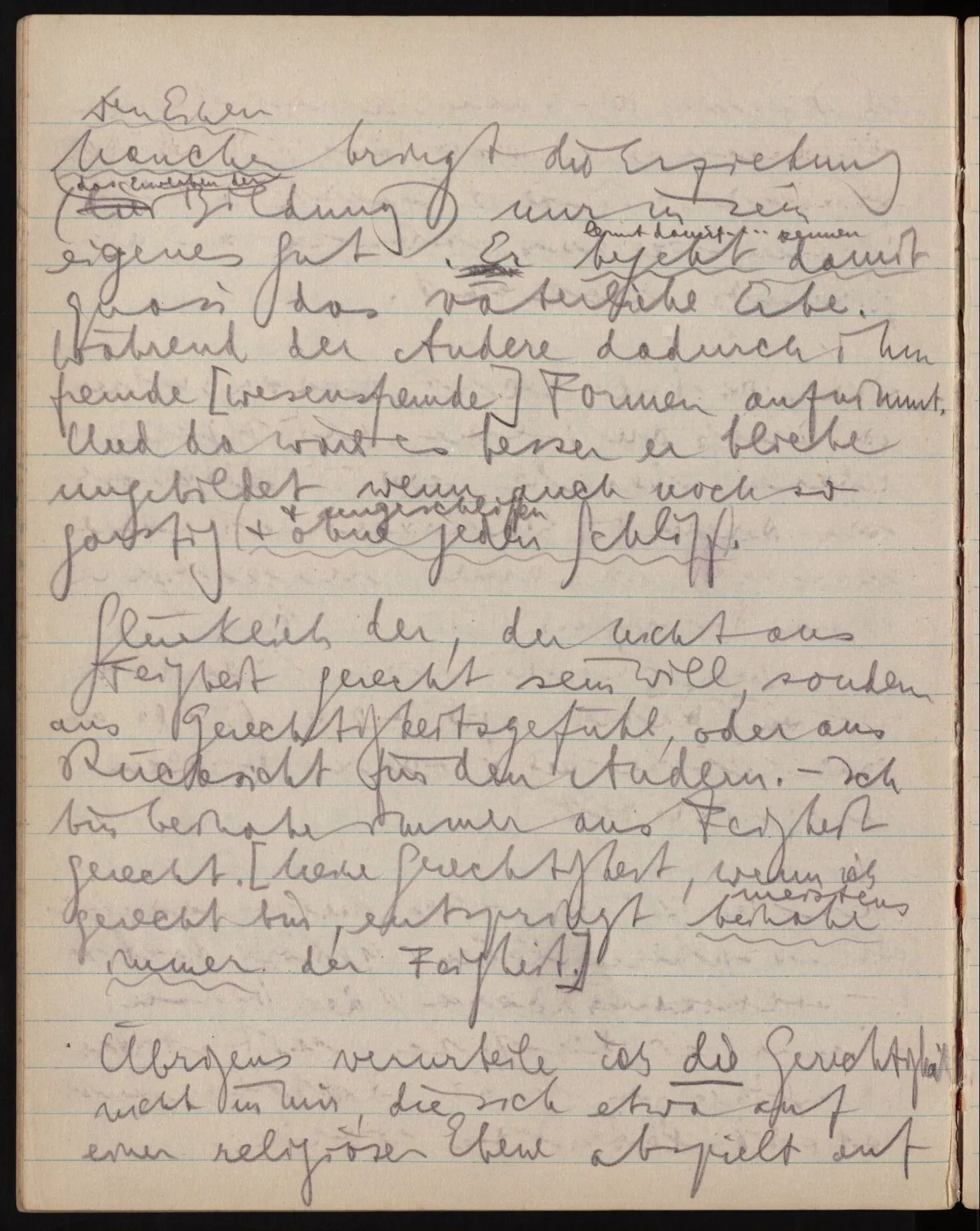 26.03.1937 Kritisiere nicht, was Ernste Ernstes geschrieben haben, denn Du weißt nicht, was Du kritisierst. Warum sollst Du über Alles Dir eine Meinung bilden. Aber das heißt nicht: stimme mit allem diesem überein. Ich bin so erleuchtet als ich bin; ich meine: meine Religion ist so erleuchtet, als sie ist. Ich habe mich gestern nicht weniger erleuchtet & heute nicht mehr. Denn, hätte ich’s gestern so ansehen können, so hätte ich’s bestimmt so angesehen. Man verwundert sich darüber, daß eine Zeit nicht an Hexen glaubte & eine spätere an Hexen glaubt & daß dies & Ähnliches geht & wiederkehrt, etc.; aber Du brauchst nur anzusehen, was Dir selbst geschieht um Dich nicht mehr zu verwundern. – An einem Tag kannst Du beten aber an einem andern vielleicht nicht, & an einem mußt Du beten, & an einem andern nicht. Es geht mir aus Gnade heute viel besser als gestern.