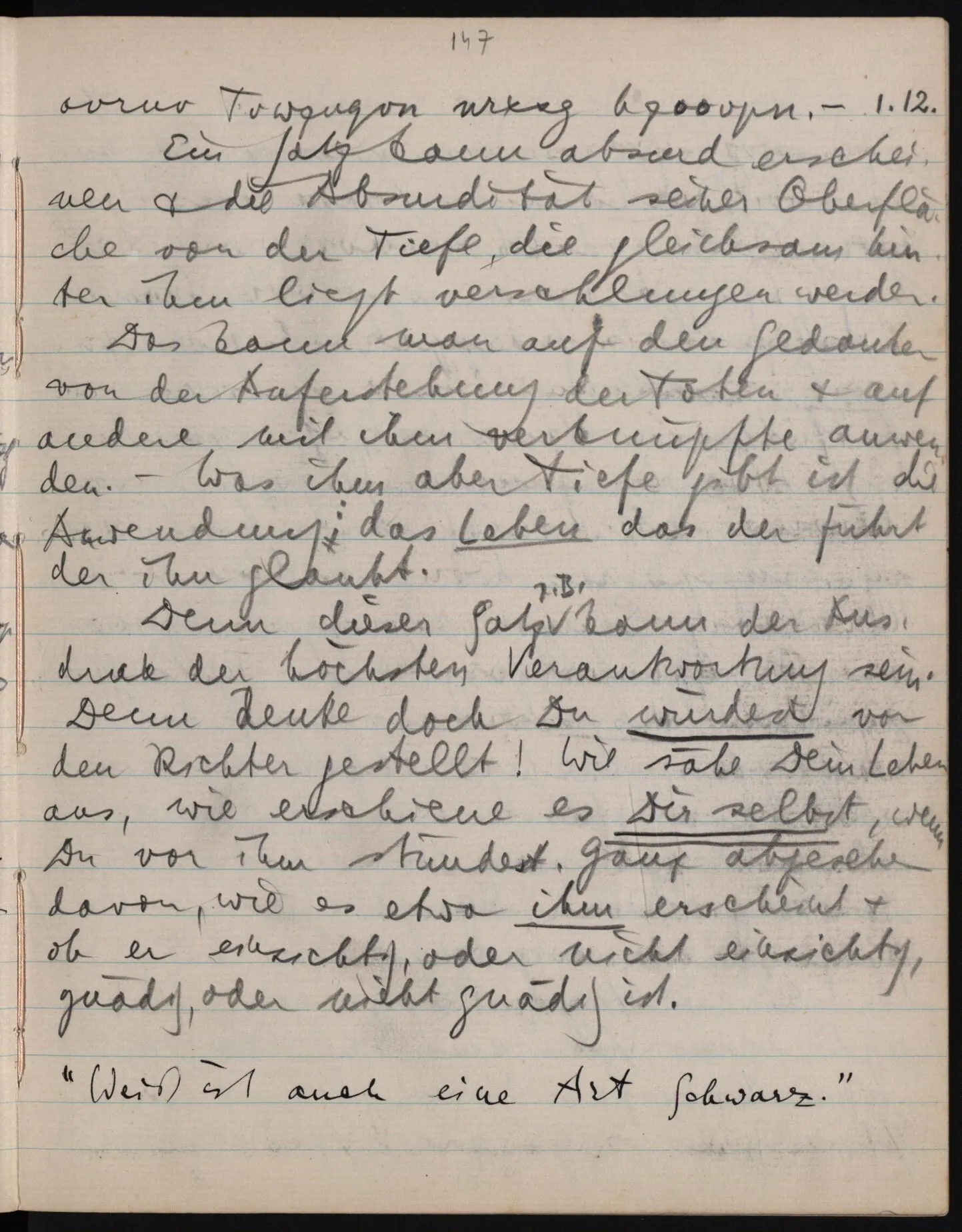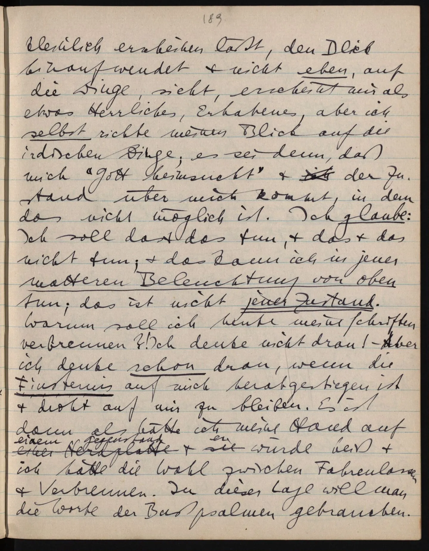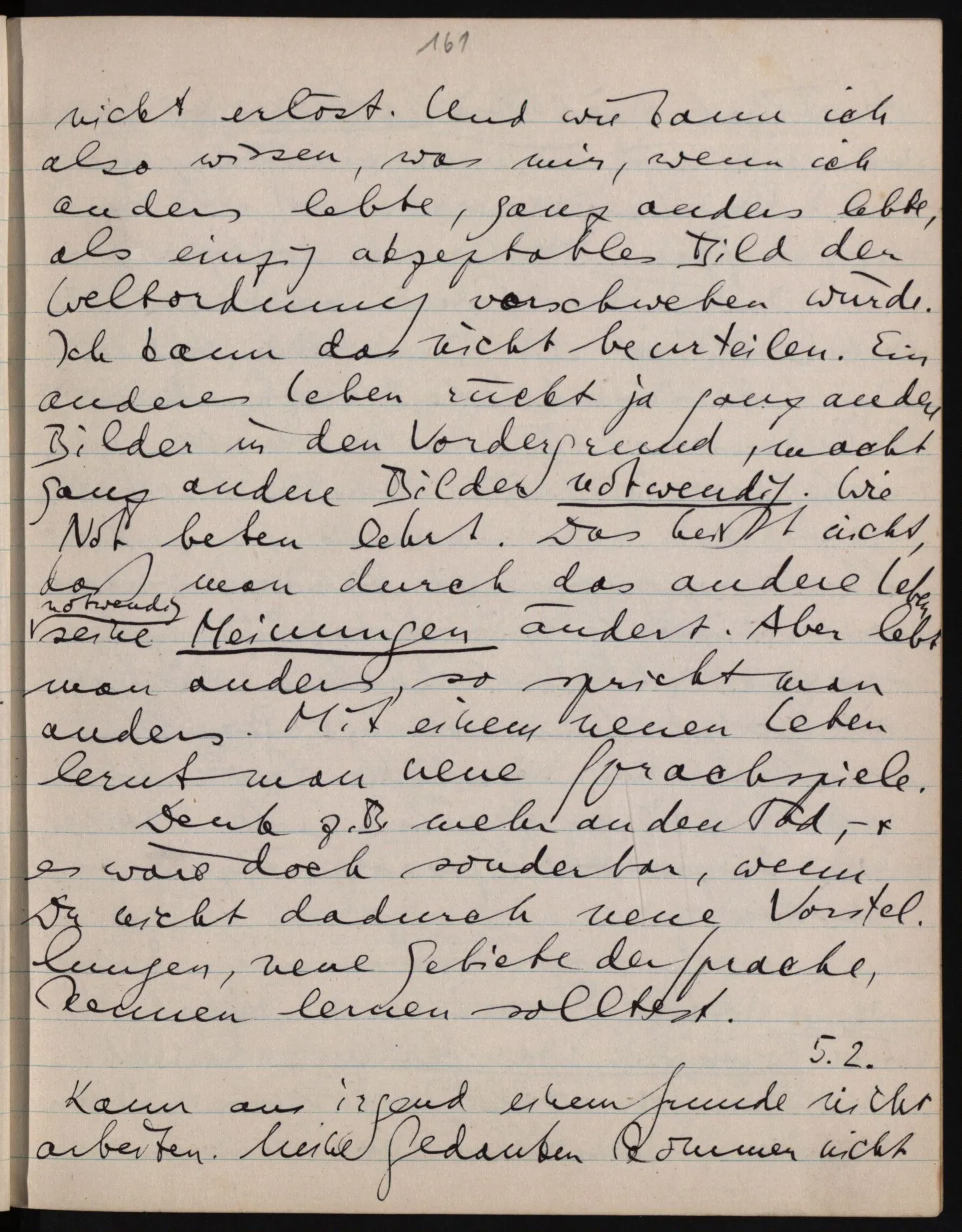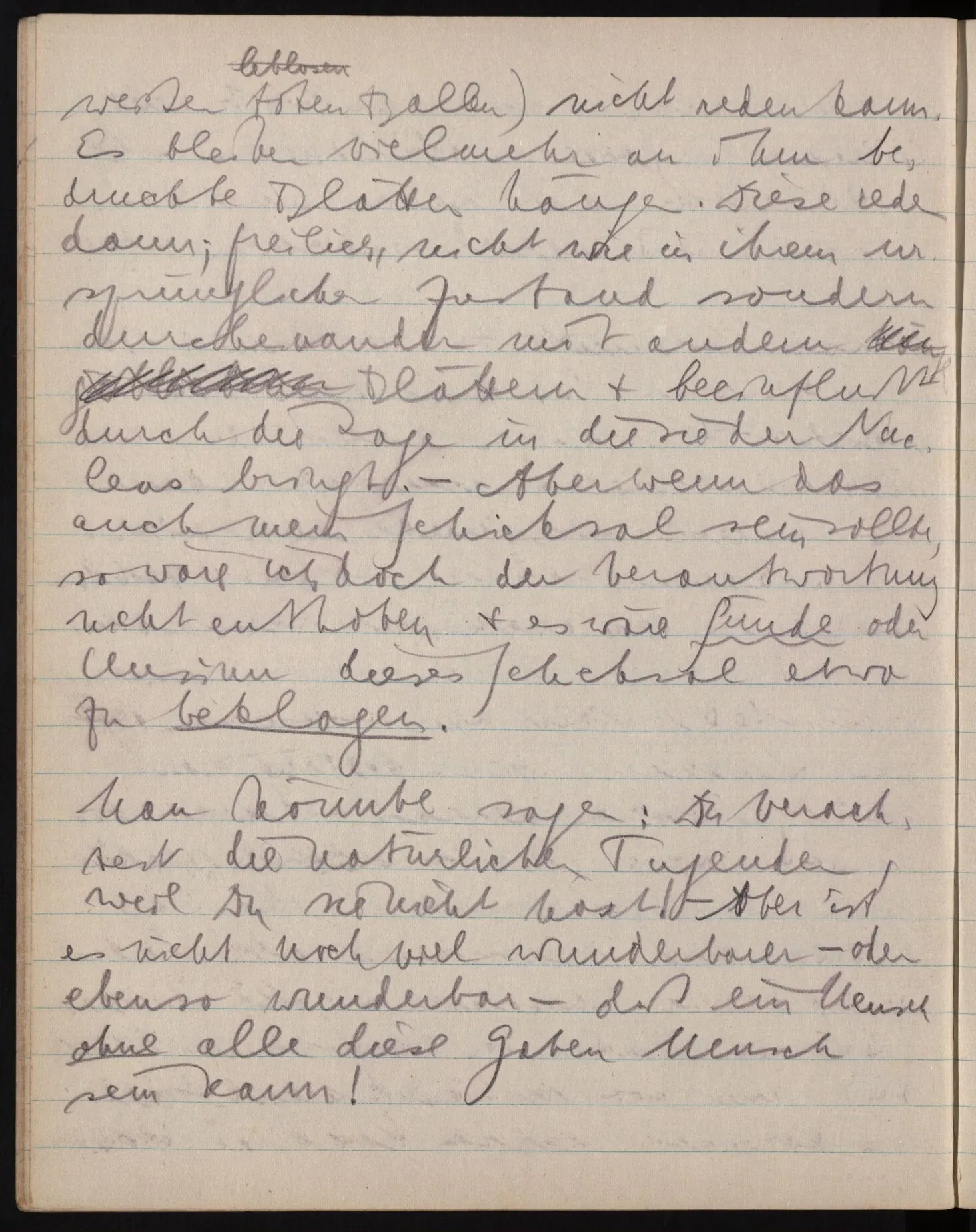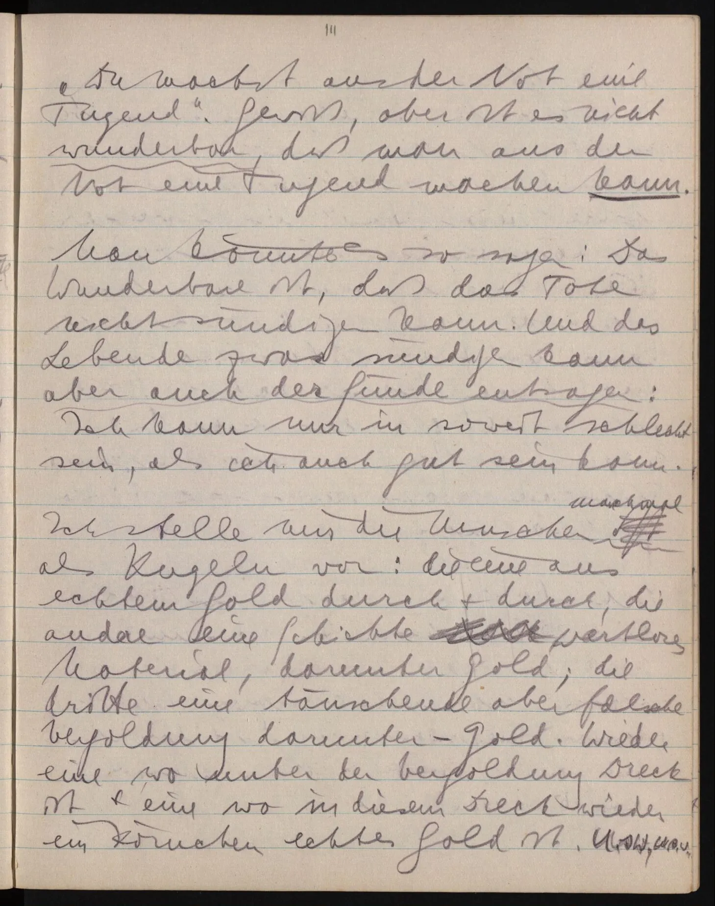 26.03.1937 Kritisiere nicht, was Ernste Ernstes geschrieben haben, denn Du weißt nicht, was Du kritisierst. Warum sollst Du über Alles Dir eine Meinung bilden. Aber das heißt nicht: stimme mit allem diesem überein. Ich bin so erleuchtet als ich bin; ich meine: meine Religion ist so erleuchtet, als sie ist. Ich habe mich gestern nicht weniger erleuchtet & heute nicht mehr. Denn, hätte ich’s gestern so ansehen können, so hätte ich’s bestimmt so angesehen. Man verwundert sich darüber, daß eine Zeit nicht an Hexen glaubte & eine spätere an Hexen glaubt & daß dies & Ähnliches geht & wiederkehrt, etc.; aber Du brauchst nur anzusehen, was Dir selbst geschieht um Dich nicht mehr zu verwundern. – An einem Tag kannst Du beten aber an einem andern vielleicht nicht, & an einem mußt Du beten, & an einem andern nicht. Es geht mir aus Gnade heute viel besser als gestern.