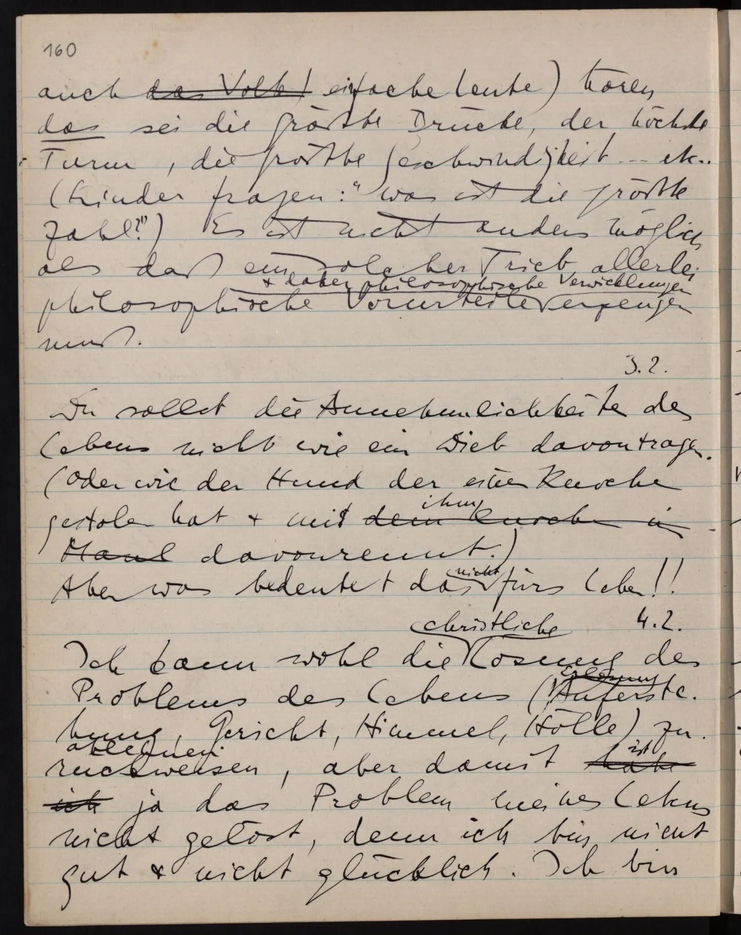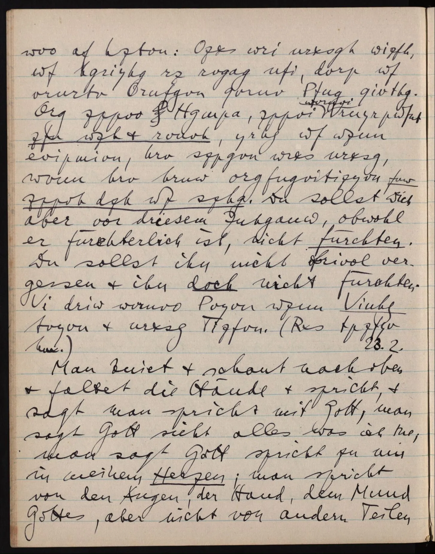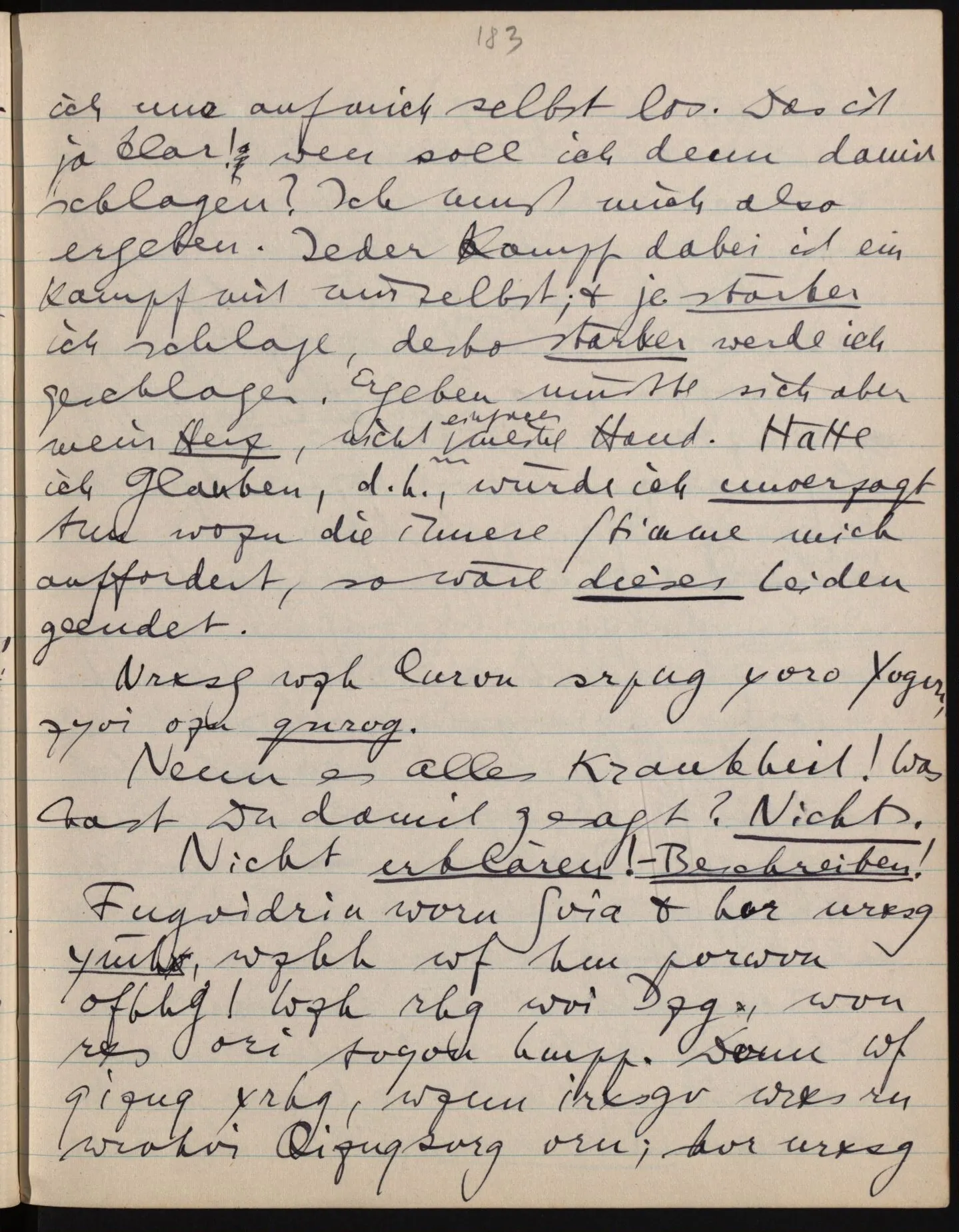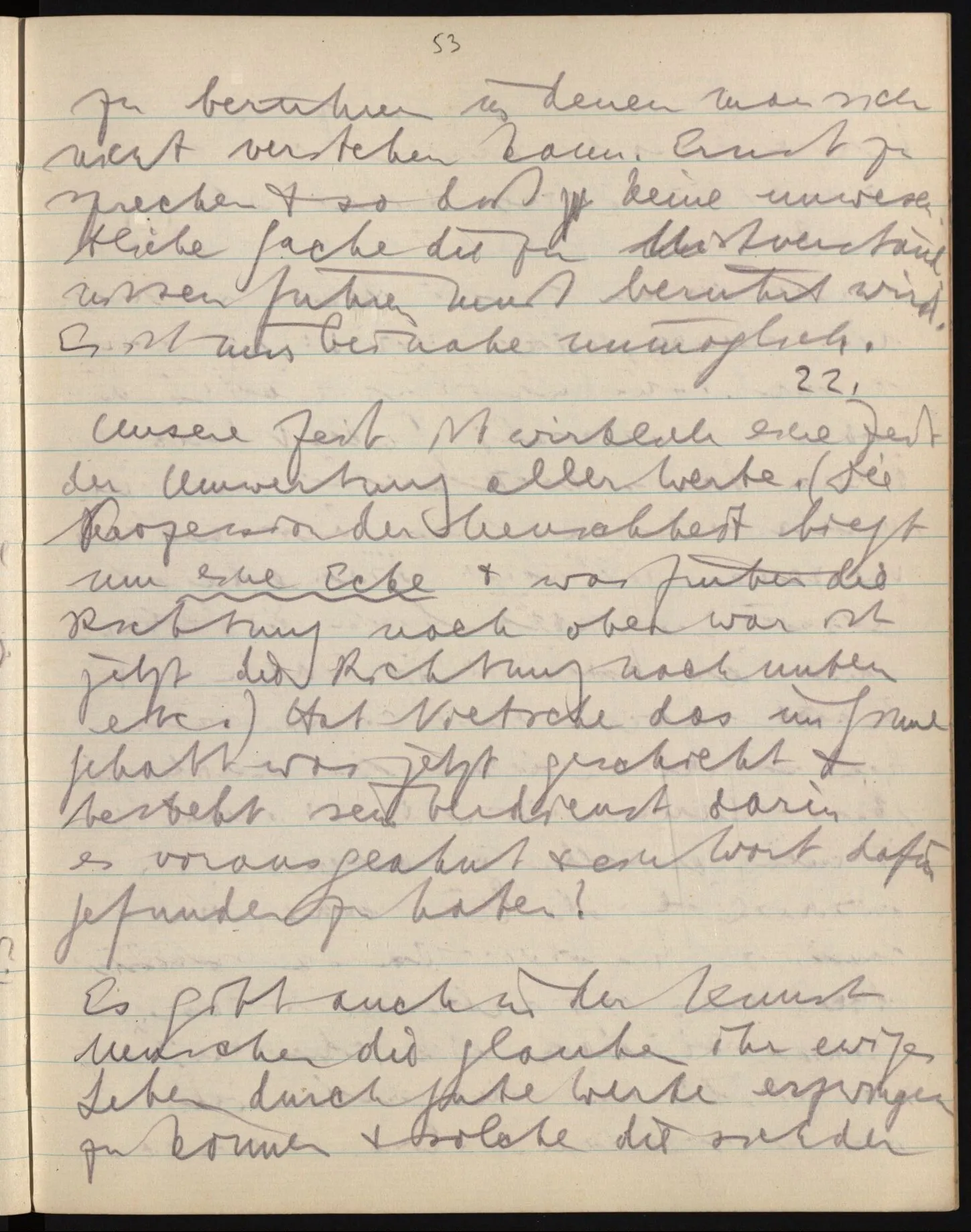 26.03.1937 Kritisiere nicht, was Ernste Ernstes geschrieben haben, denn Du weißt nicht, was Du kritisierst. Warum sollst Du über Alles Dir eine Meinung bilden. Aber das heißt nicht: stimme mit allem diesem überein. Ich bin so erleuchtet als ich bin; ich meine: meine Religion ist so erleuchtet, als sie ist. Ich habe mich gestern nicht weniger erleuchtet & heute nicht mehr. Denn, hätte ich’s gestern so ansehen können, so hätte ich’s bestimmt so angesehen. Man verwundert sich darüber, daß eine Zeit nicht an Hexen glaubte & eine spätere an Hexen glaubt & daß dies & Ähnliches geht & wiederkehrt, etc.; aber Du brauchst nur anzusehen, was Dir selbst geschieht um Dich nicht mehr zu verwundern. – An einem Tag kannst Du beten aber an einem andern vielleicht nicht, & an einem mußt Du beten, & an einem andern nicht. Es geht mir aus Gnade heute viel besser als gestern.