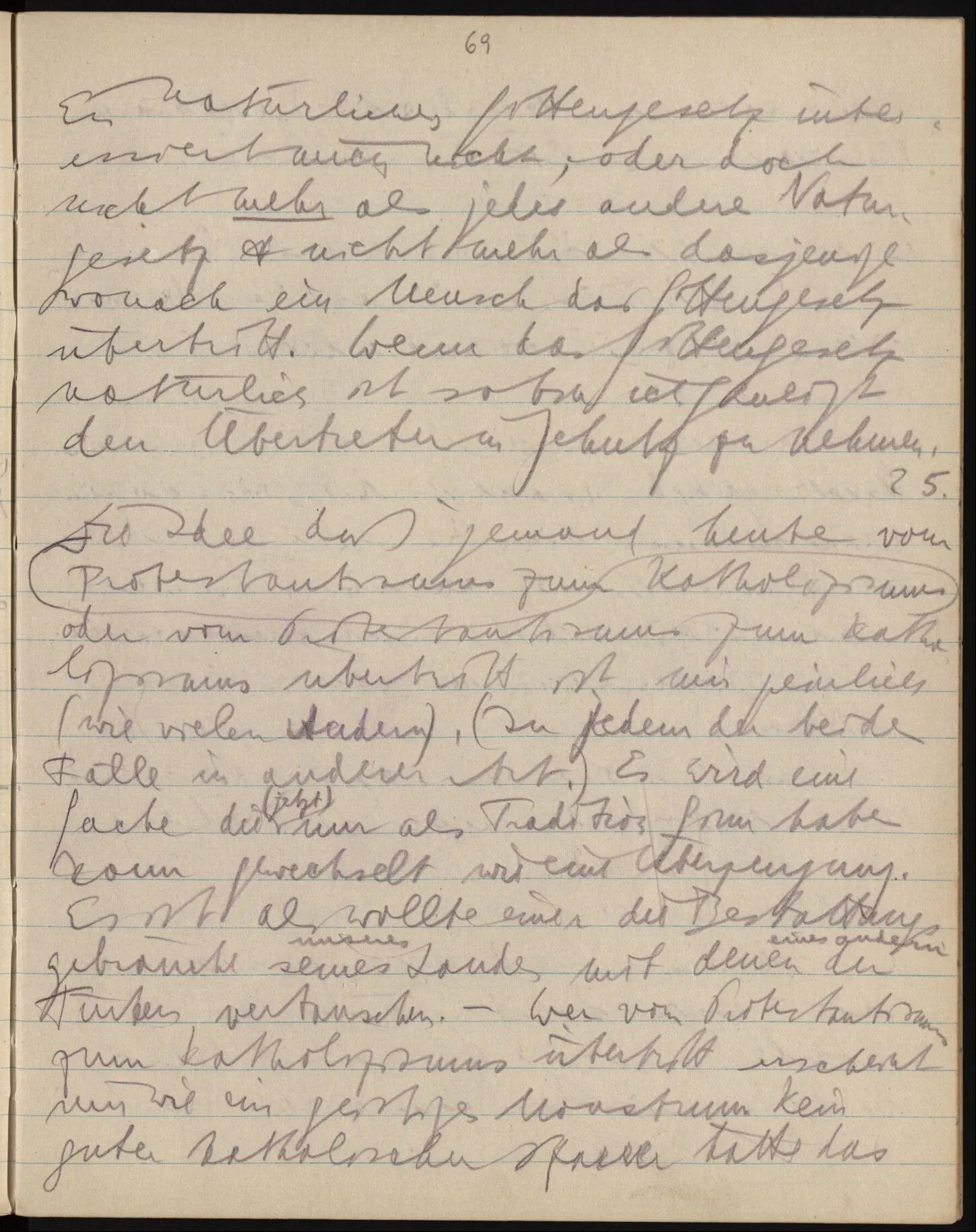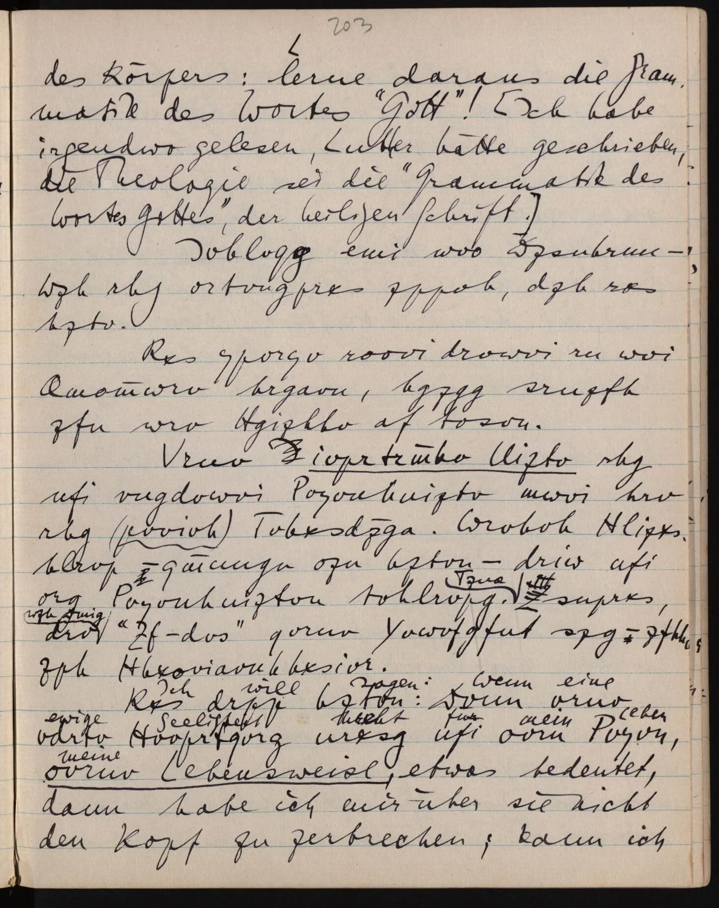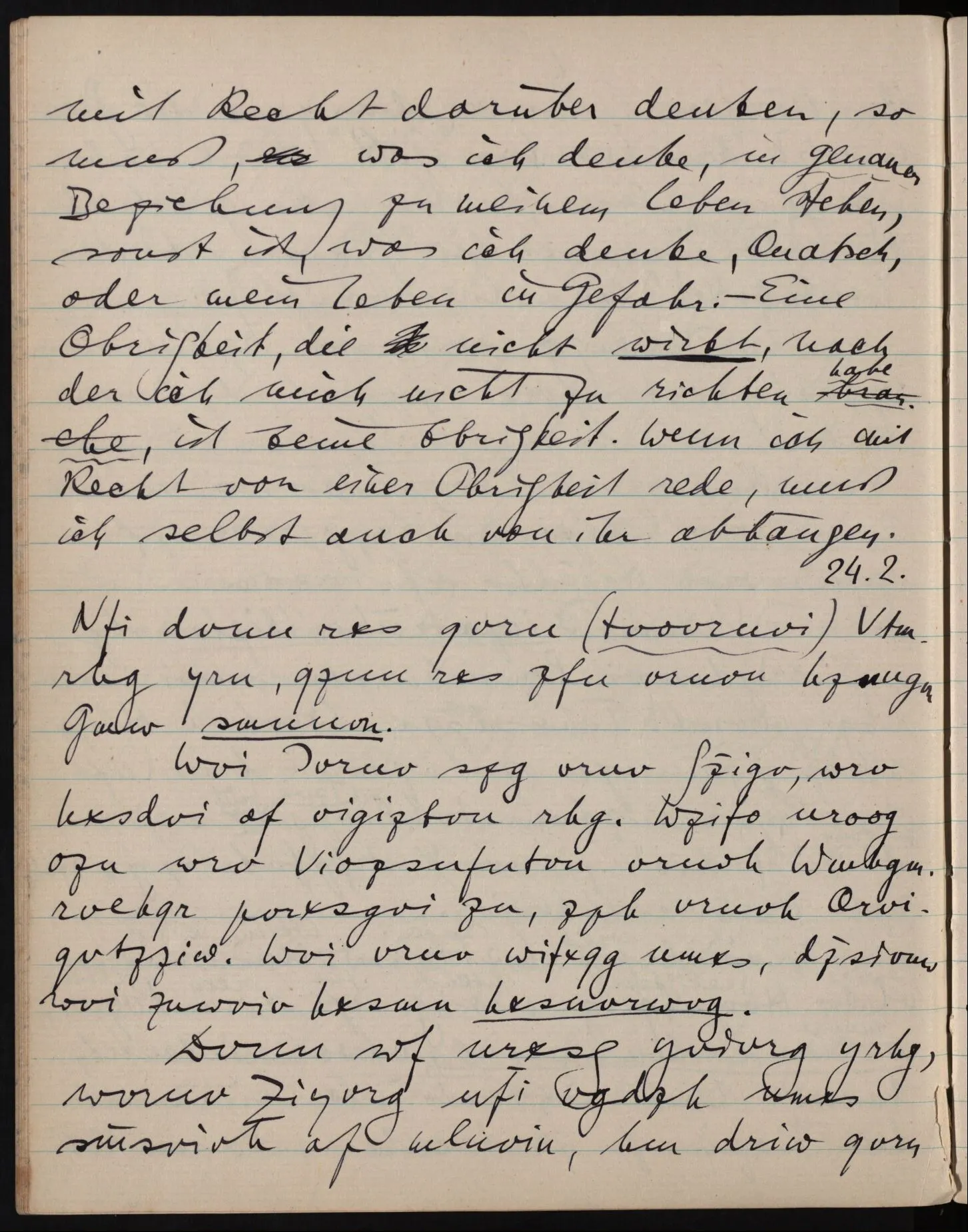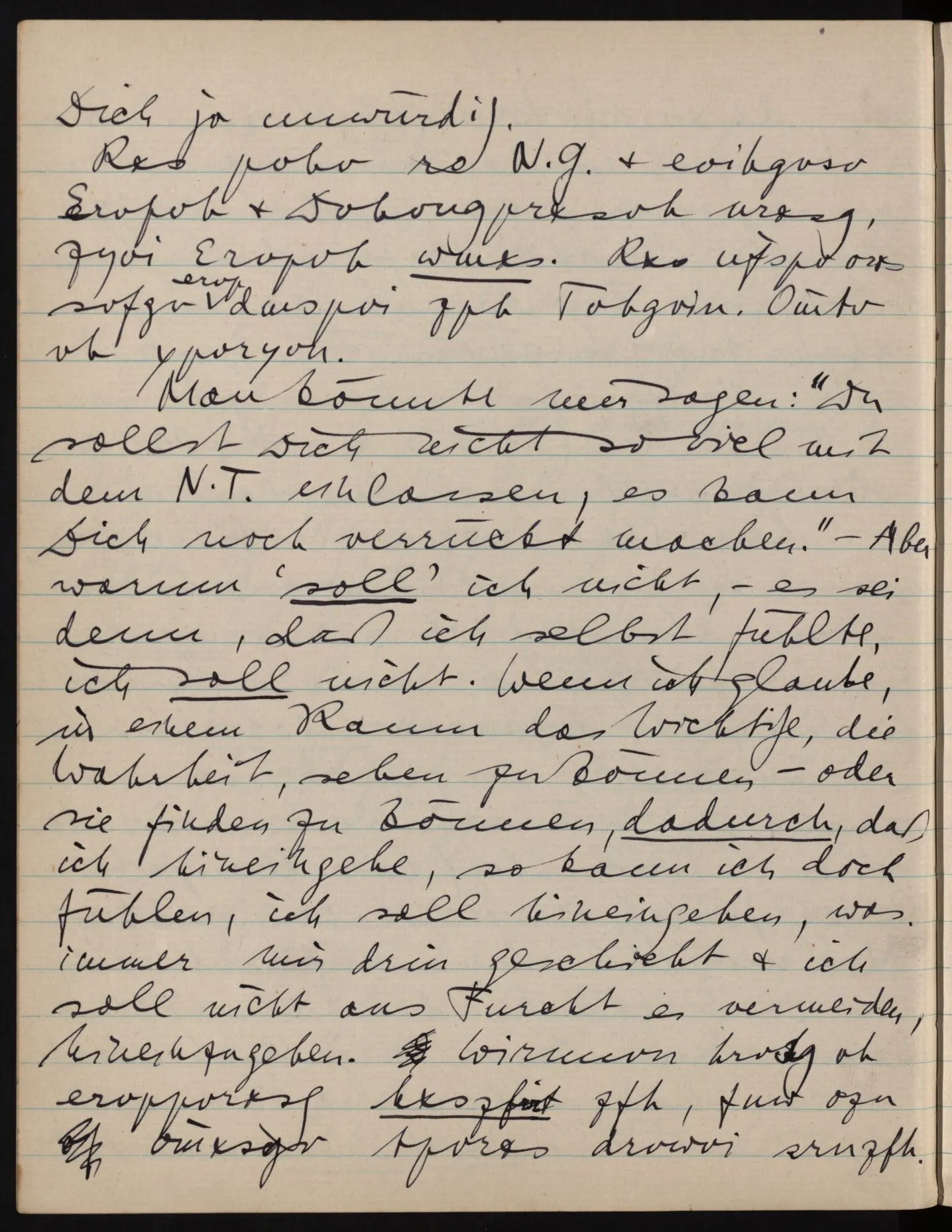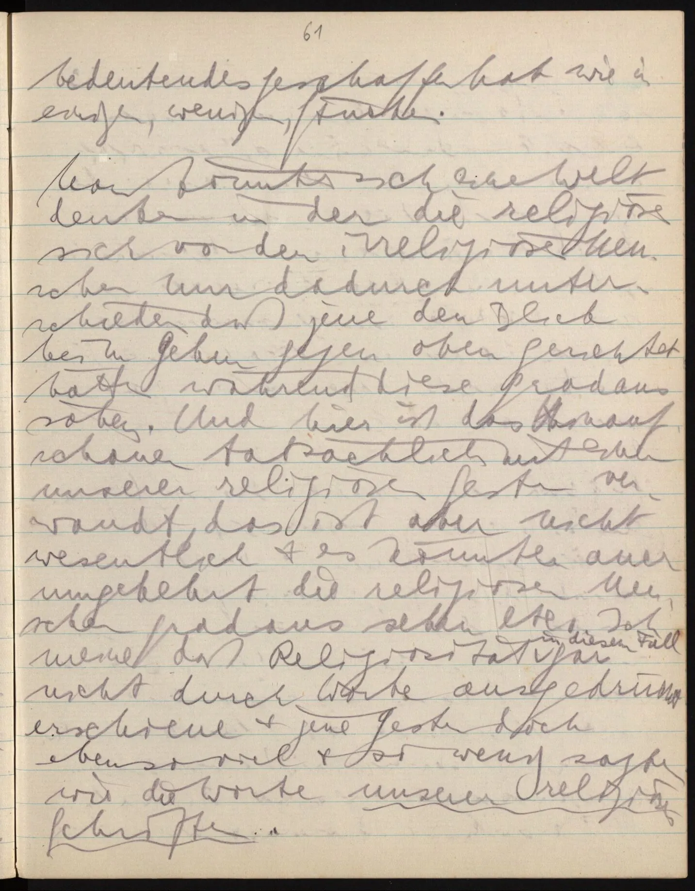 26.03.1937 Kritisiere nicht, was Ernste Ernstes geschrieben haben, denn Du weißt nicht, was Du kritisierst. Warum sollst Du über Alles Dir eine Meinung bilden. Aber das heißt nicht: stimme mit allem diesem überein. Ich bin so erleuchtet als ich bin; ich meine: meine Religion ist so erleuchtet, als sie ist. Ich habe mich gestern nicht weniger erleuchtet & heute nicht mehr. Denn, hätte ich’s gestern so ansehen können, so hätte ich’s bestimmt so angesehen. Man verwundert sich darüber, daß eine Zeit nicht an Hexen glaubte & eine spätere an Hexen glaubt & daß dies & Ähnliches geht & wiederkehrt, etc.; aber Du brauchst nur anzusehen, was Dir selbst geschieht um Dich nicht mehr zu verwundern. – An einem Tag kannst Du beten aber an einem andern vielleicht nicht, & an einem mußt Du beten, & an einem andern nicht. Es geht mir aus Gnade heute viel besser als gestern.