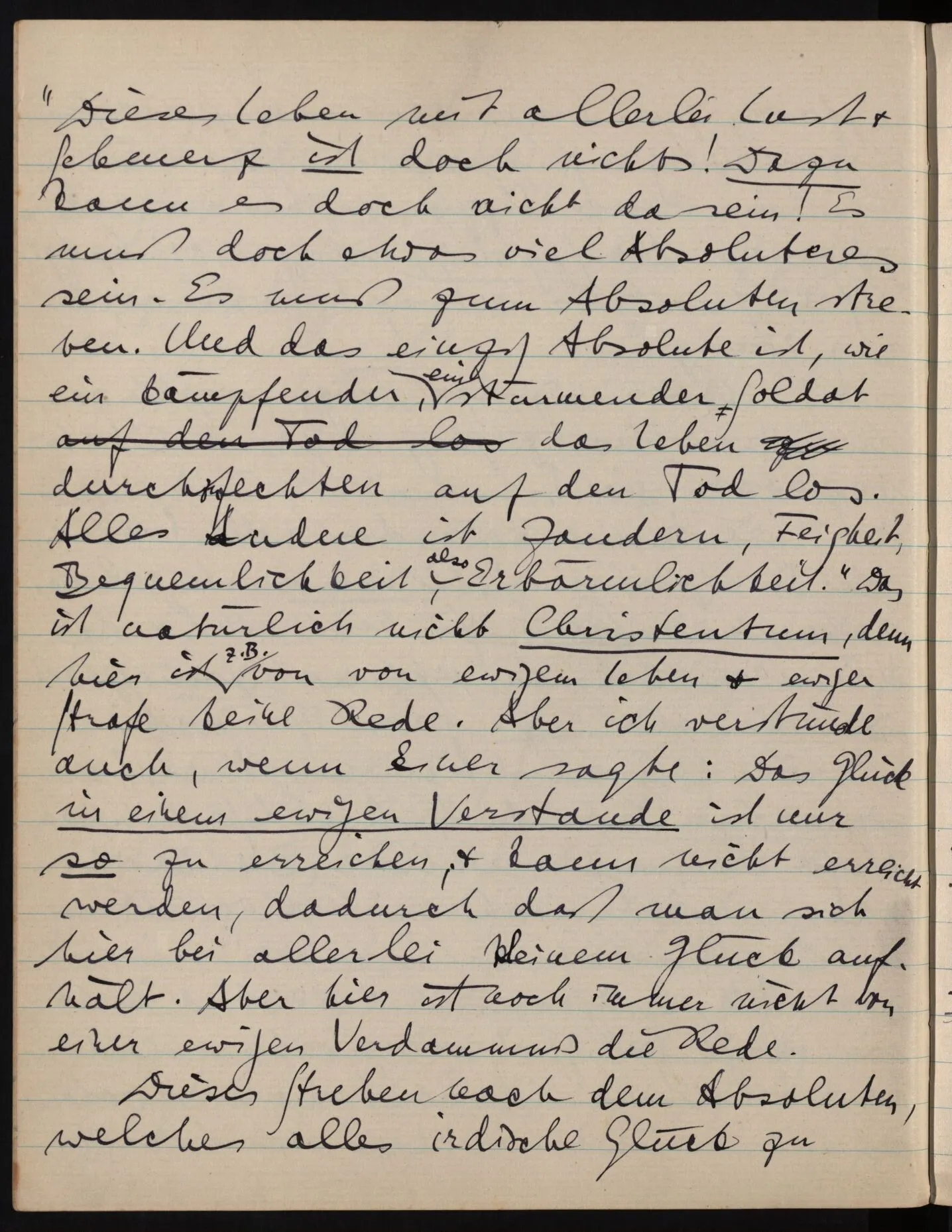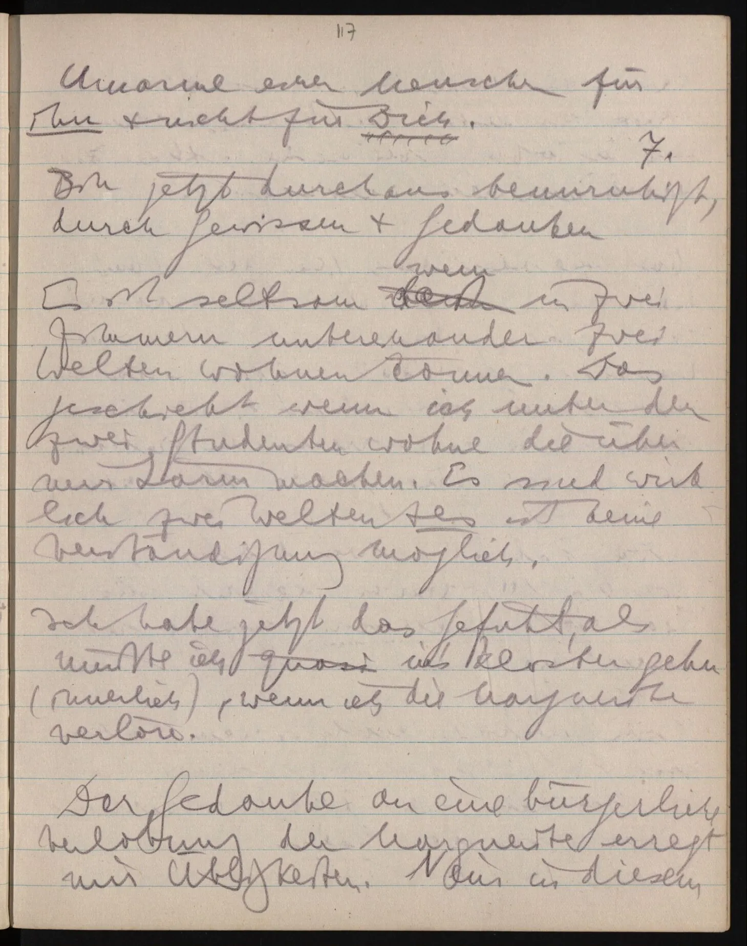 Ich liebe die Marguerite sehr & habe große Angst sie möchte nicht gesund sein da ich schon über eine Woche keinen Brief von ihr habe. Ich denke wenn ich allein bin wieder & wieder an sie aber auch sonst. Wäre ich anständiger so wäre auch meine Liebe zu ihr anständiger. Und dabei liebe ich sie jetzt so innig als ich kann. An Innigkeit fehlt es mir vielleicht auch nicht. Aber an Anständigkeit.