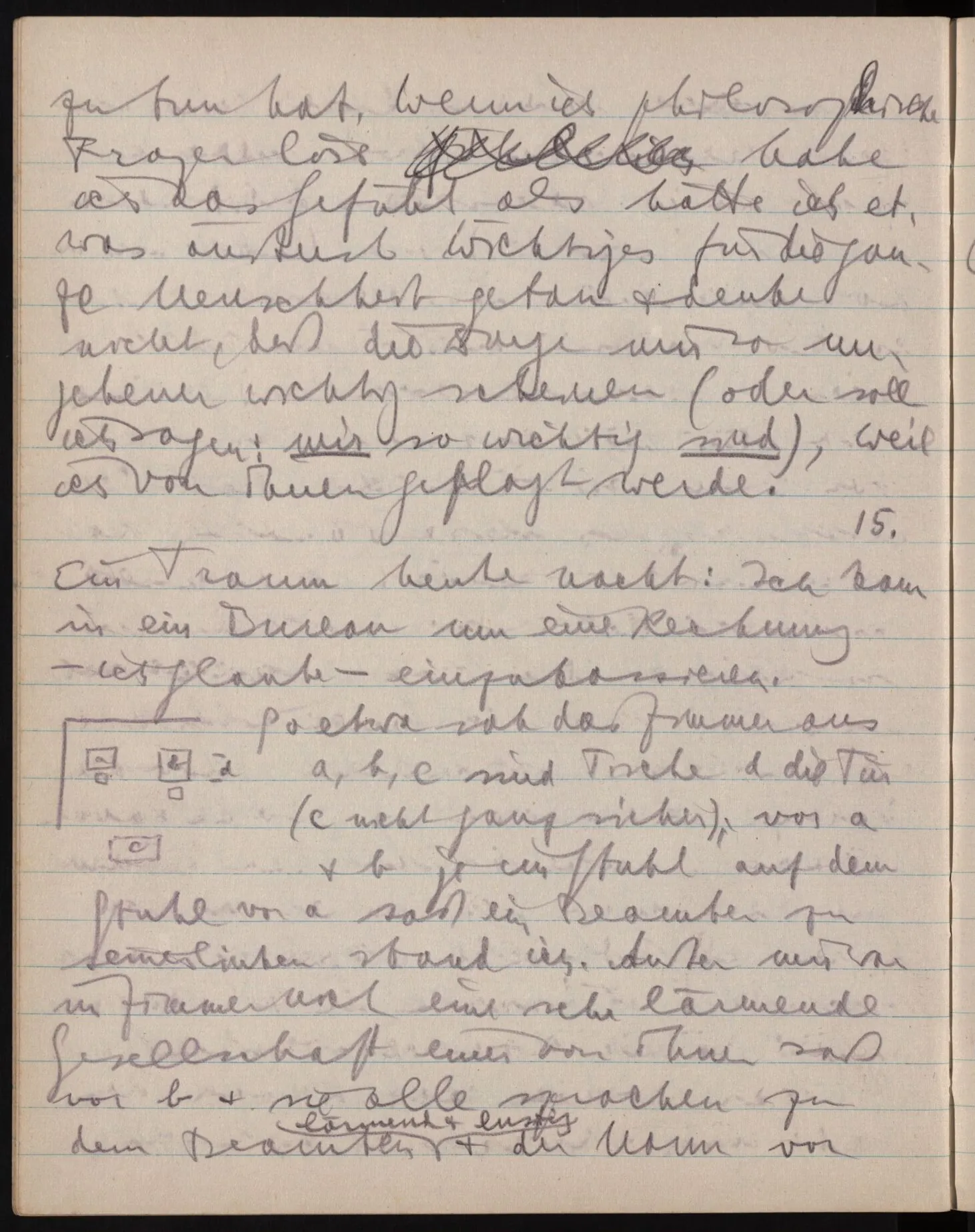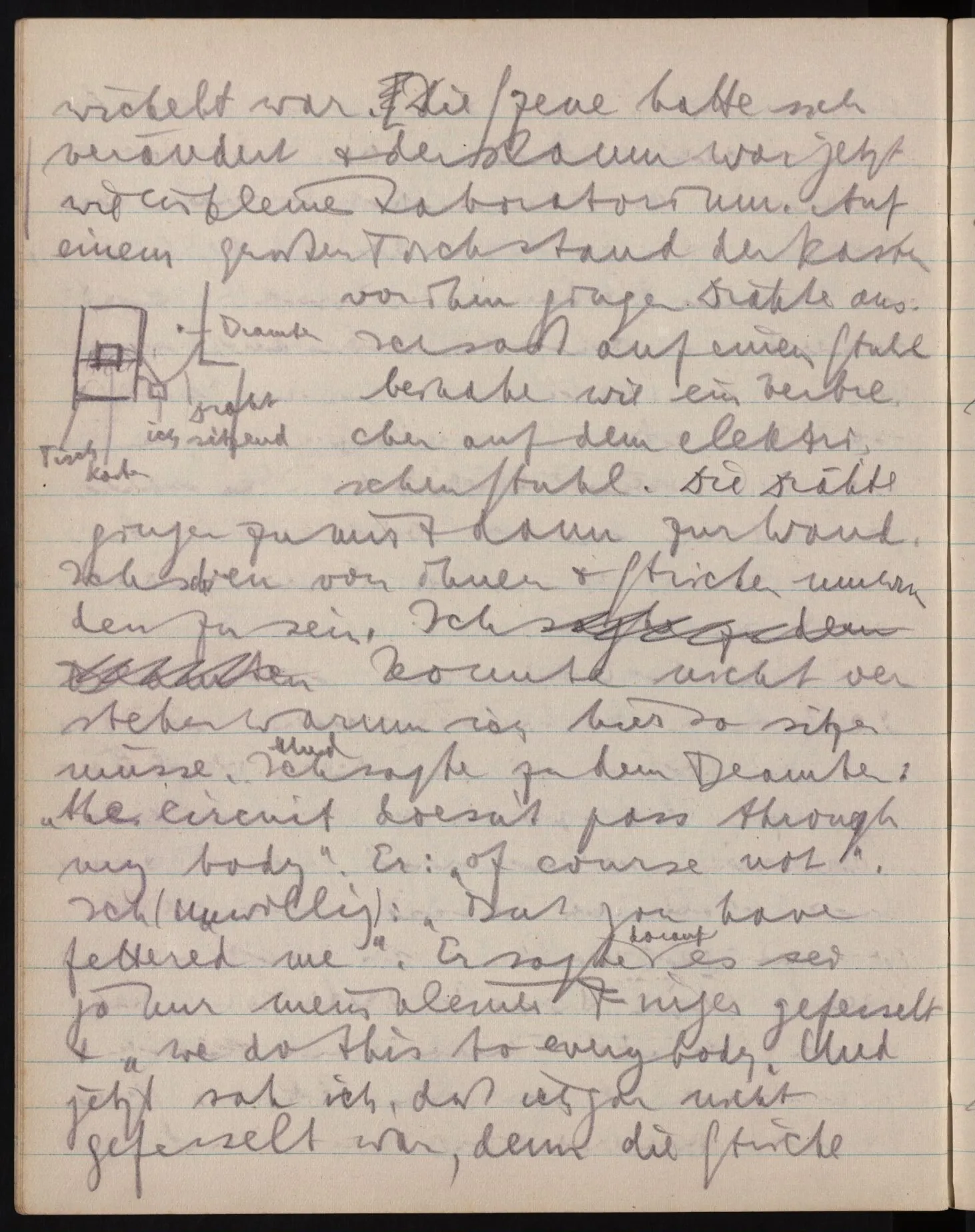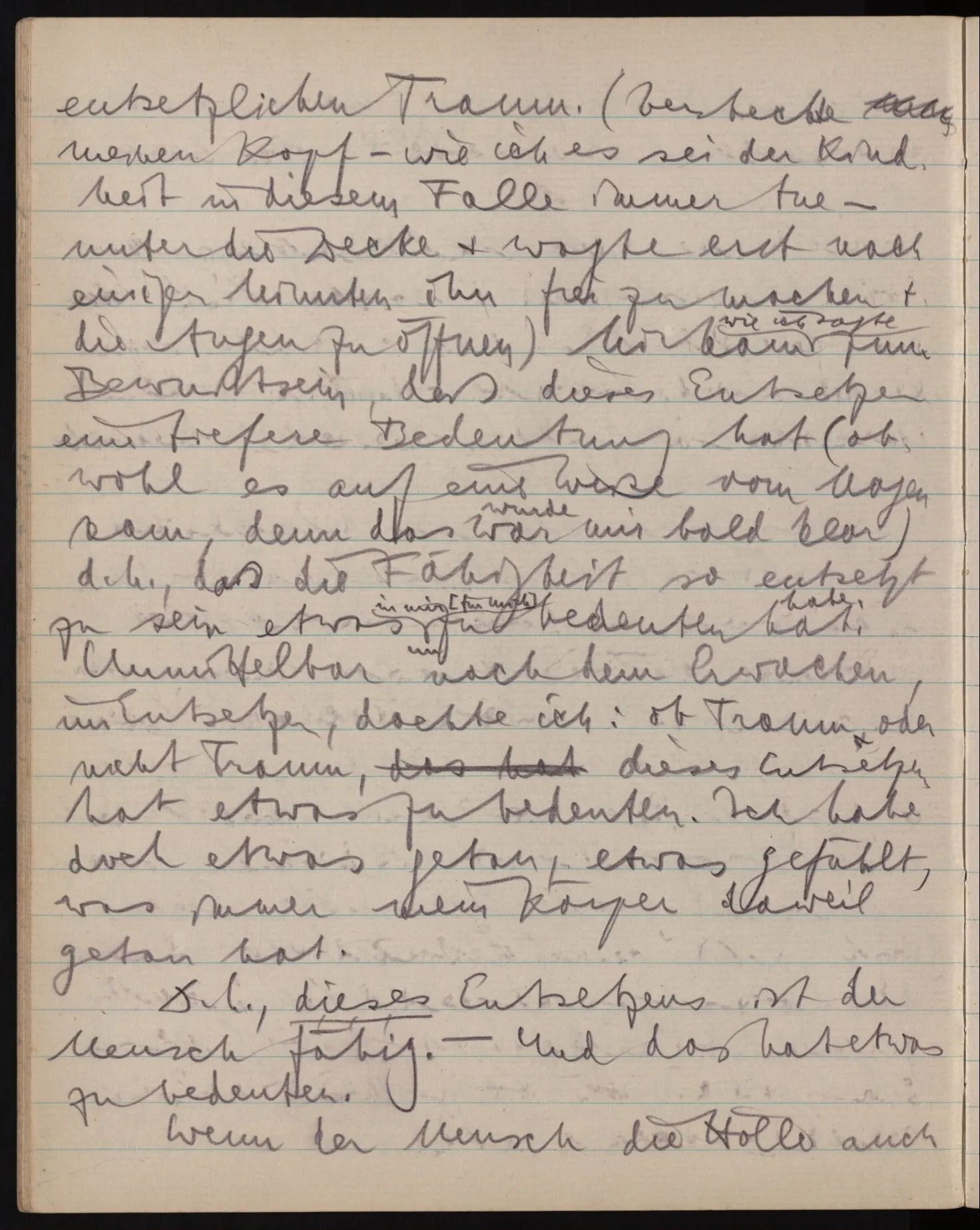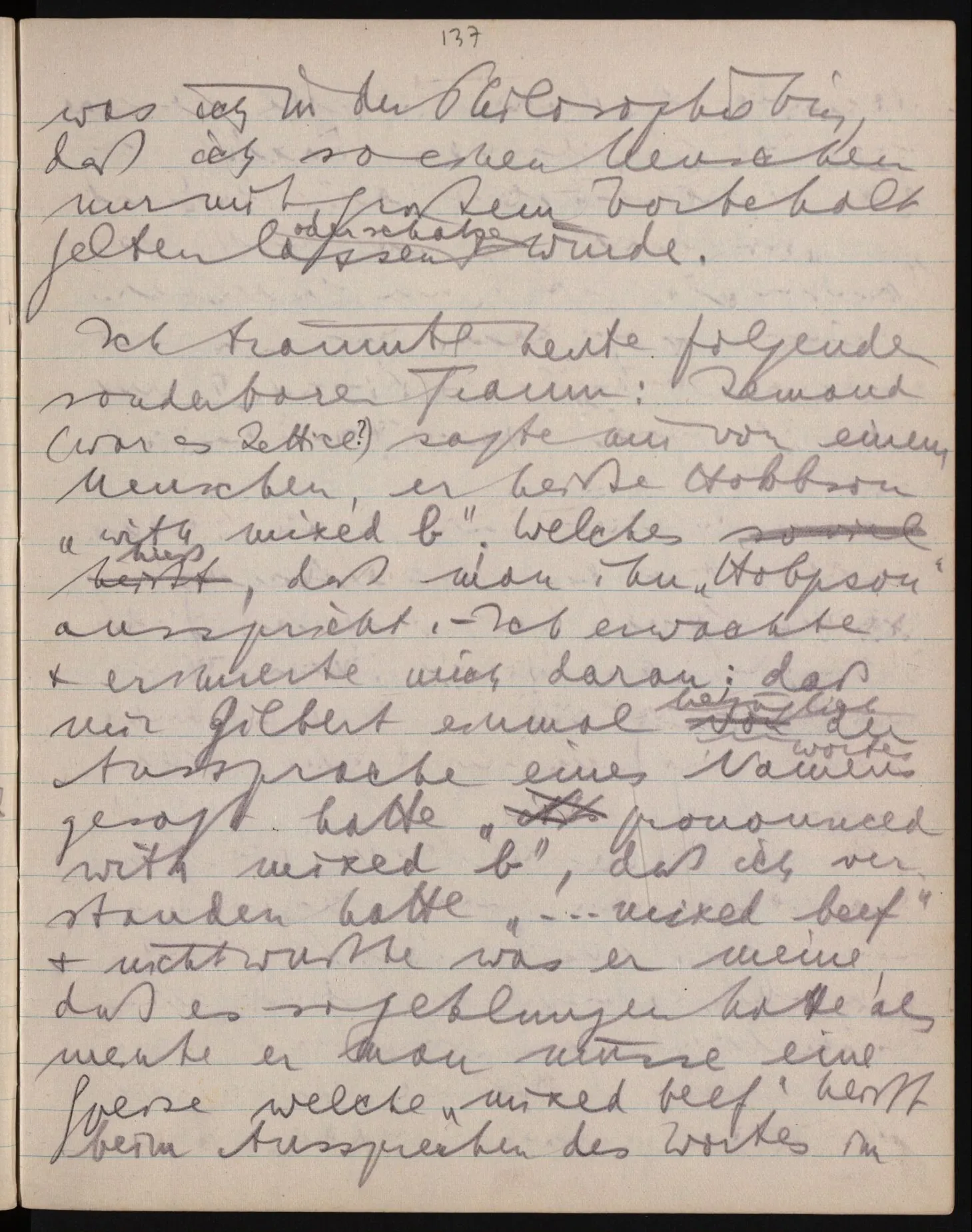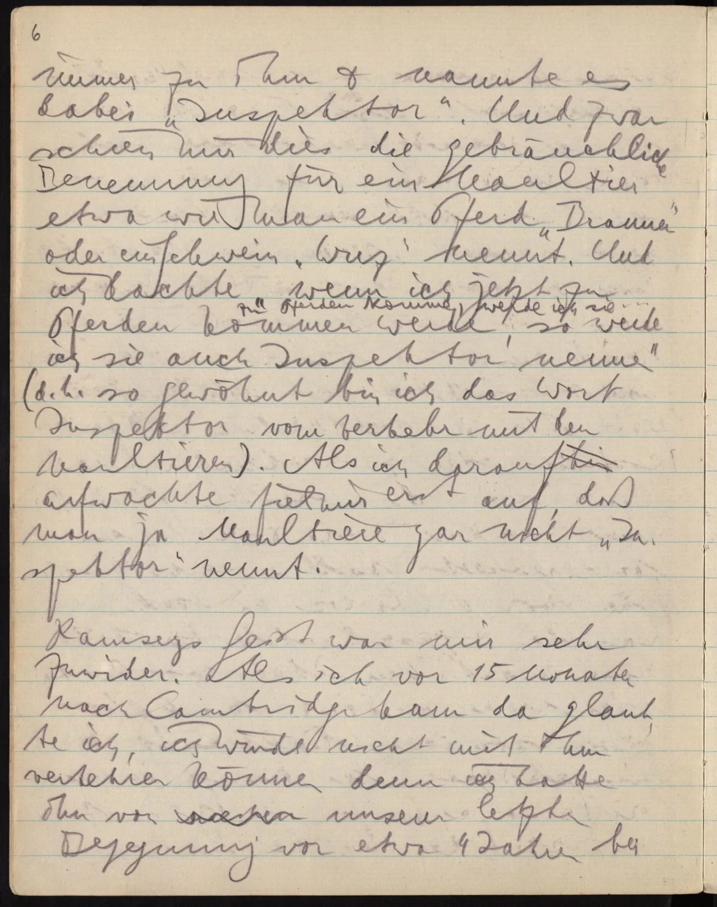Vor einigen Tagen träumte ich folgendes: Ich führte ein Maultier dessen Wärter ich zu sein schien. Zuerst auf einer Straße – ich glaube in einer orientalischen Stadt; dann in ein Büro wo ich in einem großen Zimmer warten mußte. Vor diesem war noch ein kleineres mit vielen Leuten. Das Maultier war unruhig & störrisch. Ich hielt es an einem kurzen Strick & dachte ich möchte daß es sich den Kopf an die Wand anrennt – an der ich saß – dann wird es ruhiger werden. Ich sprach immer zu ihm & nannte es dabei „Inspektor”. Und zwar schien mir dies die gebräuchliche Benennung für ein Maultier etwa wie man ein Pferd „Brauner” oder ein Schwein „Wuz” nennt. Und ich dachte „wenn ich jetzt zu Pferden kommen werde, so werde ich sie auch Inspektor nennen” (d.h. so gewöhnt bin ich das Wort „Inspektor” vom Verkehr mit den Maultieren). Als ich darauf aufwachte fiel mir erst auf, daß man ja Maultiere gar nicht „Inspektor” nennt.