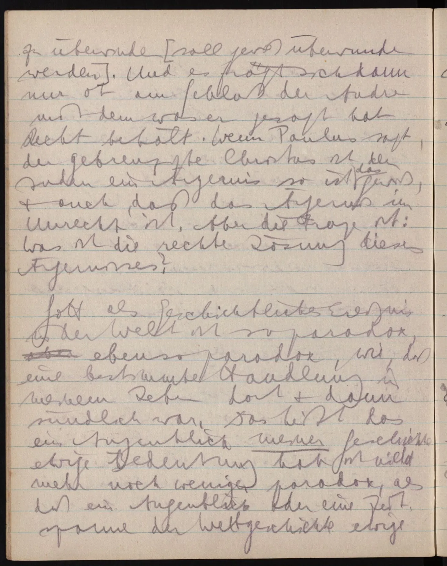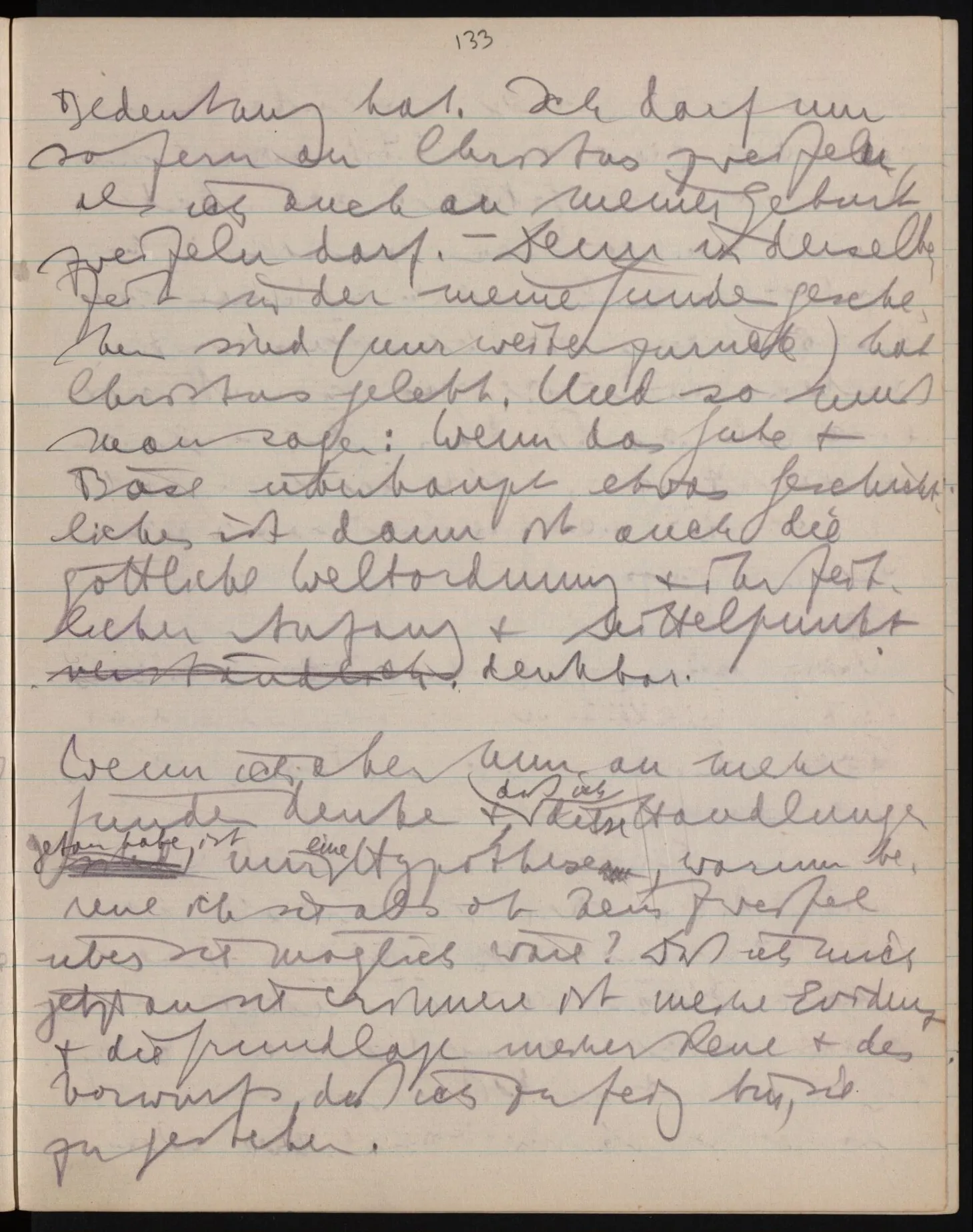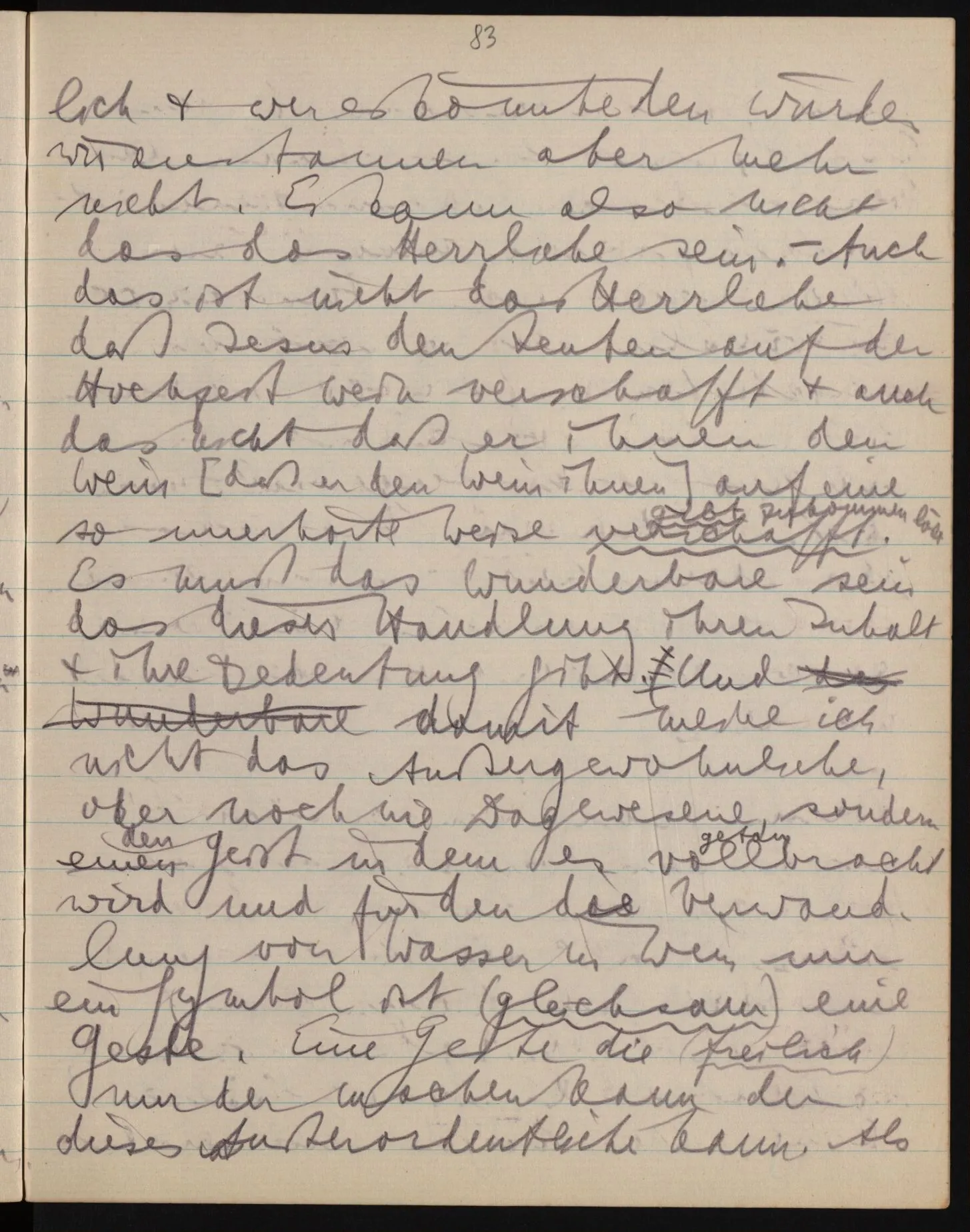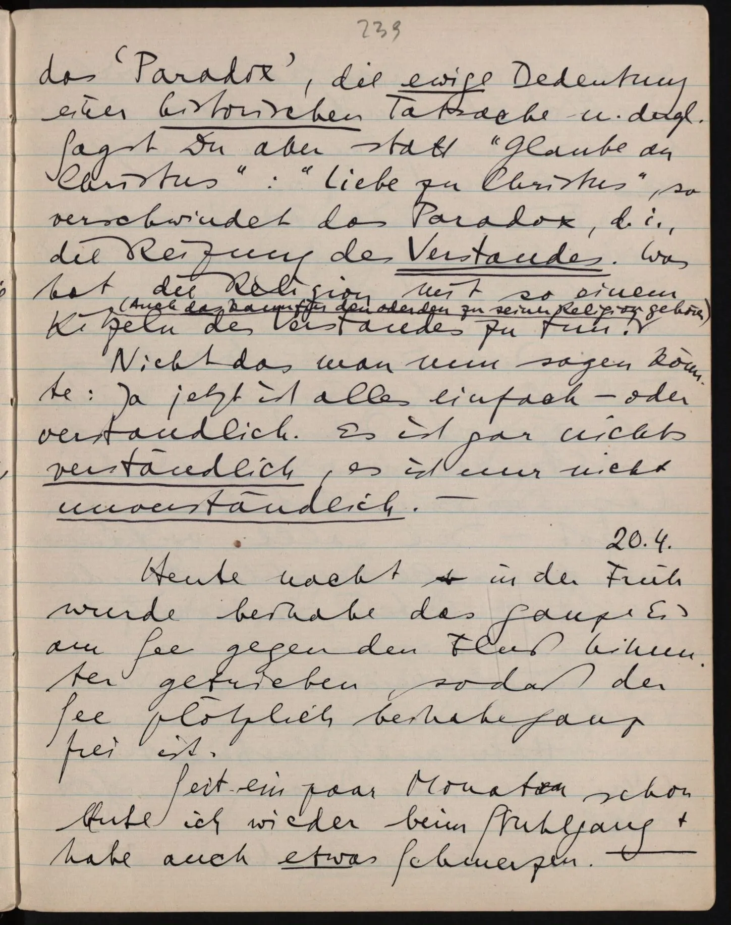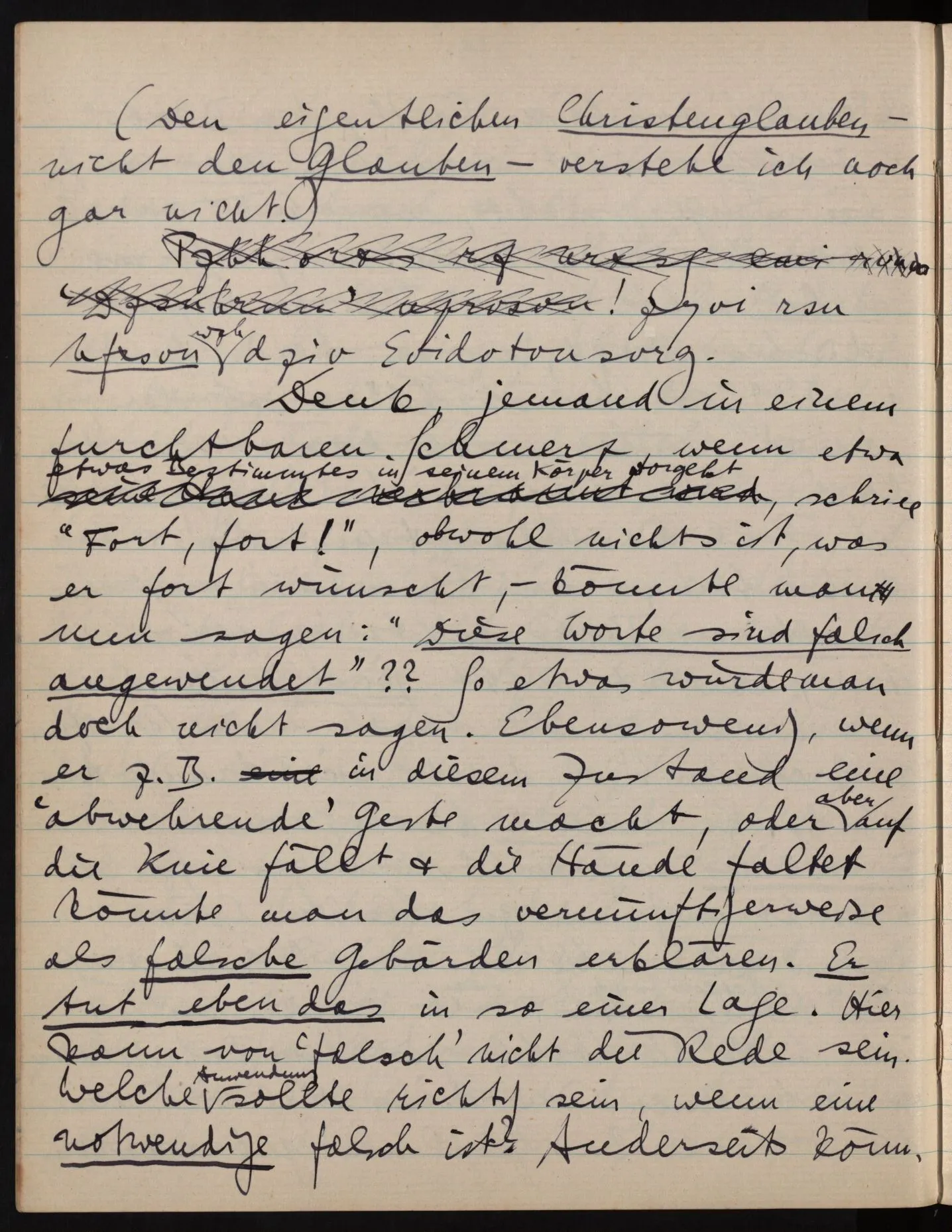 19.04.1937 Ich glaube: es ist durch das Wort “glauben” in der Religion furchtbar viel Unheil angerichtet worden. Alle die verzwickten Gedanken über das ‘Paradox’, die ewige Bedeutung einer historischen Tatsache u. dergl. Sagst Du aber statt “Glaube an Christus”: “Liebe zu Christus”, so verschwindet das Paradox, d.i., die Reizung des Verstandes. Was hat die Religion mit so einem Kitzeln des Verstandes zu tun. (Auch das kann für den oder den zu seiner Religion gehören.) Nicht daß man nun sagen könnte: Ja jetzt ist alles einfach – oder verständlich. Es ist gar nichts verständlich, es ist nur nicht unverständlich. –