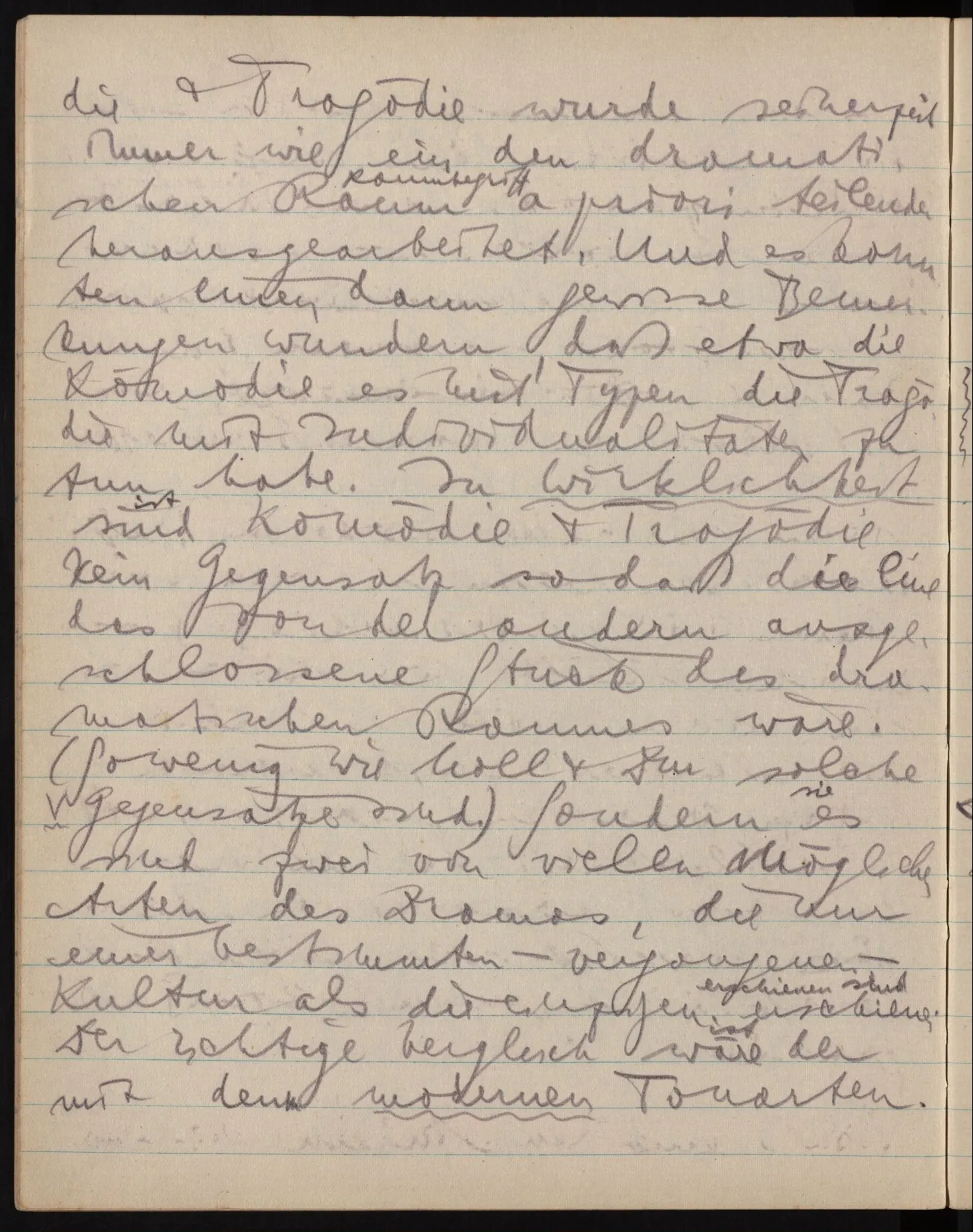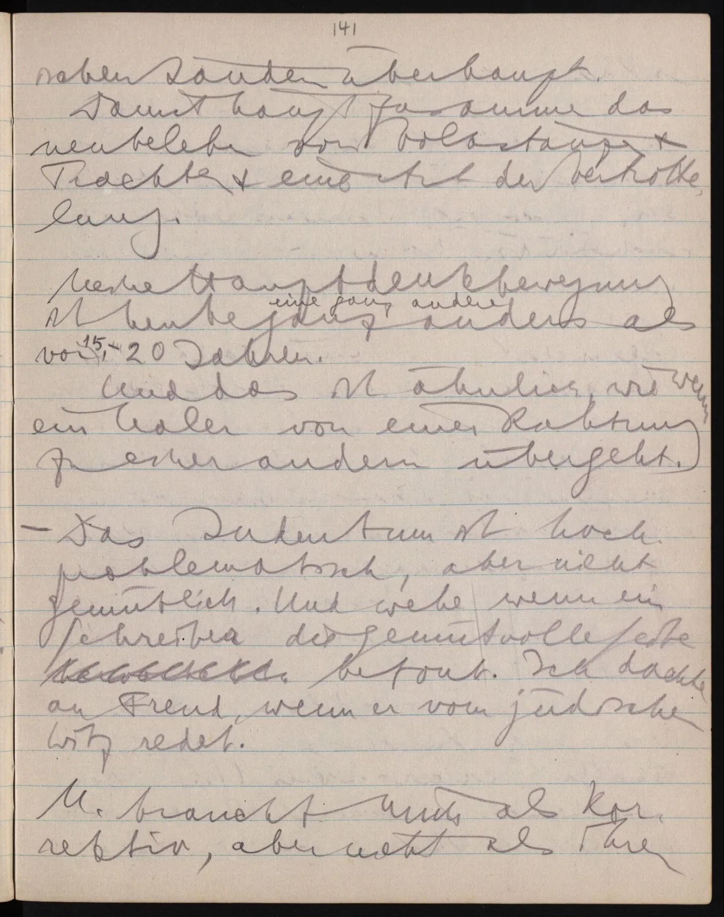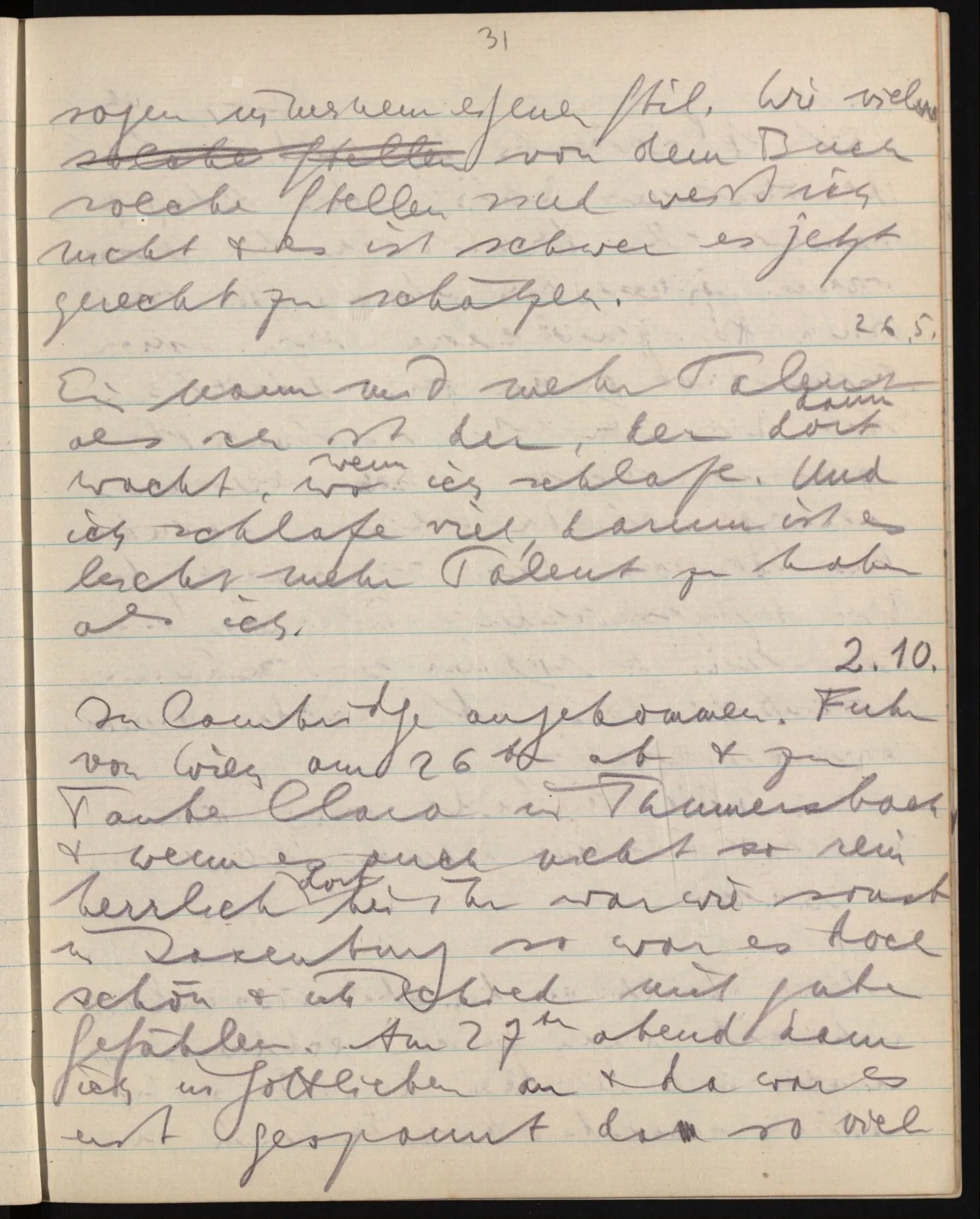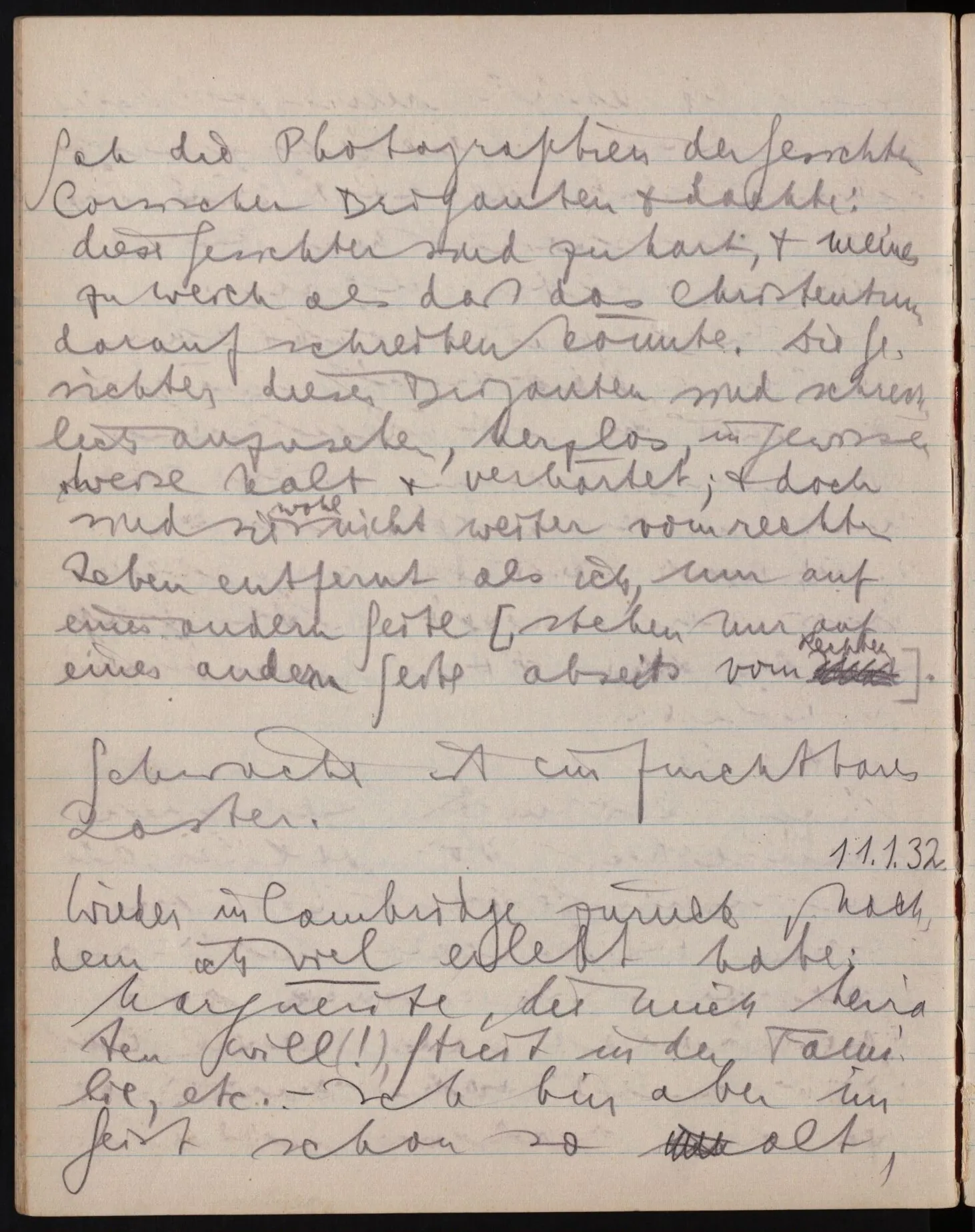 30.04.1930 Unfruchtbar & träg. Zu dem Geistigen: Ich denke mir dann immer: haben diese Großen dazu so unerhört viel gelitten, daß heute ein Arschgesicht kommt & seine Meinung über sie abgibt. Dieser Gedanke erfüllt mich oft mit einer Art von Hoffnungslosigkeit. – Gestern saß ich eine Zeit lang im Garten von Trinity & da dachte ich merkwürdig wie die gute körperliche Entwicklung aller dieser Leute mit völliger Geistlosigkeit zusammengeht (ich meine nicht Verstandlosigkeit). Und wie andererseits ein Thema, von Brahms voll von Kraft, Grazie, & Schwung ist & er selbst einen Bauch hatte. Dagegen hat der Geist der Heutigen keine Sprungfedern unter den Füßen.