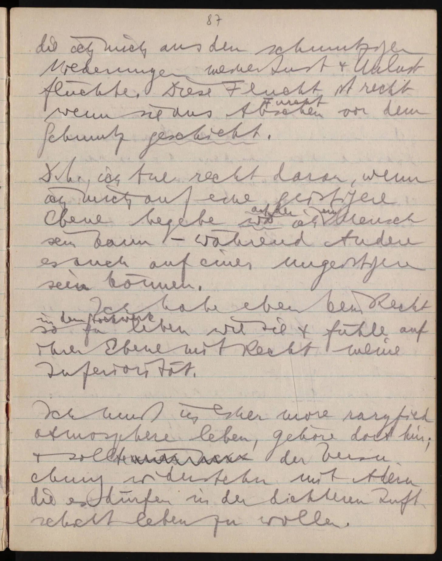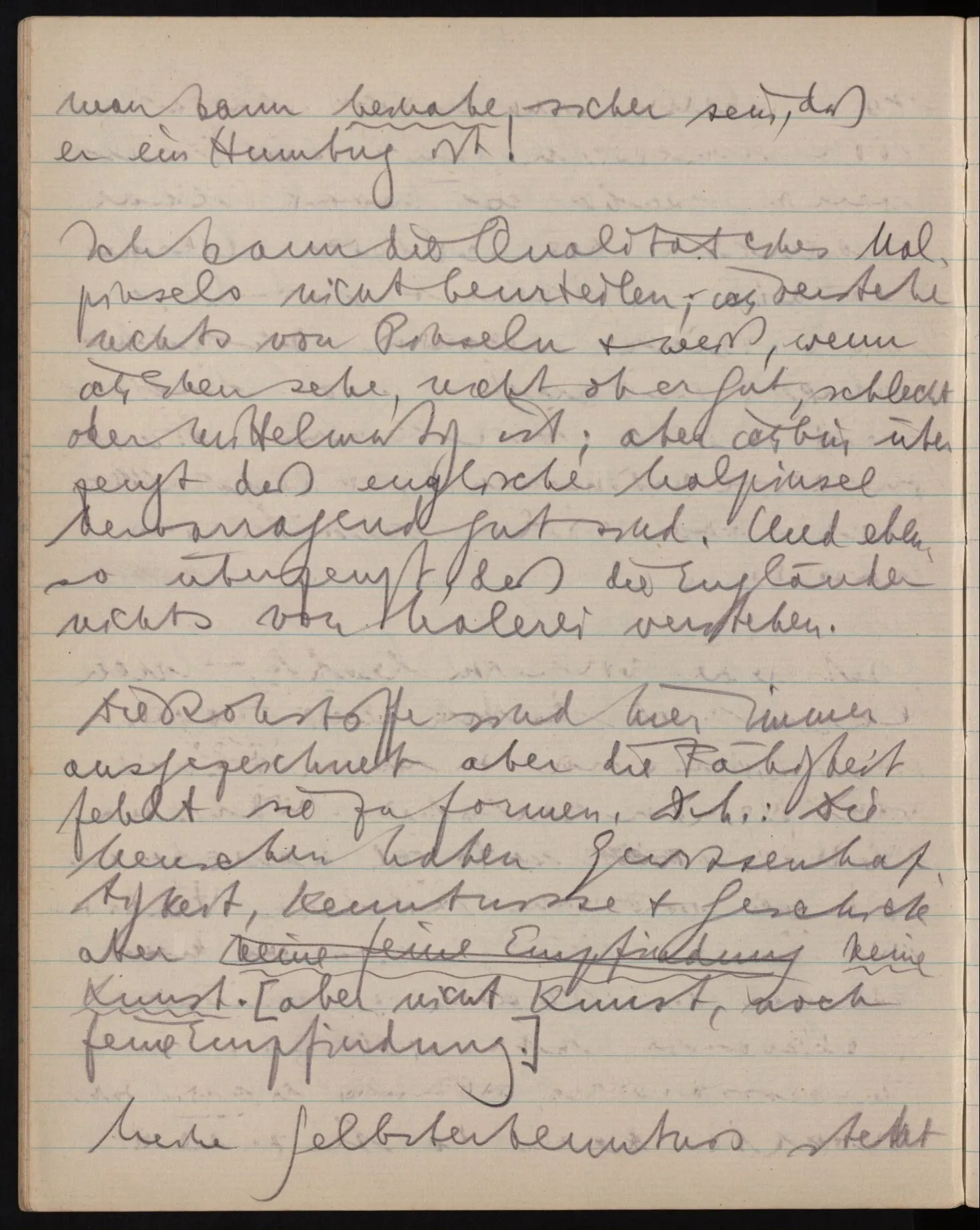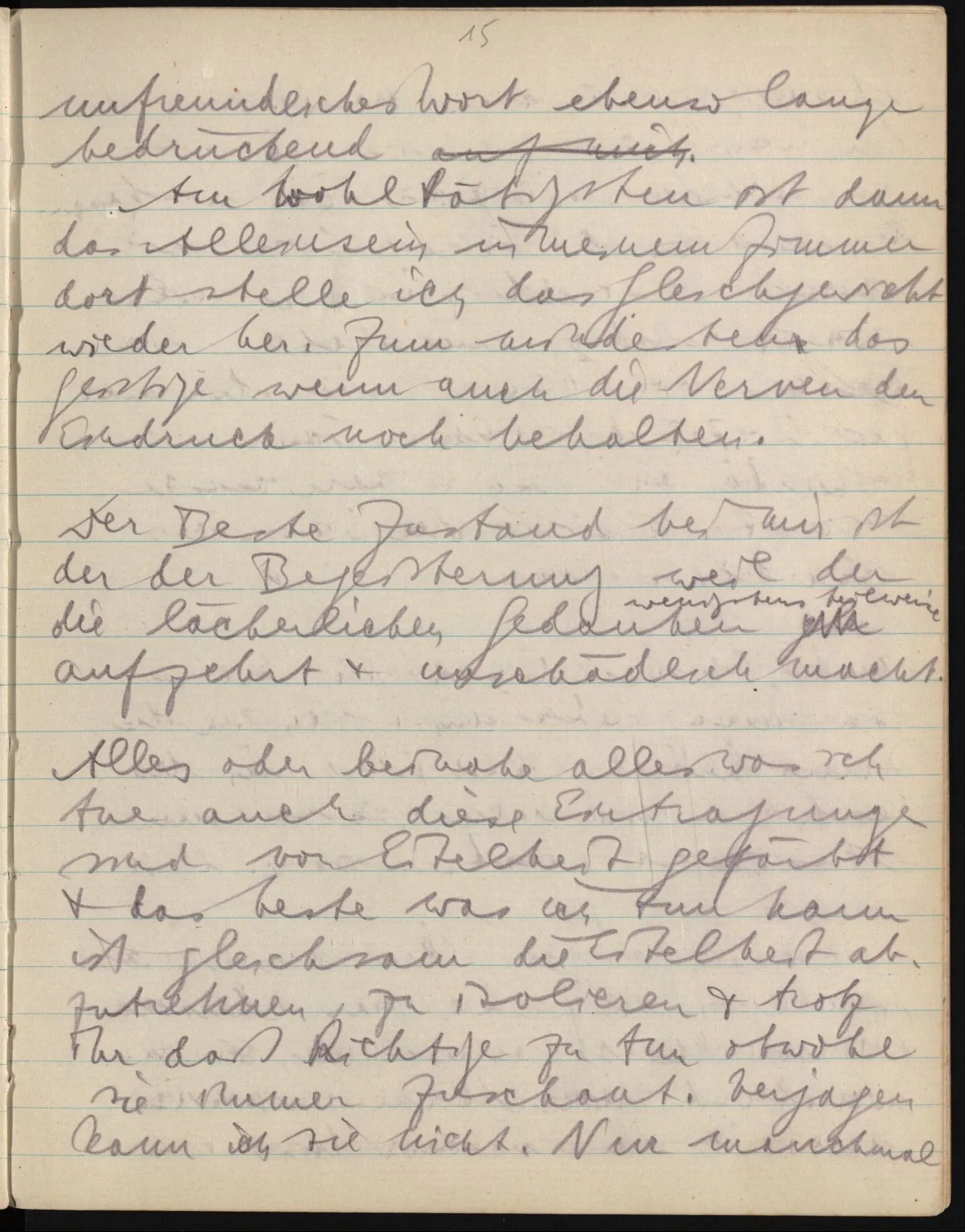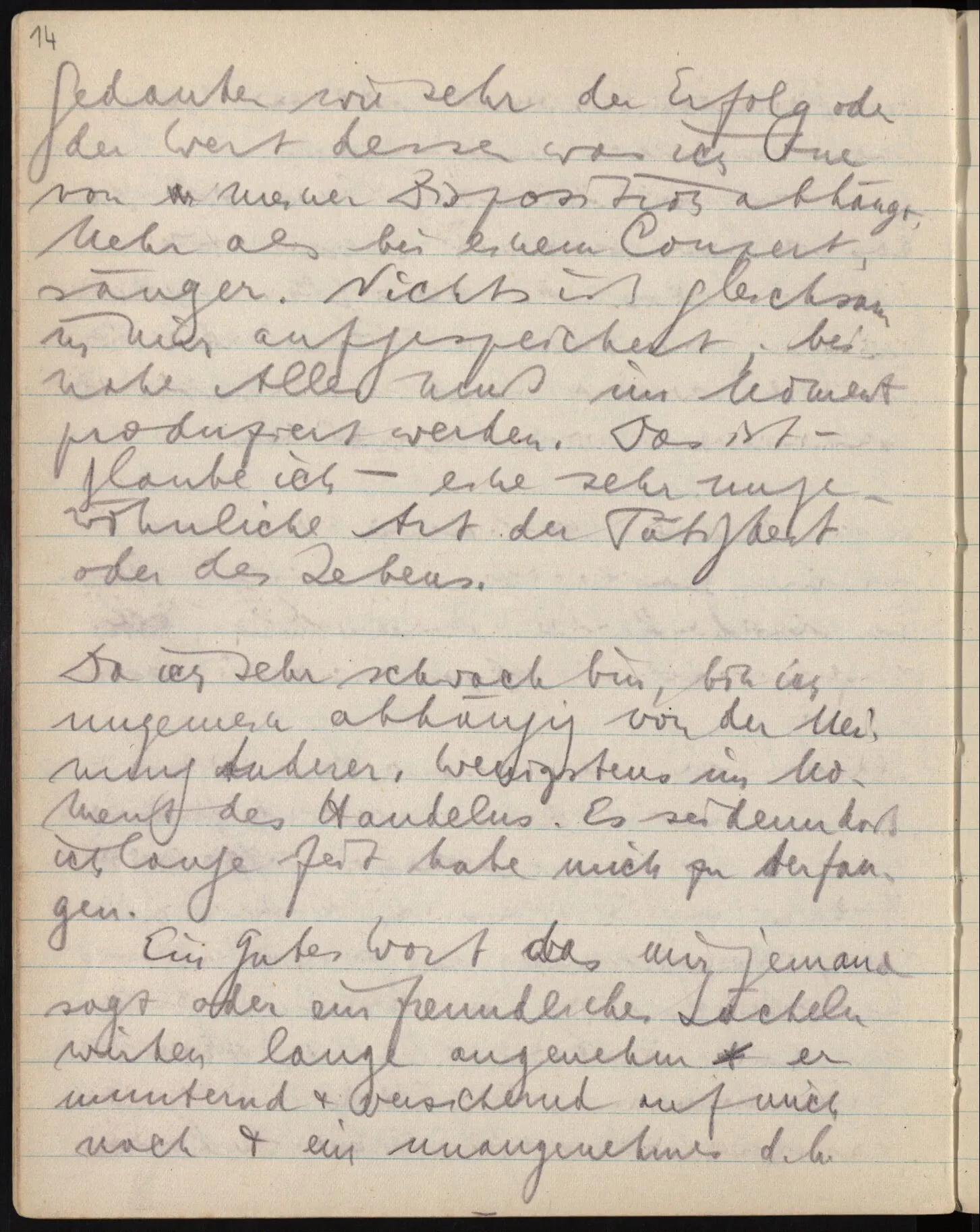 Da ich sehr schwach bin, bin ich ungemein abhängig von der Meinung Anderer. Wenigstens im Moment des Handelns. Es sei denn daß ich lange Zeit habe mich zu derfangen. Ein gutes Wort das mir jemand sagt oder ein freundliches Lächeln wirken lange angenehm ermunternd & versichernd auf mich nach & ein unangenehmes d.h. unfreundliches Wort ebenso lange bedrückend. Am wohltätigsten ist dann das Alleinsein in meinem Zimmer dort stelle ich das Gleichgewicht wieder her. Zum mindesten das geistige wenn auch die Nerven den Eindruck noch behalten.