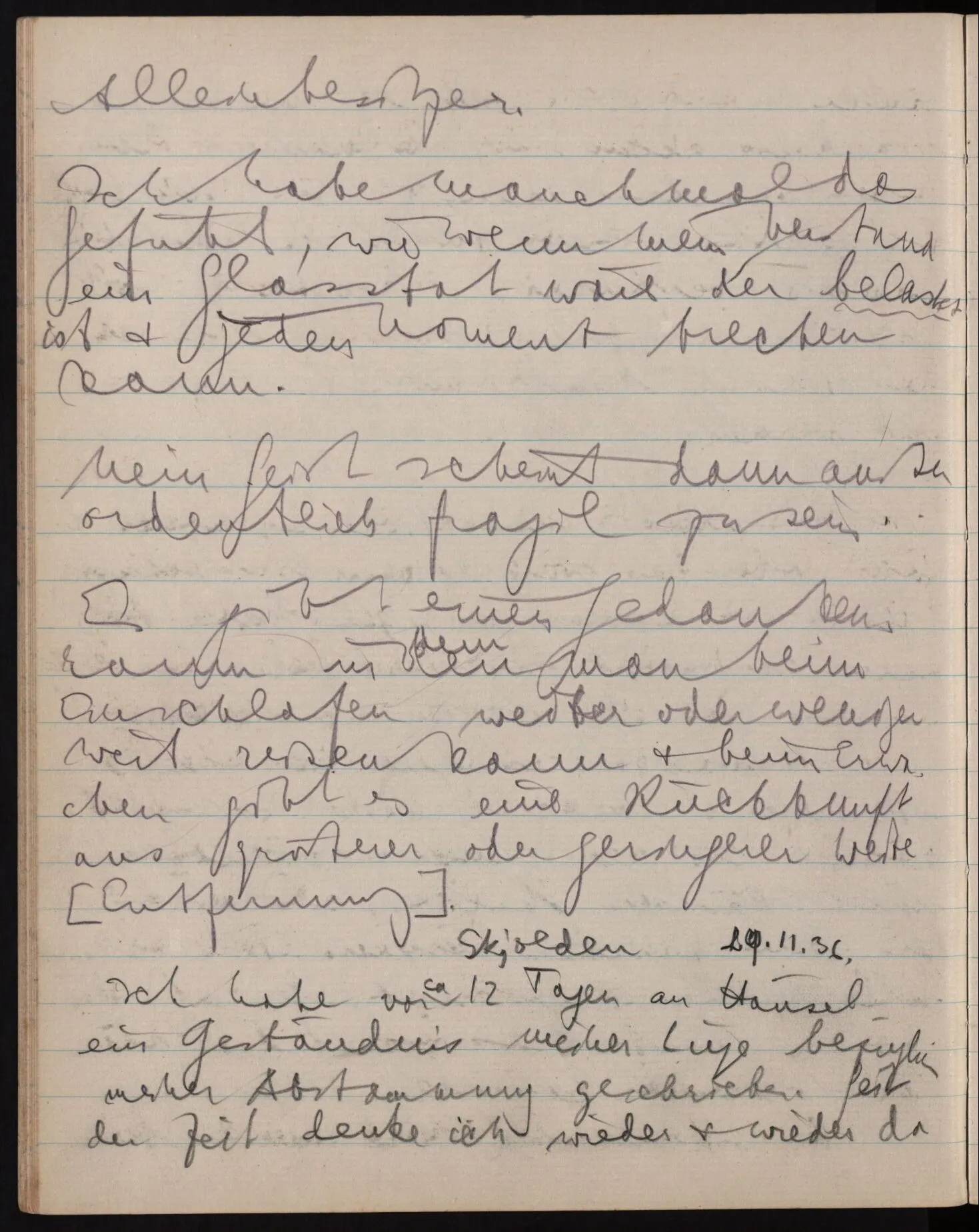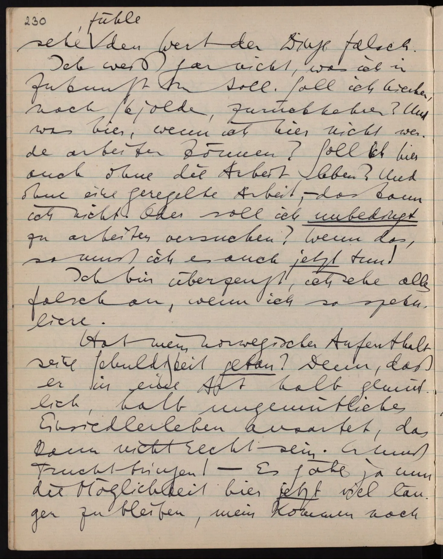 05.04.1937 Möge ich doch das Leben sehen, wie es ist. D.h. es mehr als Ganzes sehen, & nicht bloß einen kleinen, winzigen, Ausschnitt, ich meine z.B.: meine Arbeit. Es ist dann als ob alles andere durch eine dunkle Blende abgeblendet wäre & nur dieses Stück sichtbar. Dadurch erscheint alles falsch. Ich sehe, fühle den Wert der Dinge falsch. Ich weiß gar nicht, was ich in Zukunft tun soll. Soll ich hierher, nach Skjolden, zurückkehren? Und was hier, wenn ich hier nicht werde arbeiten können? Soll ich hier auch ohne die Arbeit leben? Und ohne eine geregelte Arbeit, – das kann ich nicht. Oder soll ich unbedingt zu arbeiten versuchen? Wenn das, so muß ich es auch jetzt tun! Ich bin überzeugt, ich sehe alles falsch an, wenn ich so spekuliere. Hat mein norwegischer Aufenthalt seine Schuldigkeit getan? Denn, daß er in eine Art halb gemütlich, halb ungemütliches Einsiedlerleben ausartet, das kann nicht recht sein. Er muß Frucht bringen! – Es gäbe ja nun die Möglichkeit hier jetzt viel länger zu bleiben, mein Kommen nach Wien & England zu verschieben. Und die Frage ist: Könnte ich mich dazu entschließen, etwa noch zwei Monate hier zu bleiben? Gott, ich glaube ja! Nur sorge ich mich um meinen Freund & ich will nicht meine Leute in Wien enttäuschen. Ich glaube, ich kann es wohl auf mich nehmen, hier zu bleiben, wenn ich mit ganzem Herzen hier sein kann; wenn es einfach meine Aufgabe ist, hier zu bleiben; & zu warten, ob ich werde gut arbeiten können. Anderseits ist wahr, daß mich jetzt etwas von hier wegtreibt. Ich fühle mich stumpf, möchte weg & nach einiger Zeit frisch zurückkommen. – Eines ist sicher ich ermüde jetzt sehr rasch durch meine Arbeit, & dies ist nicht meine Schuld. Nach wenigen Stunden nicht sehr intensiver Arbeit kann ich nicht mehr denken. Es ist so, als wäre ich jetzt müde. Fehlt die richtige Nahrung? Es wäre möglich.