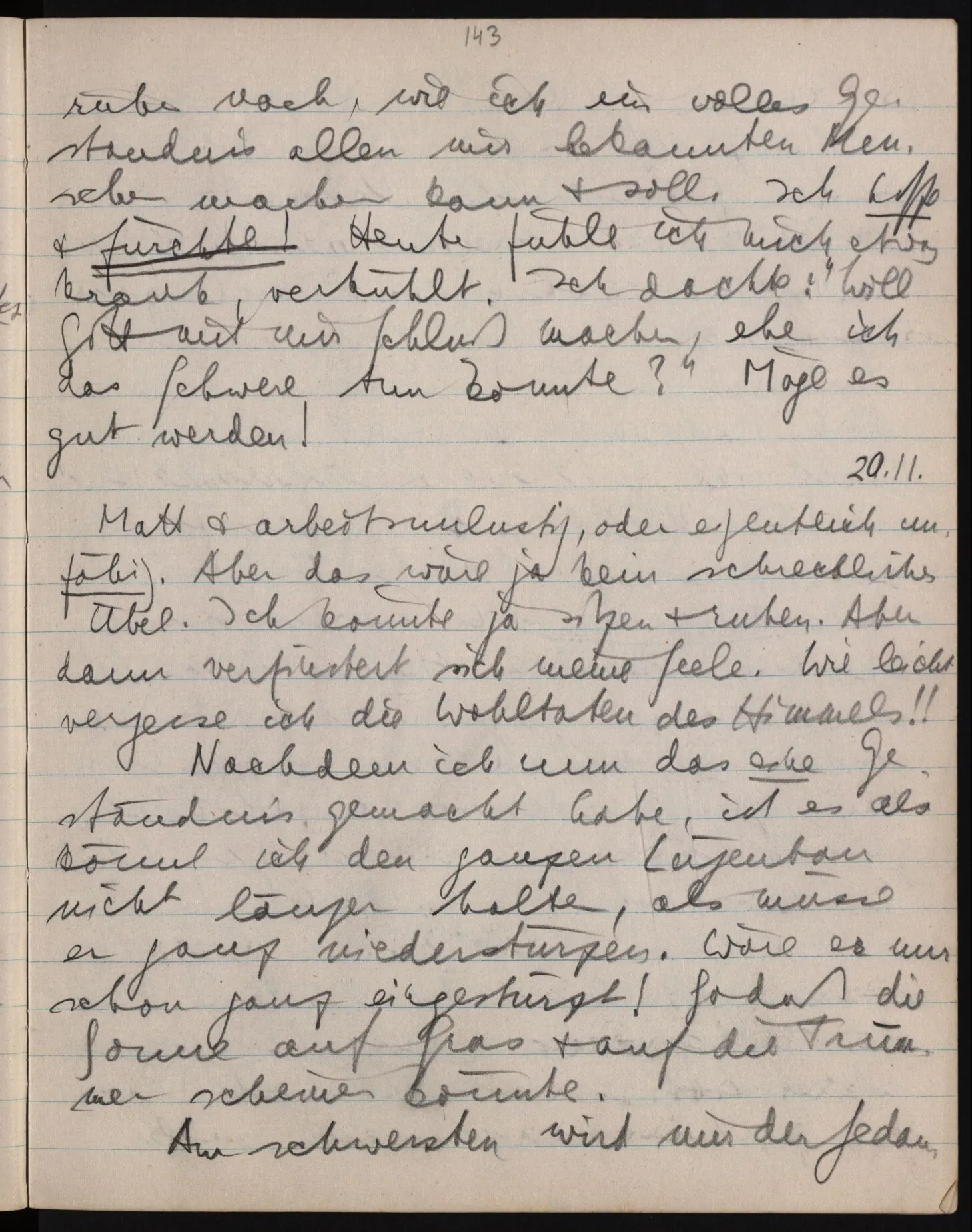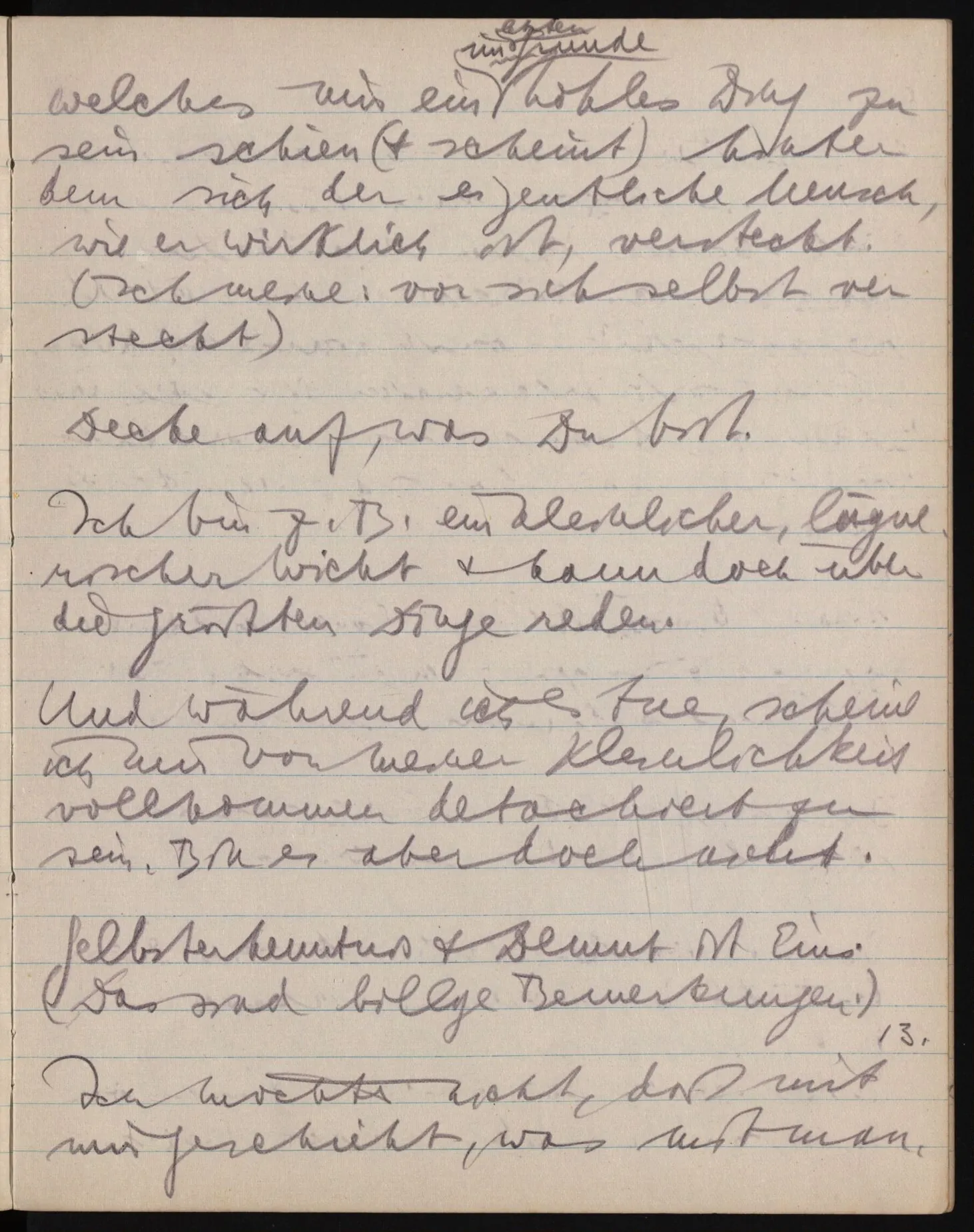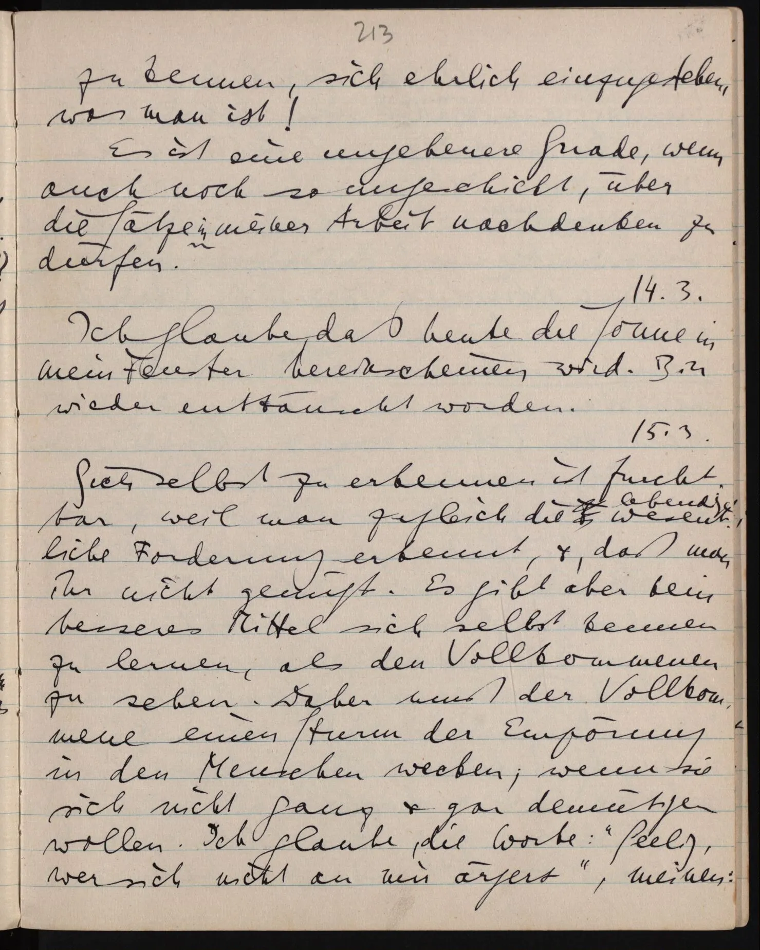 Wie schwer ist es sich selbst 13.03.1937 zu kennen, sich ehrlich einzugestehen, was man ist! Es ist eine ungeheuere Gnade, wenn auch noch so ungeschickt, über die Sätze in meiner Arbeit nachdenken zu dürfen.
