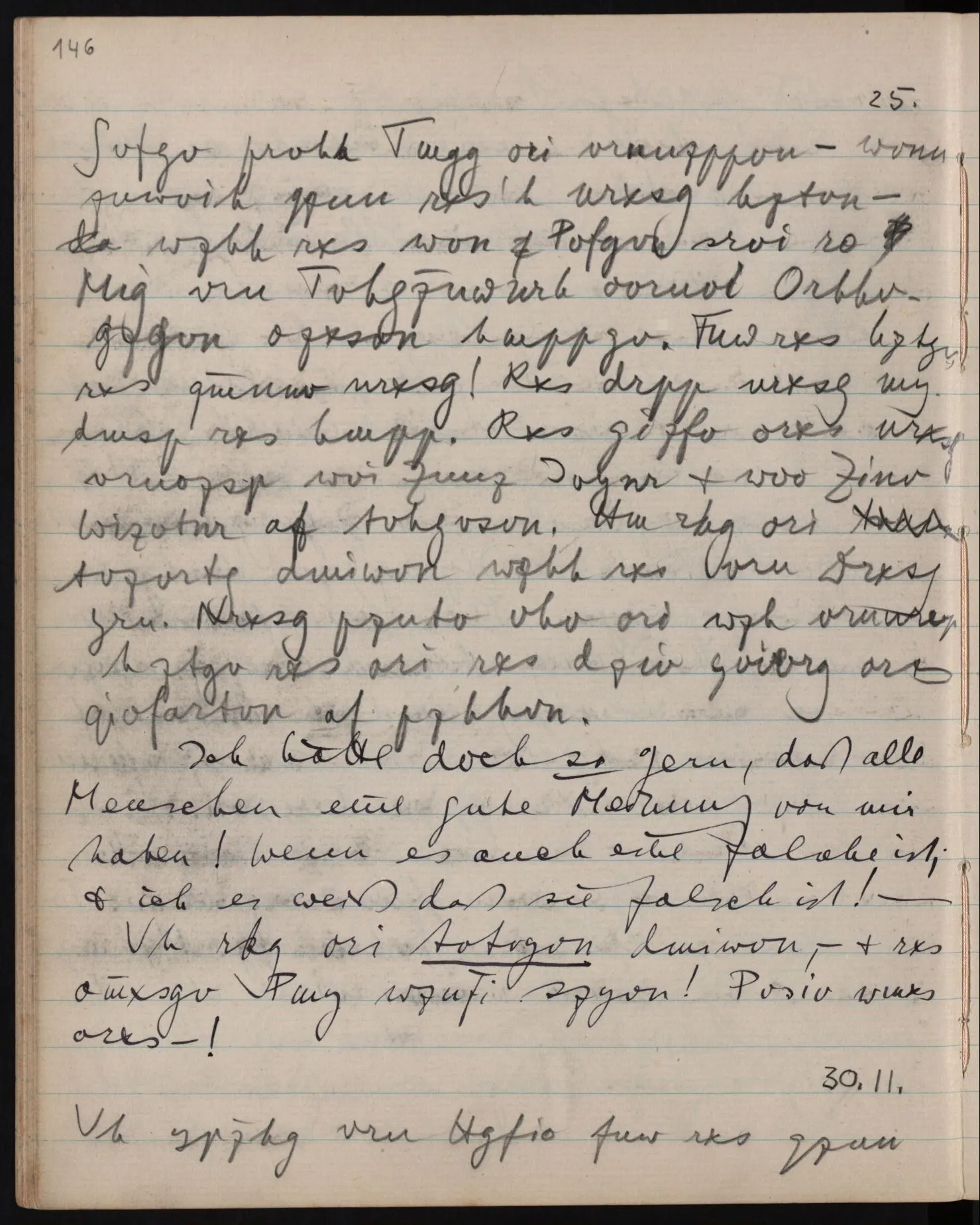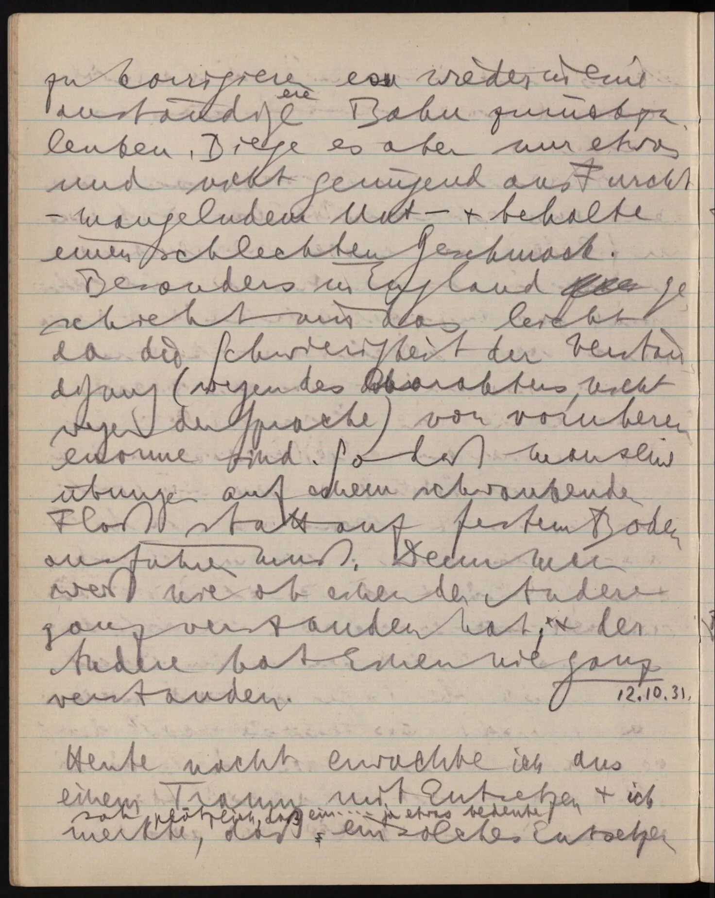 01.05.1930 Bis mir etwas klar wird dauert es außerordentlich lang. – Das ist wahr auf den verschiedensten Gebieten. Mein Verhältnis zu den anderen Menschen z.B. wird mir immer erst nach langer Zeit klar. Es ist als brauchte es kolossal lang bis sich der große Nebelballen verzieht & der Gegenstand selbst sichtbar wird. Während dieser Zeit aber bin ich mir meiner Unklarheit nicht einmal ganz klar bewußt. Und auf einmal sehe ich dann wie die Sache wirklich ist oder war. Darum wäre ich wohl überall unbrauchbar wo halbwegs schnelle Entscheidungen zu treffen sind. Ich bin sozusagen einige Zeit verblendet & erst dann fallen mir die Schuppen von den Augen.