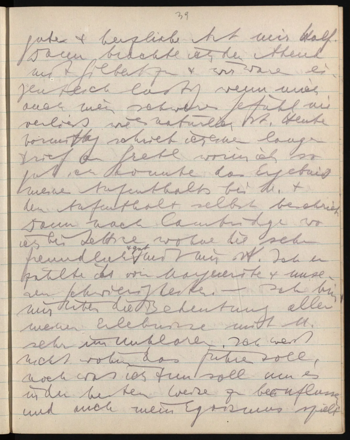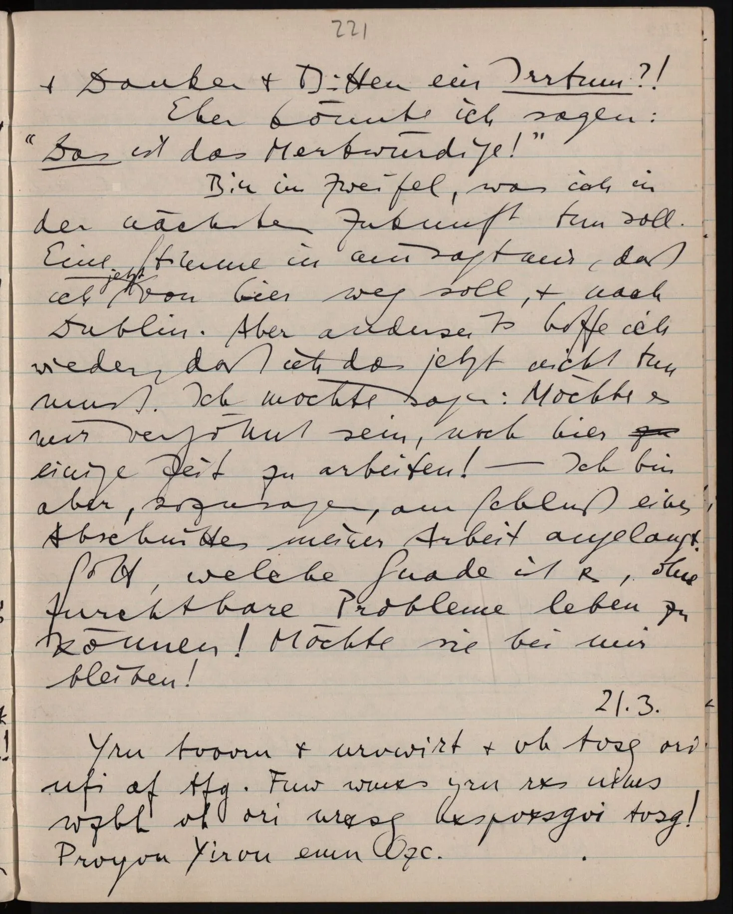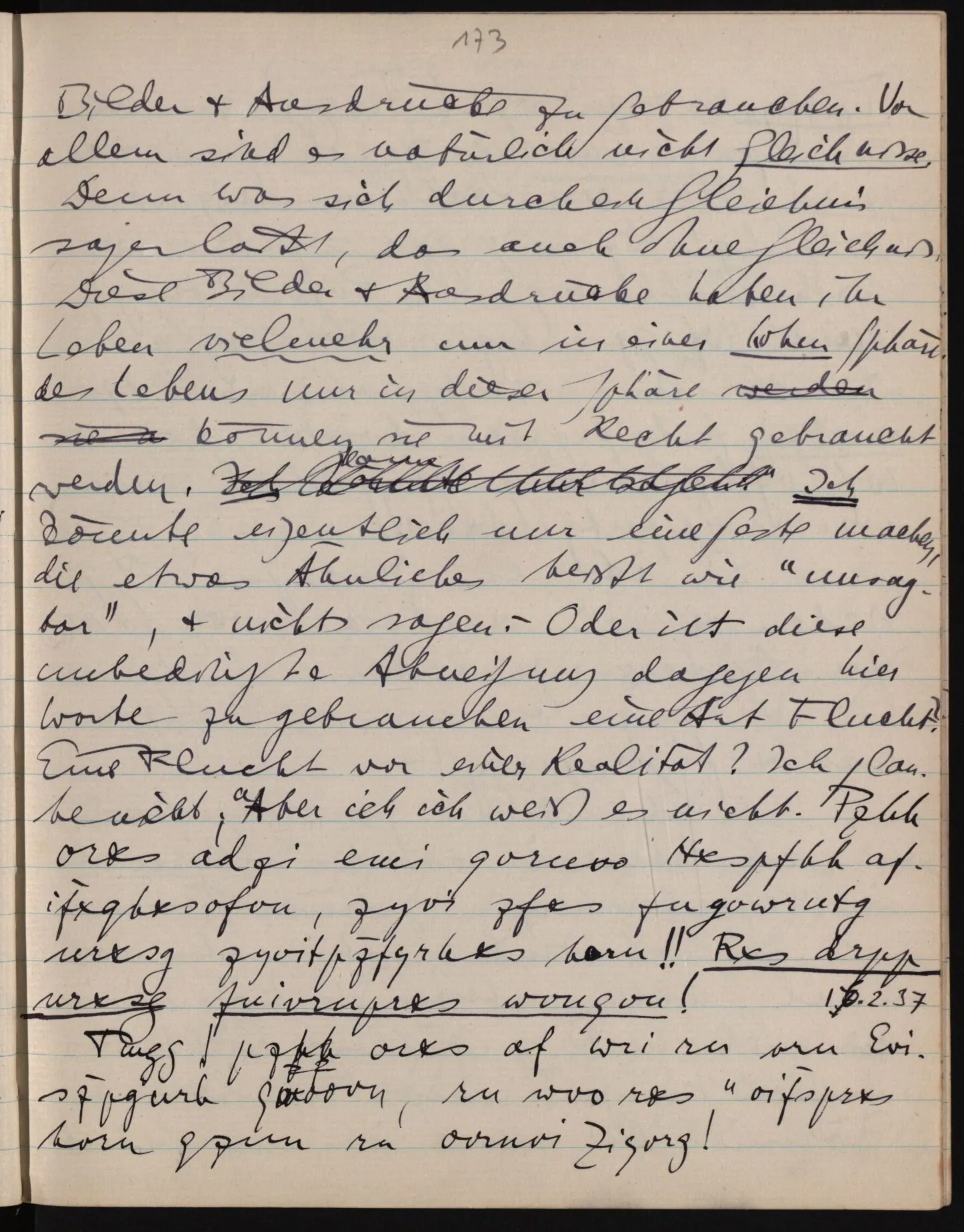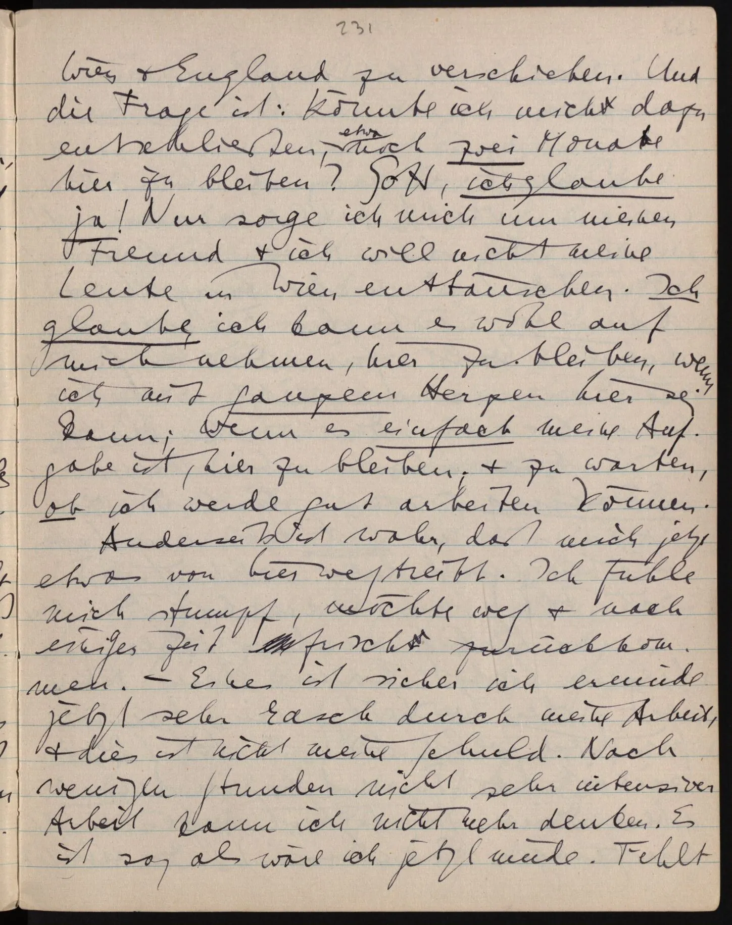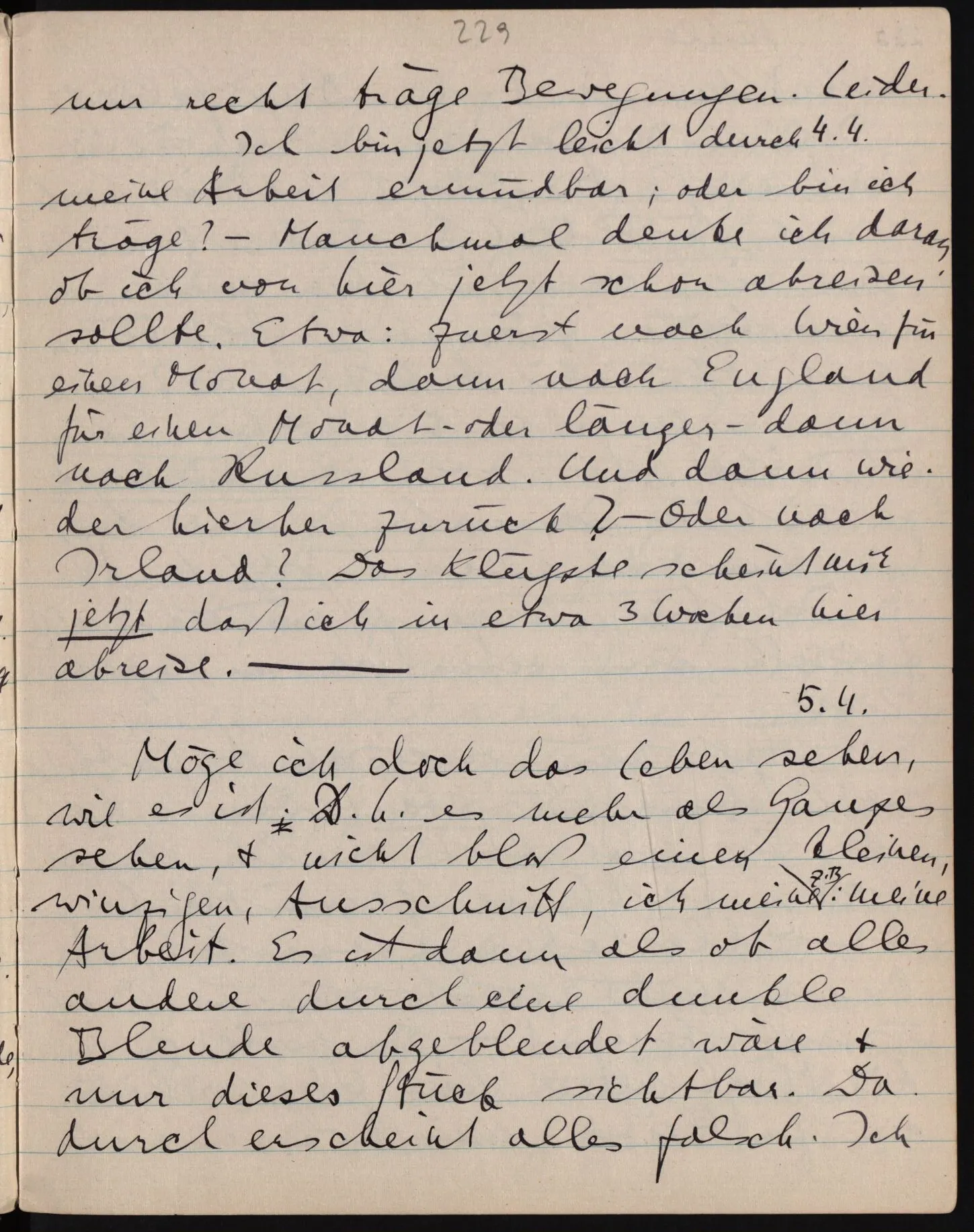 Mein Gehirn macht 02.04.1937 nur recht träge Bewegungen. Leider. Ich bin jetzt leicht durch 04.04.1937 meine Arbeit ermüdbar; oder bin ich träge? – Manchmal denke ich daran ob ich von hier jetzt schon abreisen sollte. Etwa: zuerst nach Wien für einen Monat, dann nach England für einen Monat – oder länger – dann nach Rußland. Und dann wieder hierher zurück? – Oder nach Irland? Das Klügste scheint mir jetzt daß ich in etwa 3 Wochen hier abreise. –
