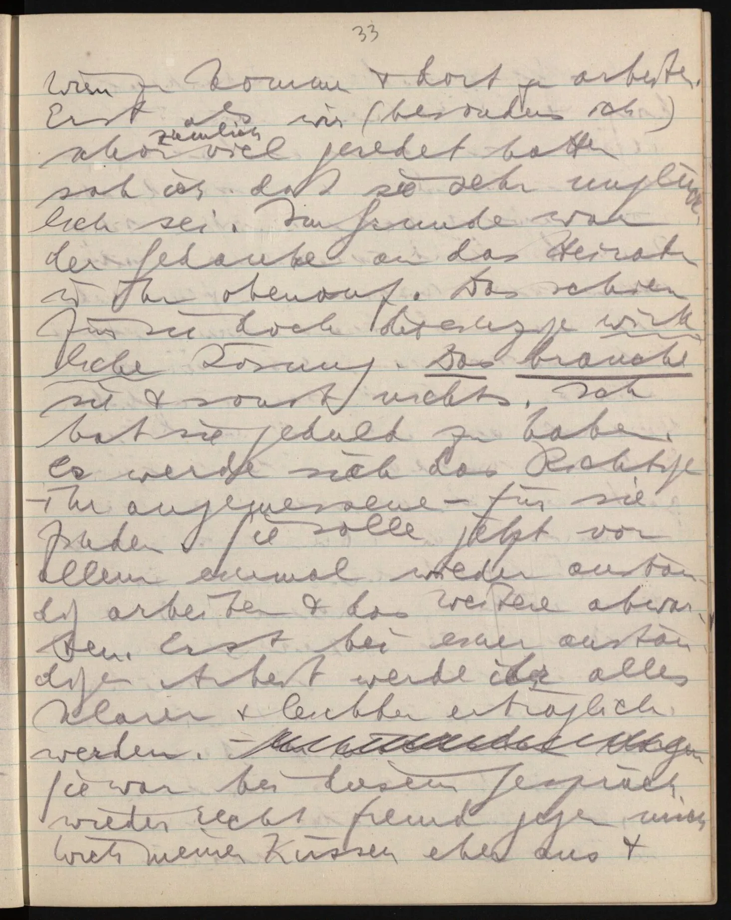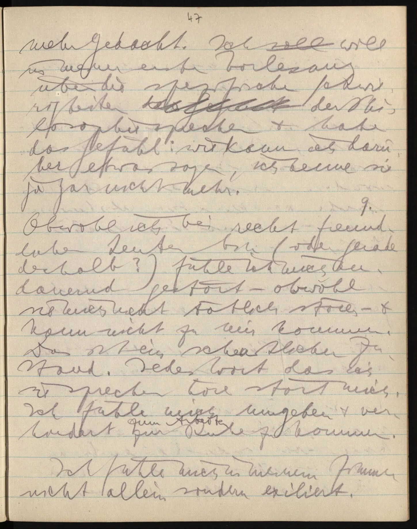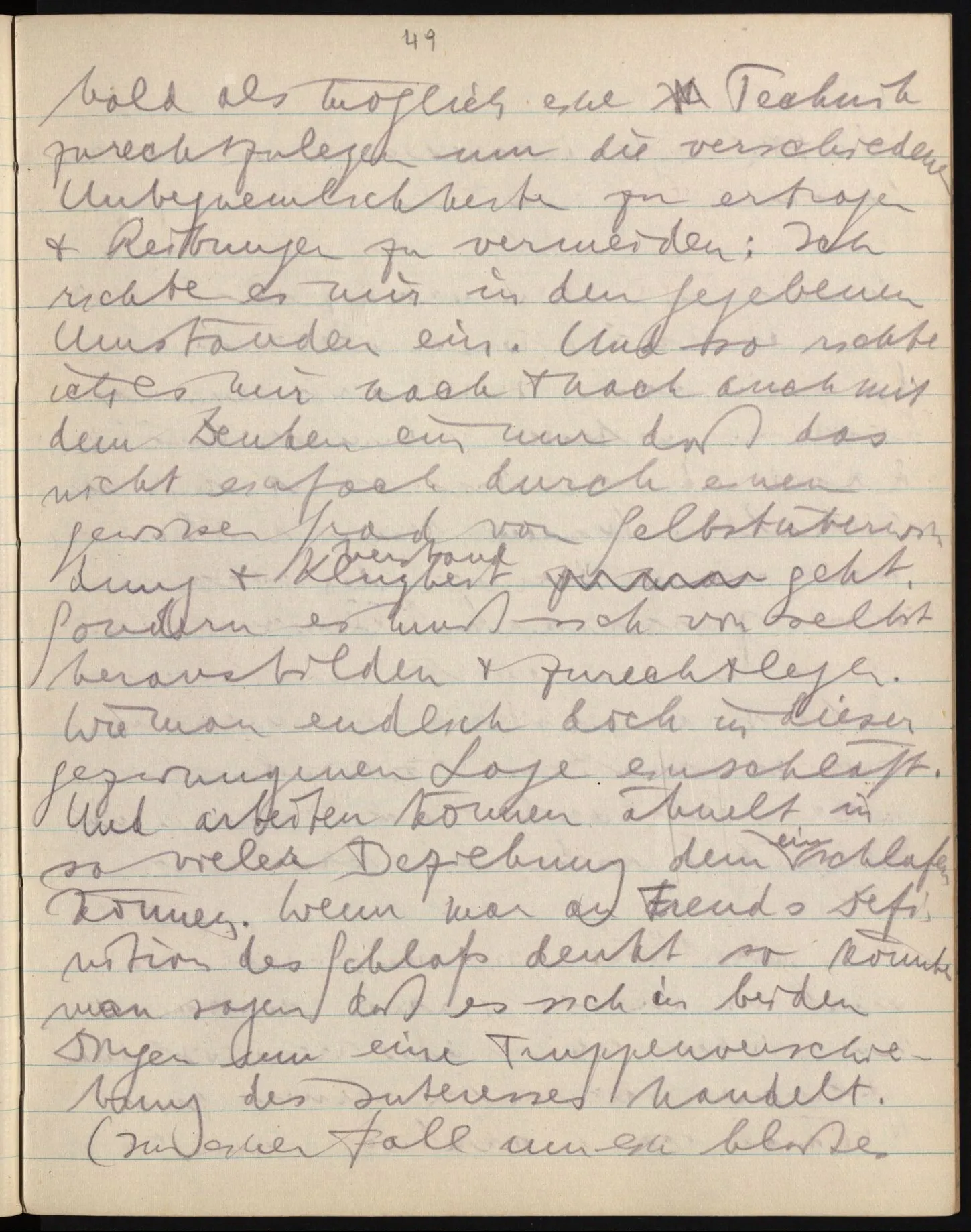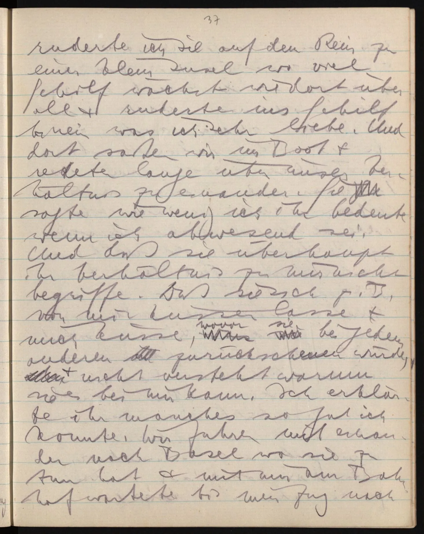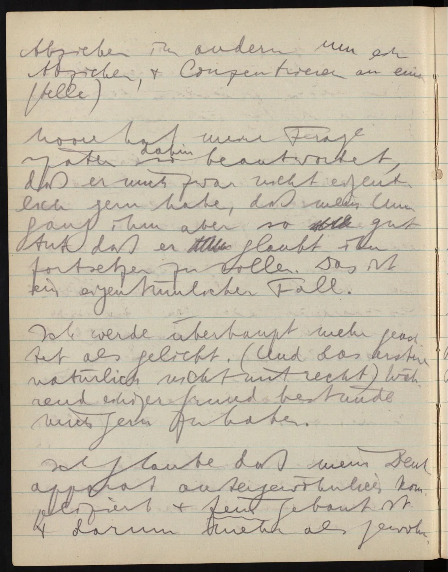 Mein Gehirn macht 02.04.1937 nur recht träge Bewegungen. Leider. Ich bin jetzt leicht durch 04.04.1937 meine Arbeit ermüdbar; oder bin ich träge? – Manchmal denke ich daran ob ich von hier jetzt schon abreisen sollte. Etwa: zuerst nach Wien für einen Monat, dann nach England für einen Monat – oder länger – dann nach Rußland. Und dann wieder hierher zurück? – Oder nach Irland? Das Klügste scheint mir jetzt daß ich in etwa 3 Wochen hier abreise. –