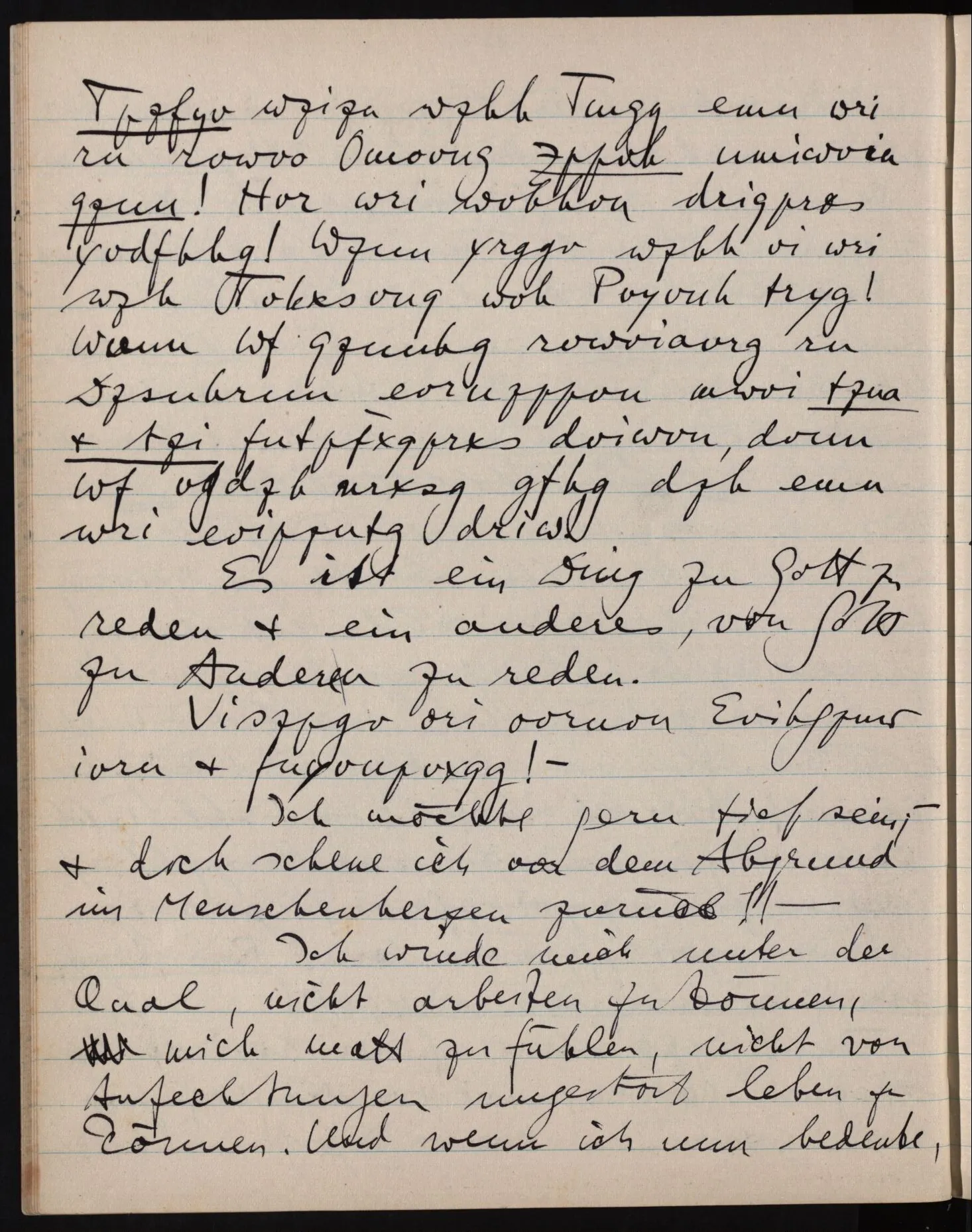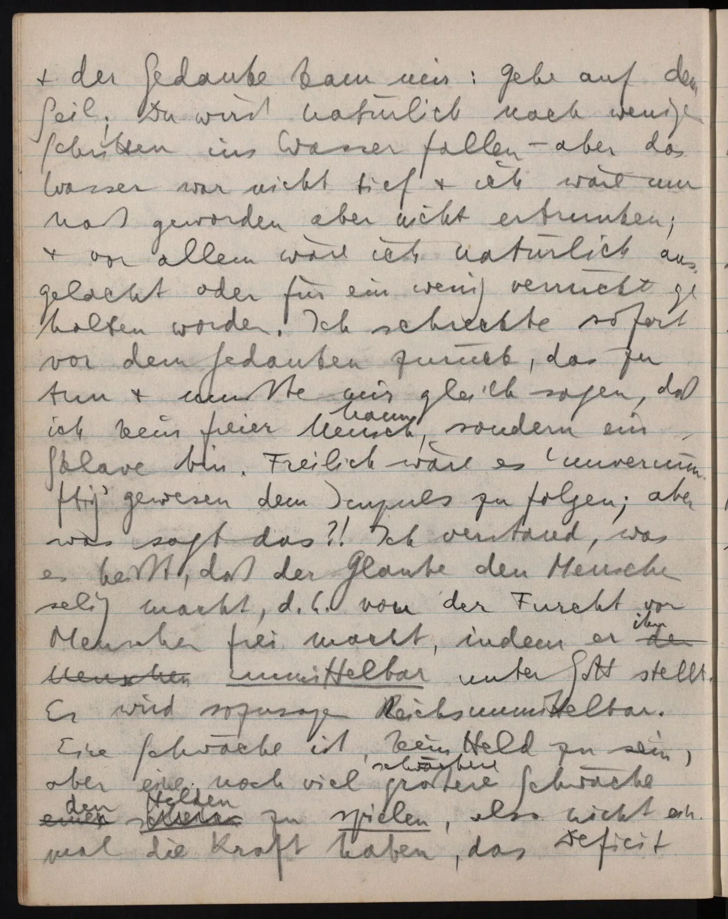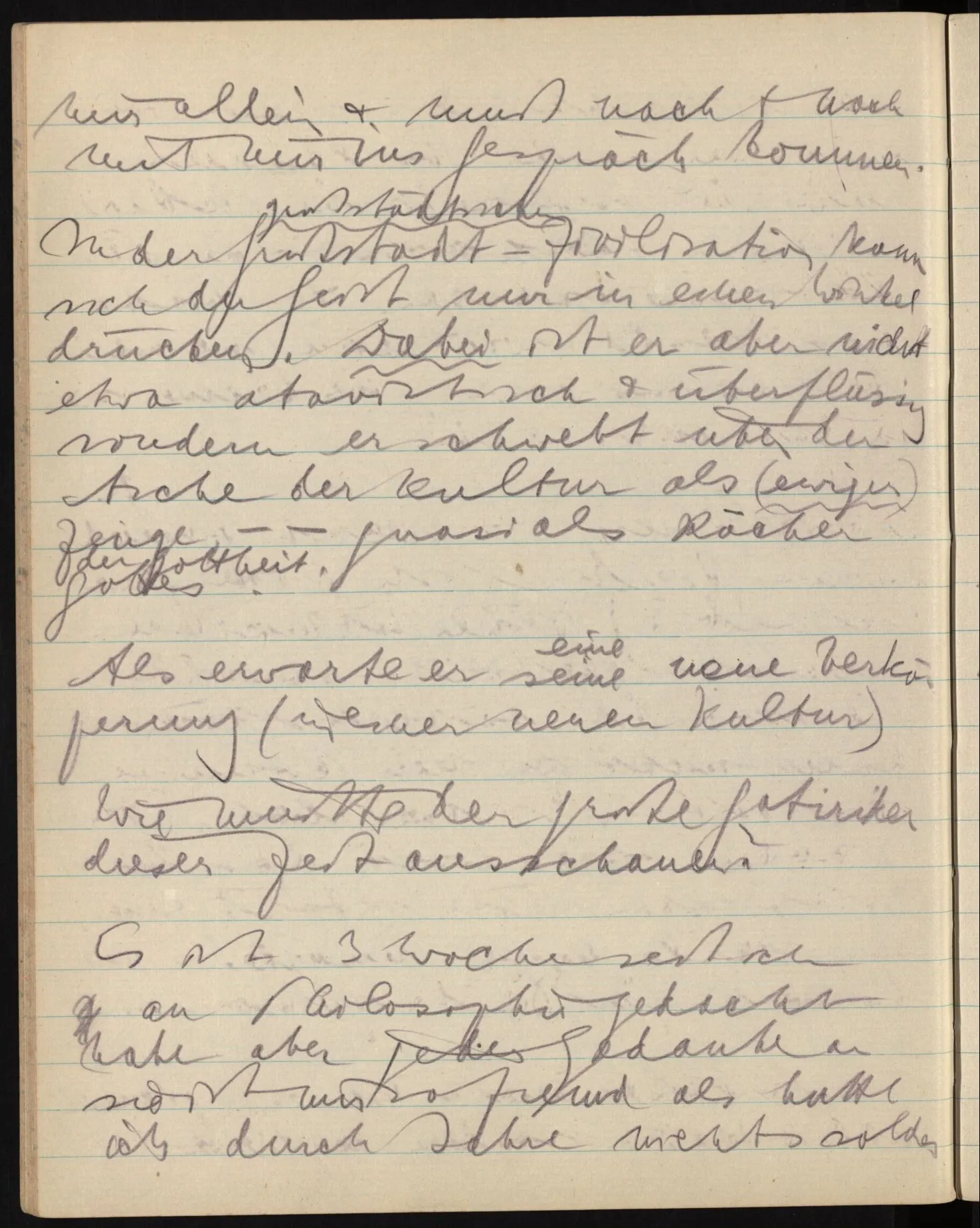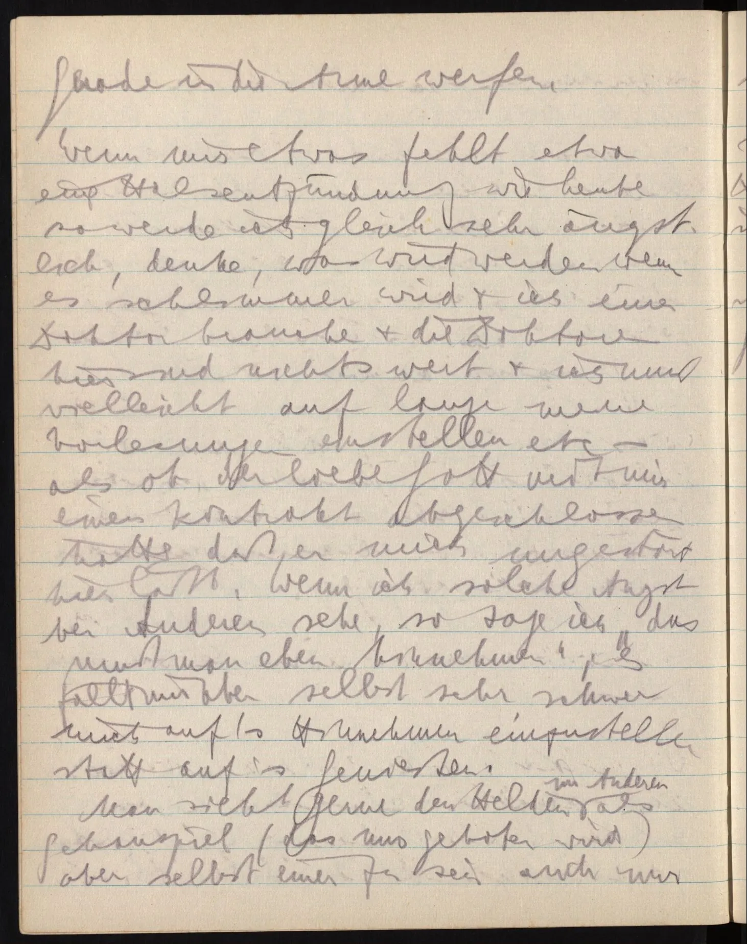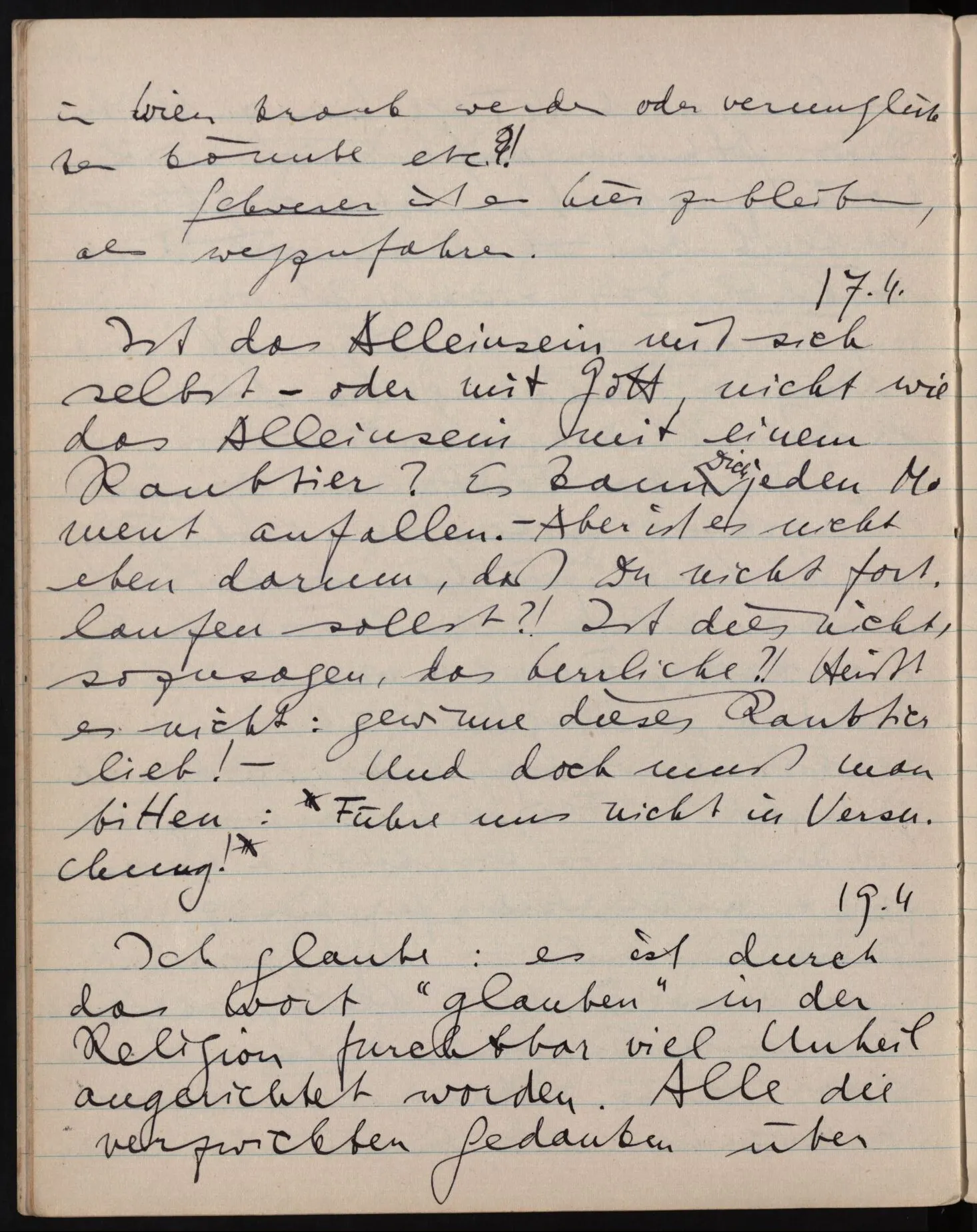 17.04.1937 Ist das Alleinsein mit sich selbst – oder mit Gott, nicht wie das Alleinsein mit einem Raubtier? Es kann Dich jeden Moment anfallen. – Aber ist es nicht eben darum, daß Du nicht fortlaufen sollst?! Ist dies nicht, sozusagen, das herrliche?! Heißt es nicht: gewinne dieses Raubtier lieb! – Und doch muß man bitten: Führe uns nicht in Versuchung!