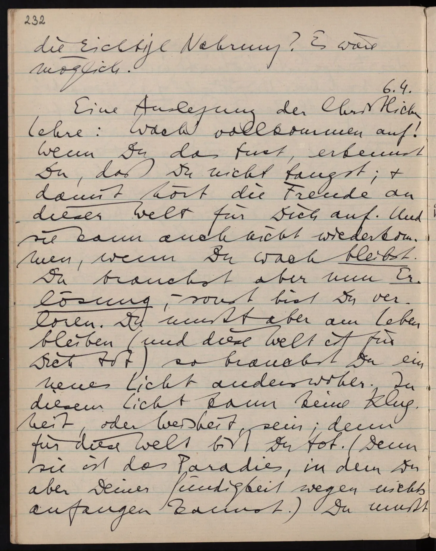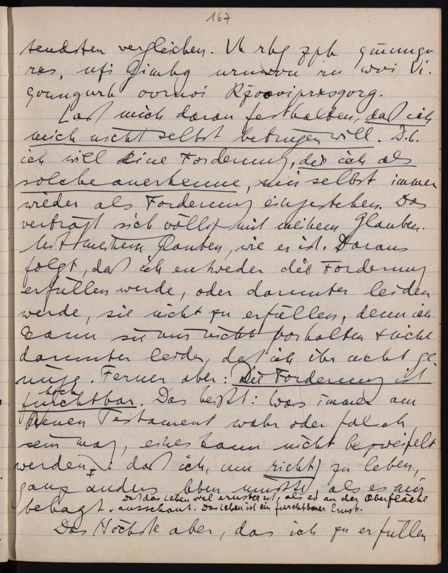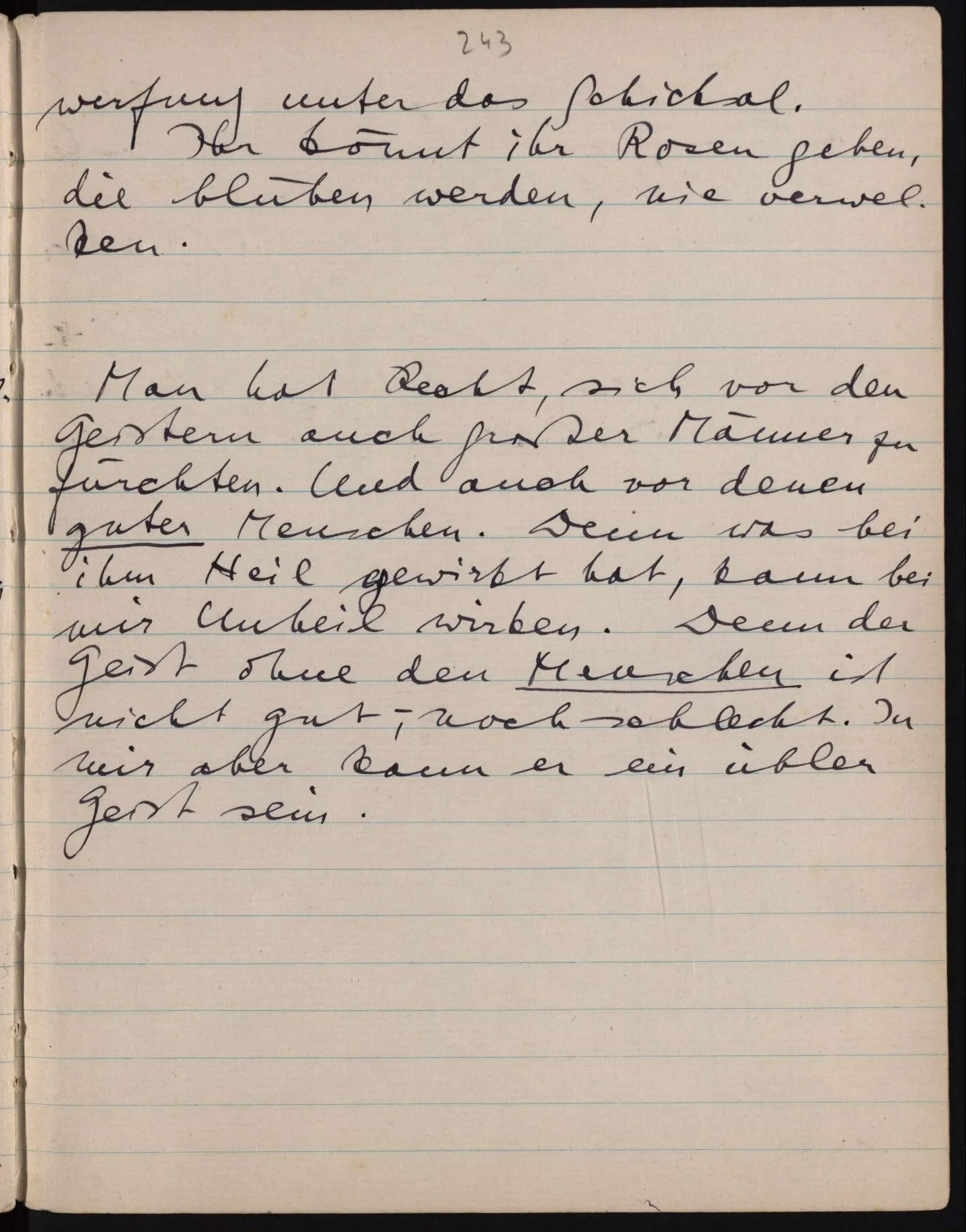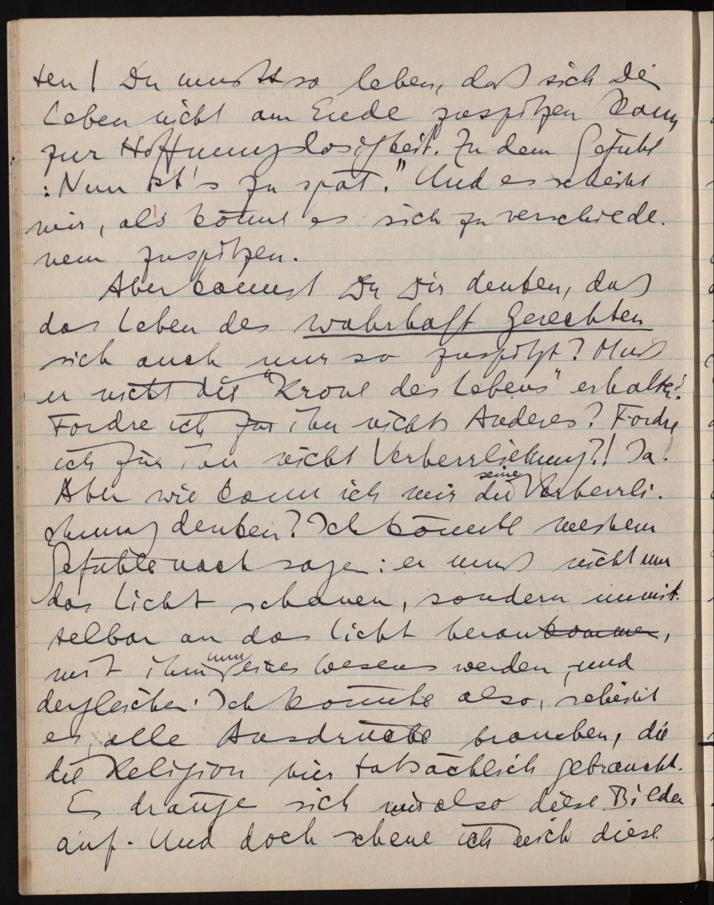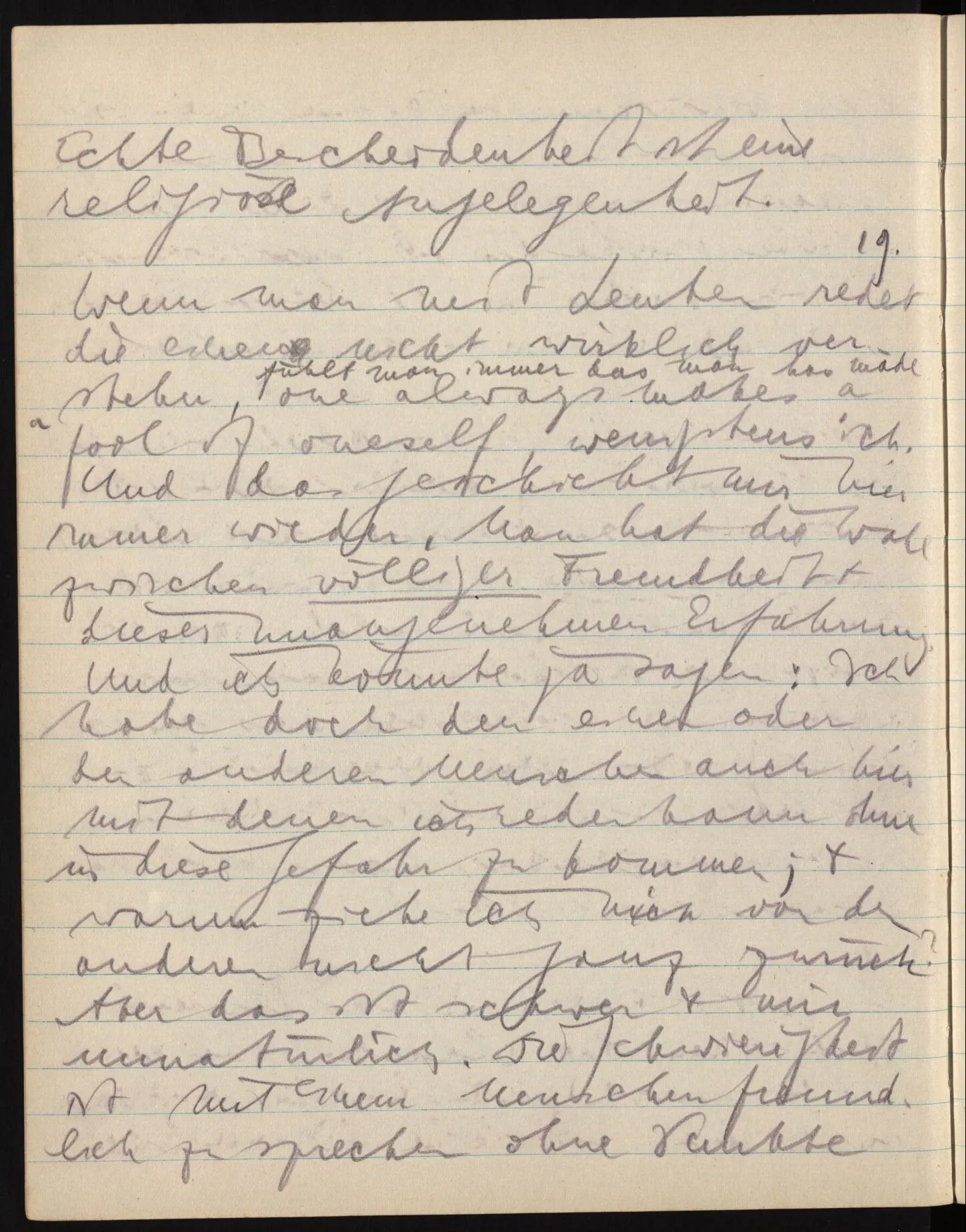 17.04.1937 Ist das Alleinsein mit sich selbst – oder mit Gott, nicht wie das Alleinsein mit einem Raubtier? Es kann Dich jeden Moment anfallen. – Aber ist es nicht eben darum, daß Du nicht fortlaufen sollst?! Ist dies nicht, sozusagen, das herrliche?! Heißt es nicht: gewinne dieses Raubtier lieb! – Und doch muß man bitten: Führe uns nicht in Versuchung!