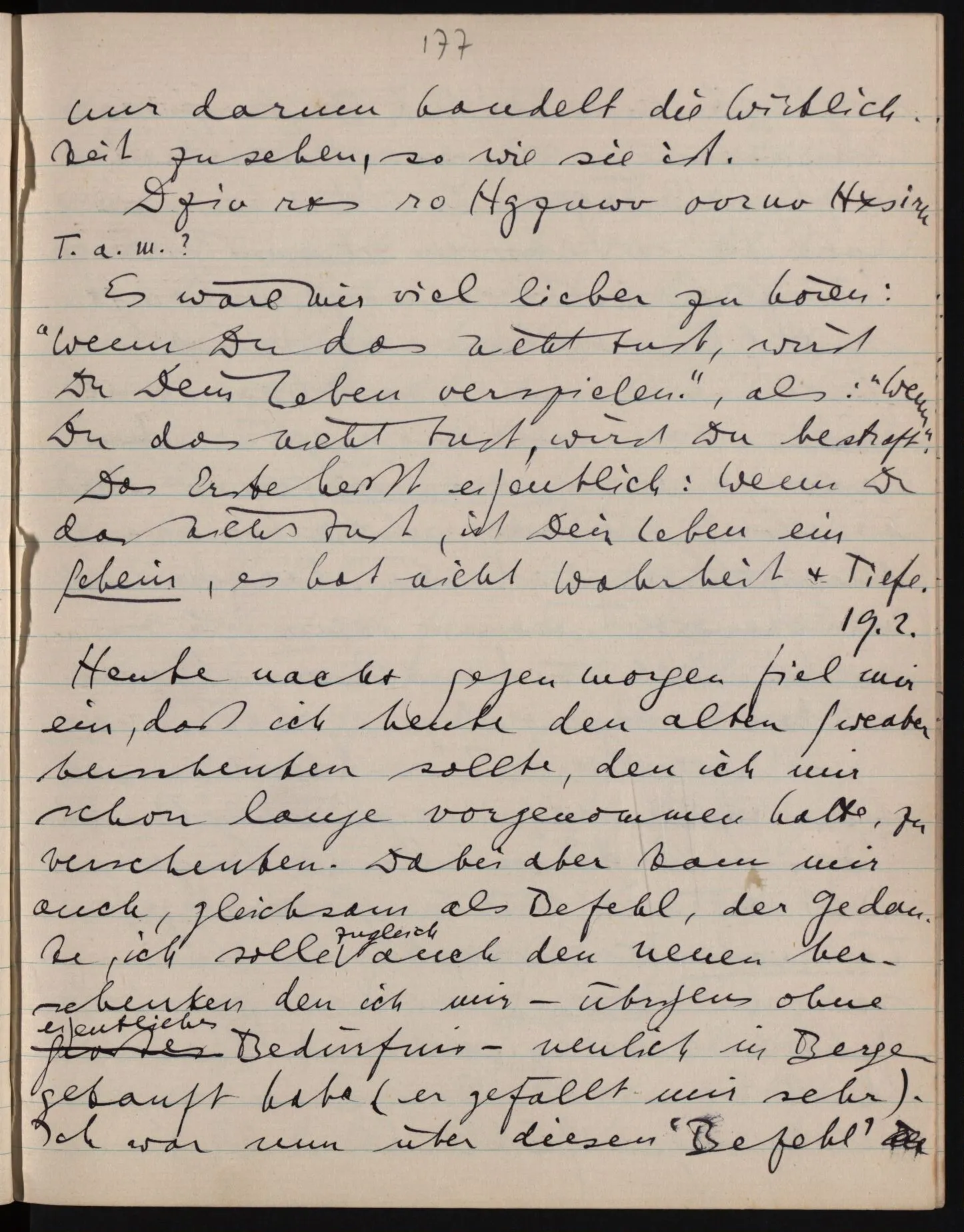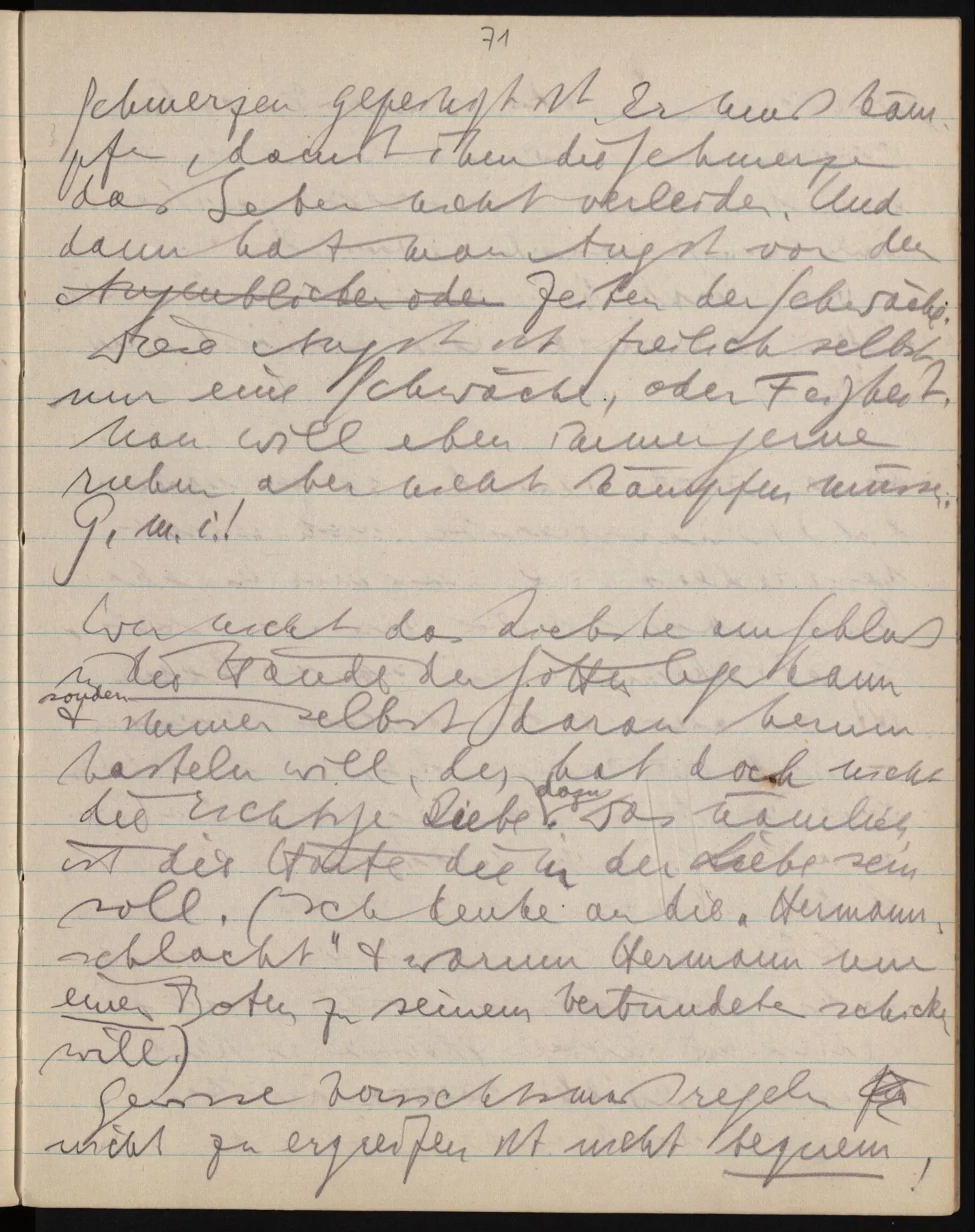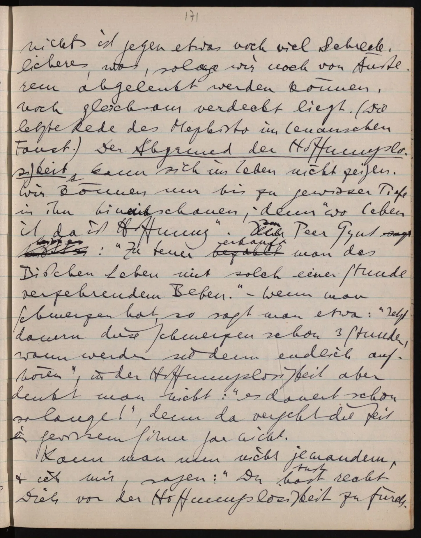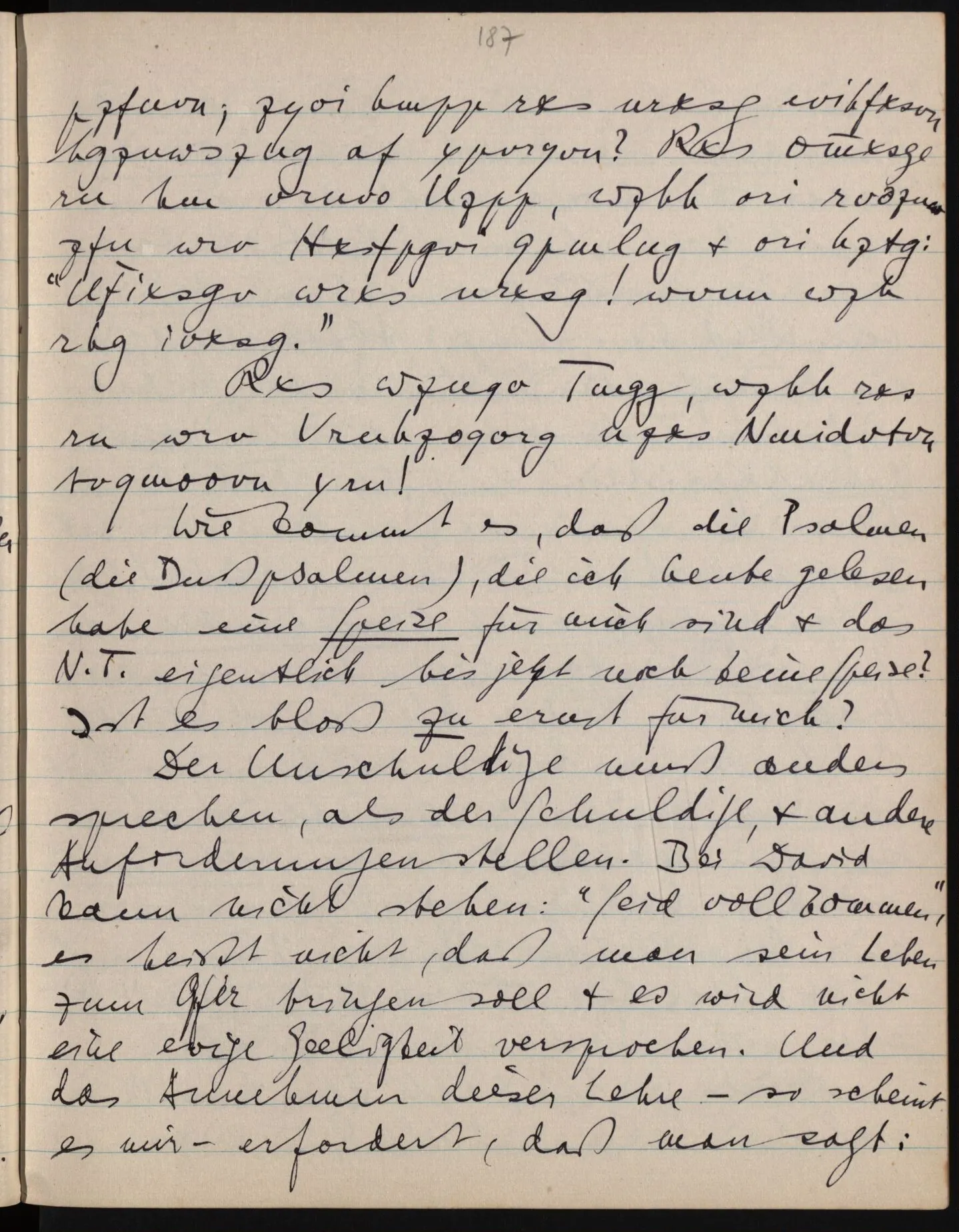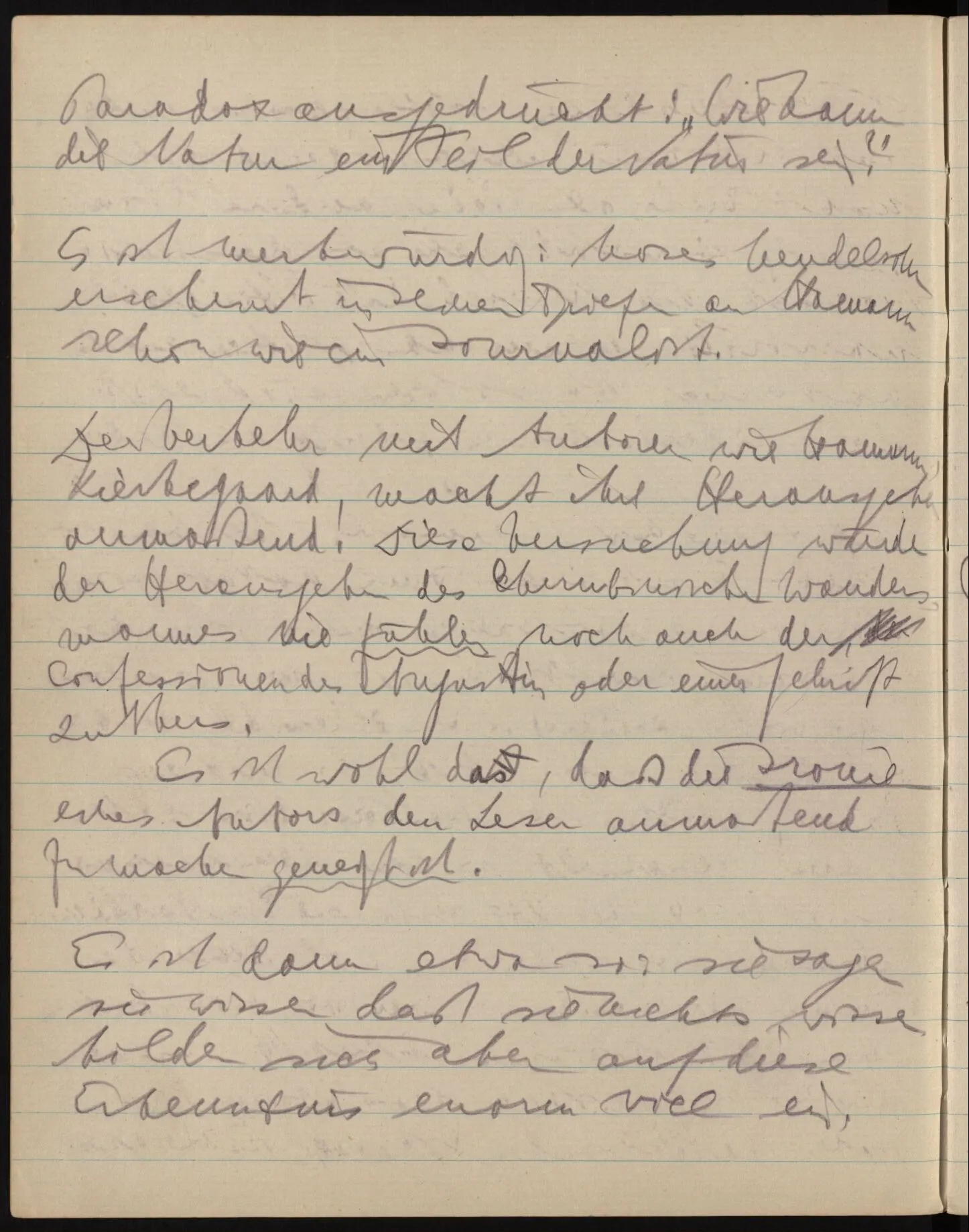 17.04.1937 Ist das Alleinsein mit sich selbst – oder mit Gott, nicht wie das Alleinsein mit einem Raubtier? Es kann Dich jeden Moment anfallen. – Aber ist es nicht eben darum, daß Du nicht fortlaufen sollst?! Ist dies nicht, sozusagen, das herrliche?! Heißt es nicht: gewinne dieses Raubtier lieb! – Und doch muß man bitten: Führe uns nicht in Versuchung!