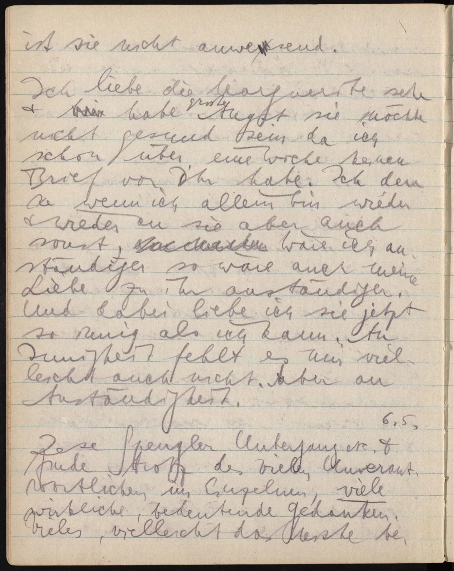 06.05.1930 Lese Spengler Untergang etc. & finde trotz des vielen Unverantwortlichen im Einzelnen, viele wirkliche, bedeutende Gedanken. Vieles, vielleicht das Meiste berührt sich ganz mit dem was ich selbst oft gedacht habe. Die Möglichkeit einer Mehrzahl abgeschlossener Systeme welche wenn man sie einmal hat ausschauen als sei das eine die Fortsetzung des Anderen. Und das hängt alles auch mit dem Gedanken zusammen, daß wir gar nicht wissen (bedenken) wieviel dem Menschen genommen – oder auch gegeben – werden kann.