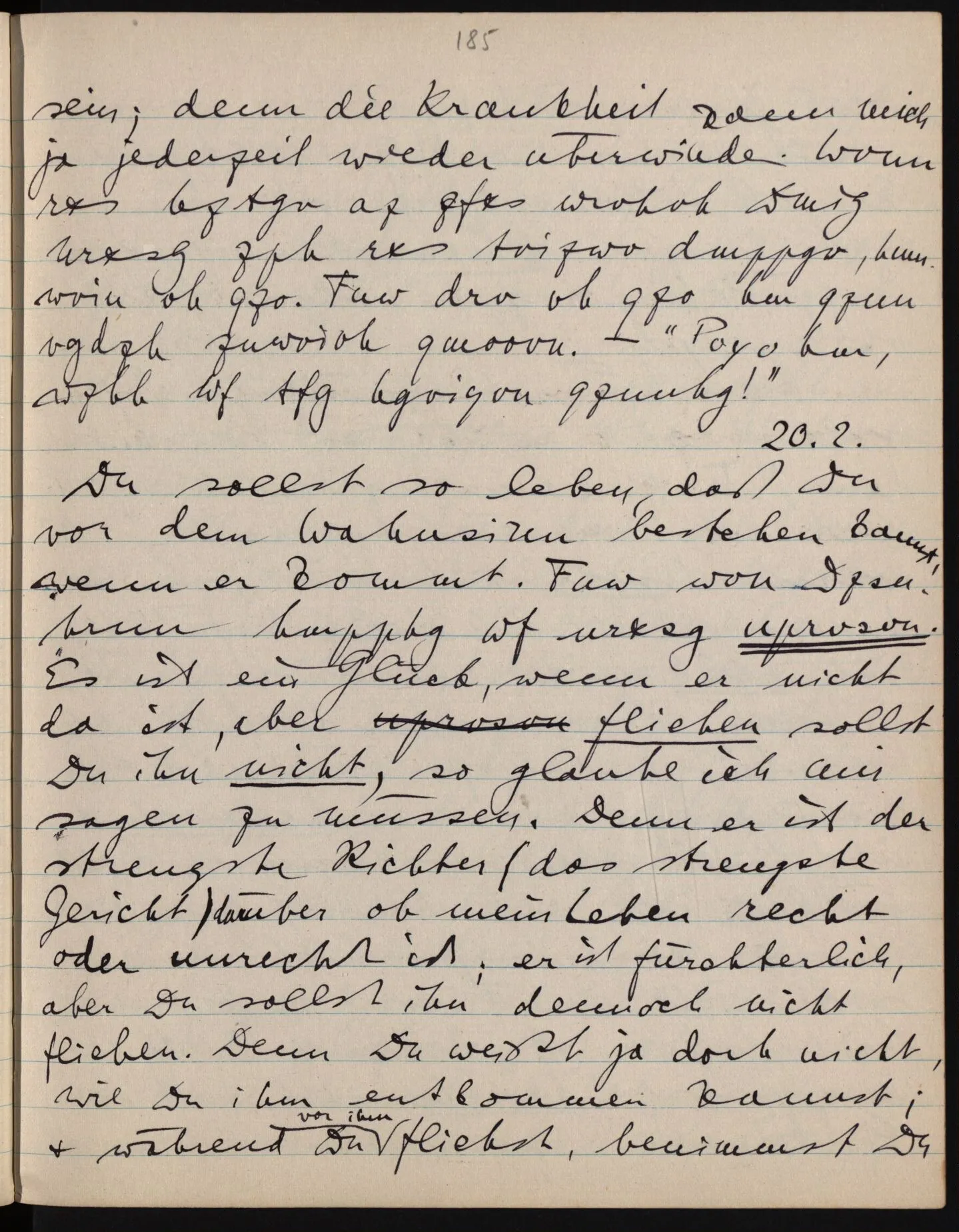 18.03.1937 Die Sonne dürfte jetzt über dem Berg stehen, aber sie ist des Wetters wegen nicht zu sehen. Wenn Du mit Gott rechten willst, so heißt das, Du hast einen falschen Begriff von Gott, es ist ein Aberglaube Du hast einen unrichtigen Begriff, wenn Du auf das Schicksal erzürnt bist. Du sollst Deine Begriffe umstellen. Zufriedenheit mit Deinem Schicksal muß das erste Gebot der Weisheit sein. Ich habe heute die Sonne von meinem Fenster gesehen in dem Augenblick, als sie anfing hinter dem westlichen Berg aufzugehen. Gott sei Dank. Aber ich glaube nun, zu meiner Schande, daß mir dieses Wort nicht genug vom Herzen gekommen ist. Denn ich war wohl froh, als ich die Sonne nun wirklich erblickte, aber meine Freude war doch zu wenig tief, zu lustig, nicht wahrhaft religiös. Oh, wäre ich doch tiefer!
