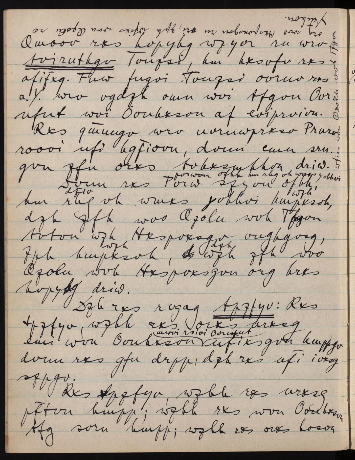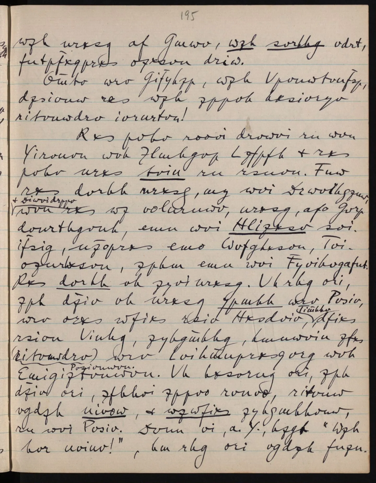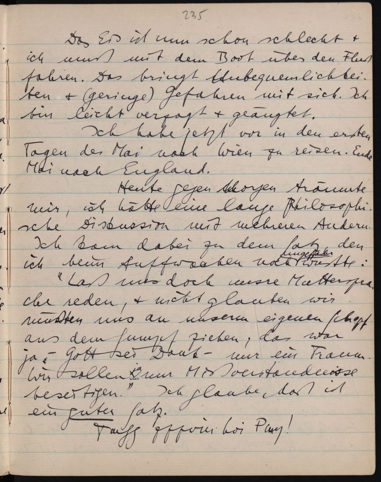 11.04.1937 Das Eis ist nun schon schlecht & ich muß mit dem Boot über den Fluß fahren. Das bringt Unbequemlichkeiten & (geringe) Gefahren mit sich. Ich bin leicht verzagt & geängstet. Ich habe jetzt vor in den ersten Tagen des Mai nach Wien zu reisen. Ende Mai nach England. Heute gegen Morgen träumte mir, ich hätte eine lange philosophische Diskussion mit mehreren Andern. Ich kam dabei zu dem Satz, den ich beim Aufwachen noch ungefähr wußte: “Laß uns doch unsre Muttersprache reden, & nicht glauben wir müßten uns an unserm eigenen Schopf aus dem Sumpf ziehen; das war ja – Gott sei Dank – nur ein Traum. Wir sollen ja nur Mißverständnisse beseitigen.” Ich glaube, das ist ein guter Satz. Gott allein sei Lob!