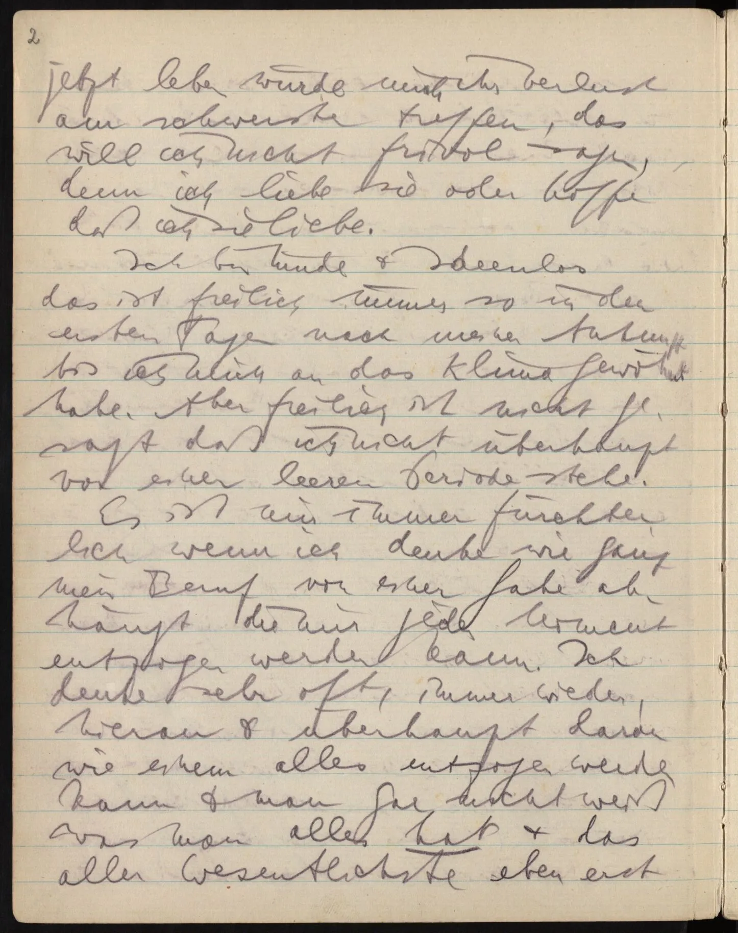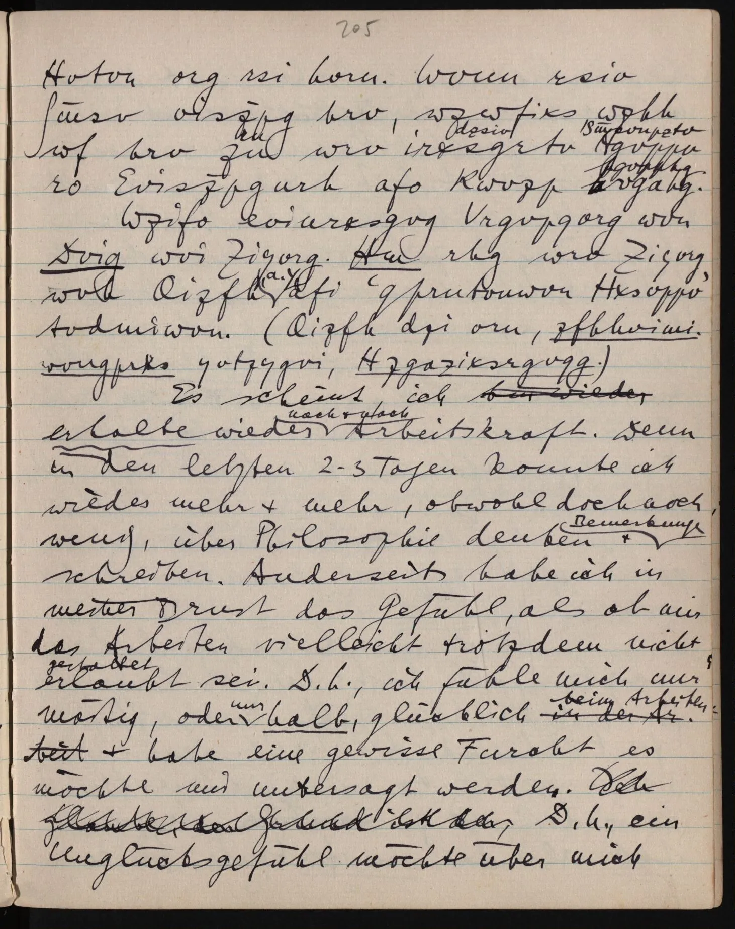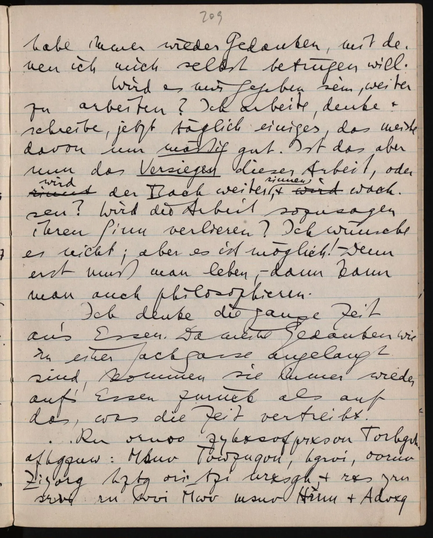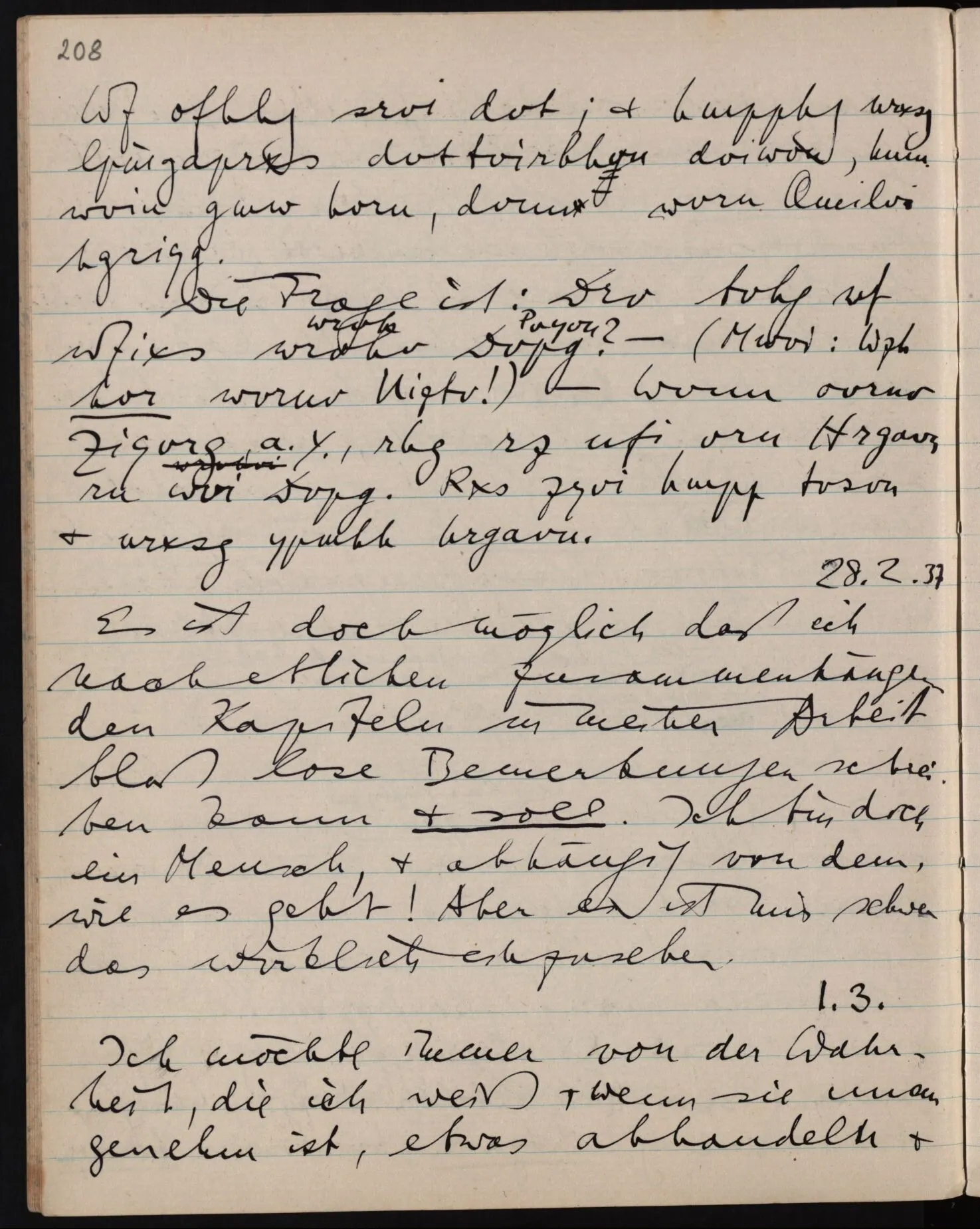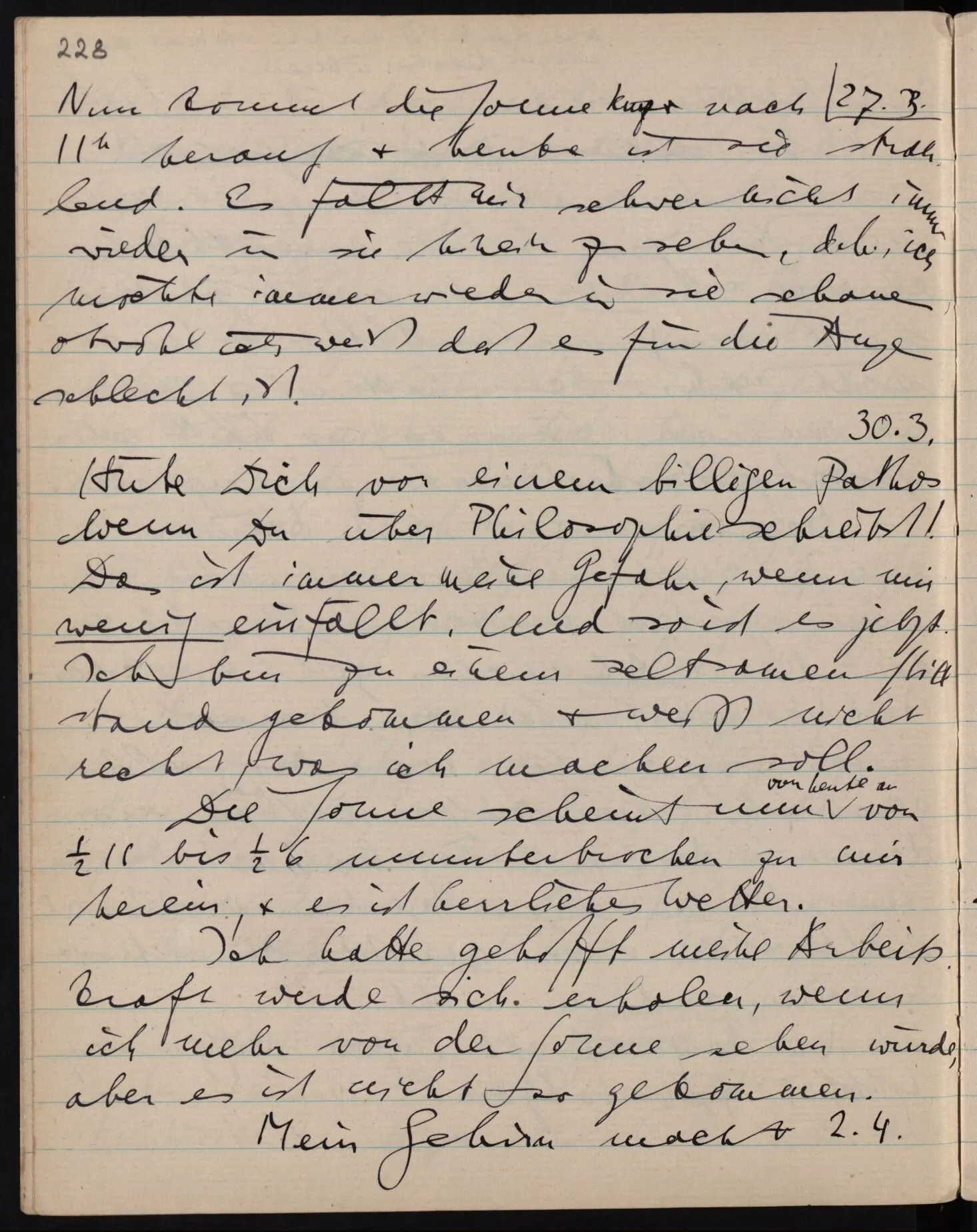 30.03.1937 Hüte Dich vor einem billigen Pathos wenn Du über Philosophie schreibst! Das ist immer meine Gefahr, wenn mir wenig einfällt. Und so ist es jetzt. Ich bin zu einem seltsamen Stillstand gekommen & weiß nicht recht, was ich machen soll. Die Sonne scheint nun von heute an von ½11 bis ½6 ununterbrochen zu mir herein, & es ist herrliches Wetter. Ich hatte gehofft meine Arbeitskraft werde sich erholen, wenn ich mehr von der Sonne sehen würde, aber es ist nicht so gekommen.