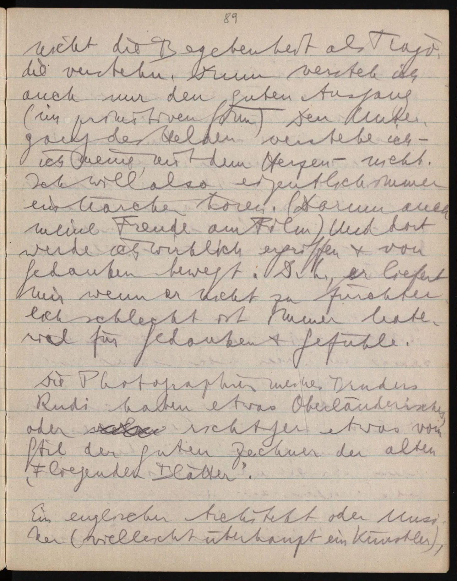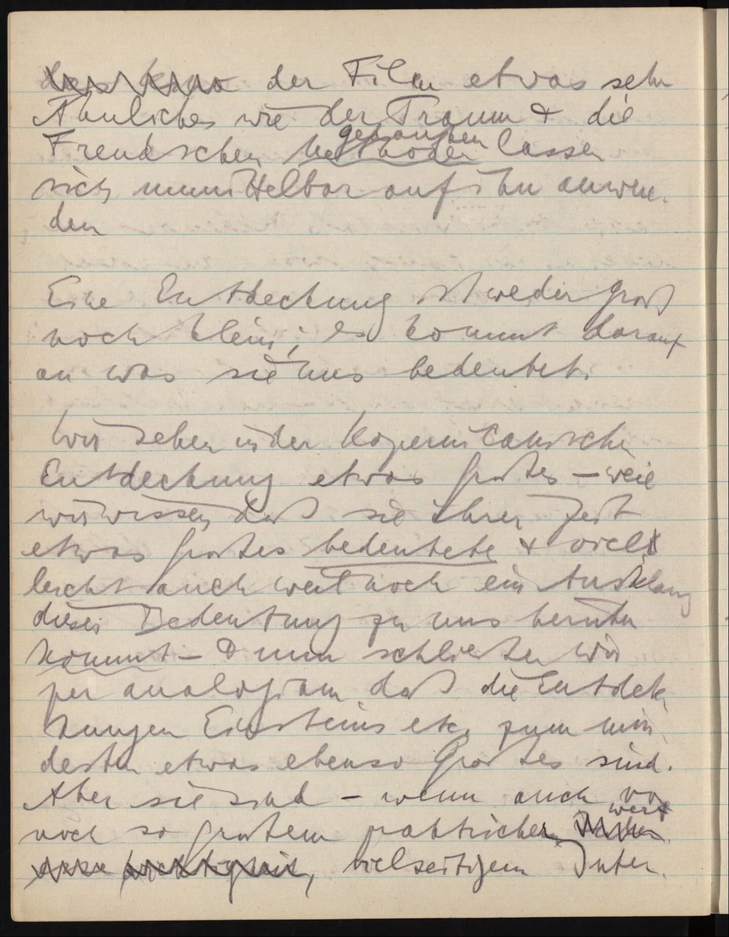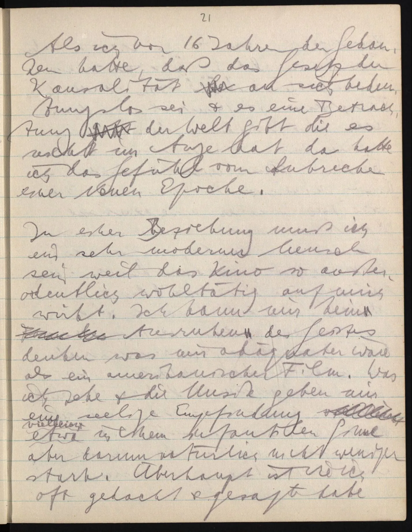 In einer Beziehung muß ich ein sehr moderner Mensch sein weil das Kino so außerordentlich wohltätig auf mich wirkt. Ich kann mir kein Ausruhen des Geistes denken was mir adäquater wäre als ein amerikanischer Film. Was ich sehe & die Musik geben mir eine selige Empfindung etwa in einem infantilen Sinne aber darum natürlich nicht weniger stark. Überhaupt ist wie ich oft gedacht & gesagt habe der Film etwas sehr Ähnliches wie der Traum & die Freudschen Methoden lassen sich unmittelbar auf ihn anwenden.