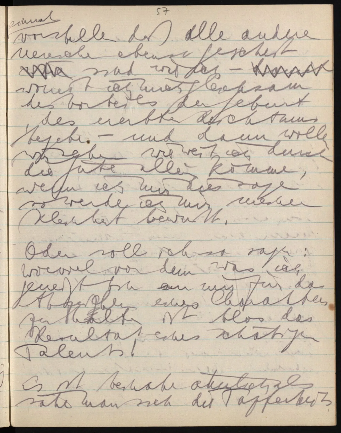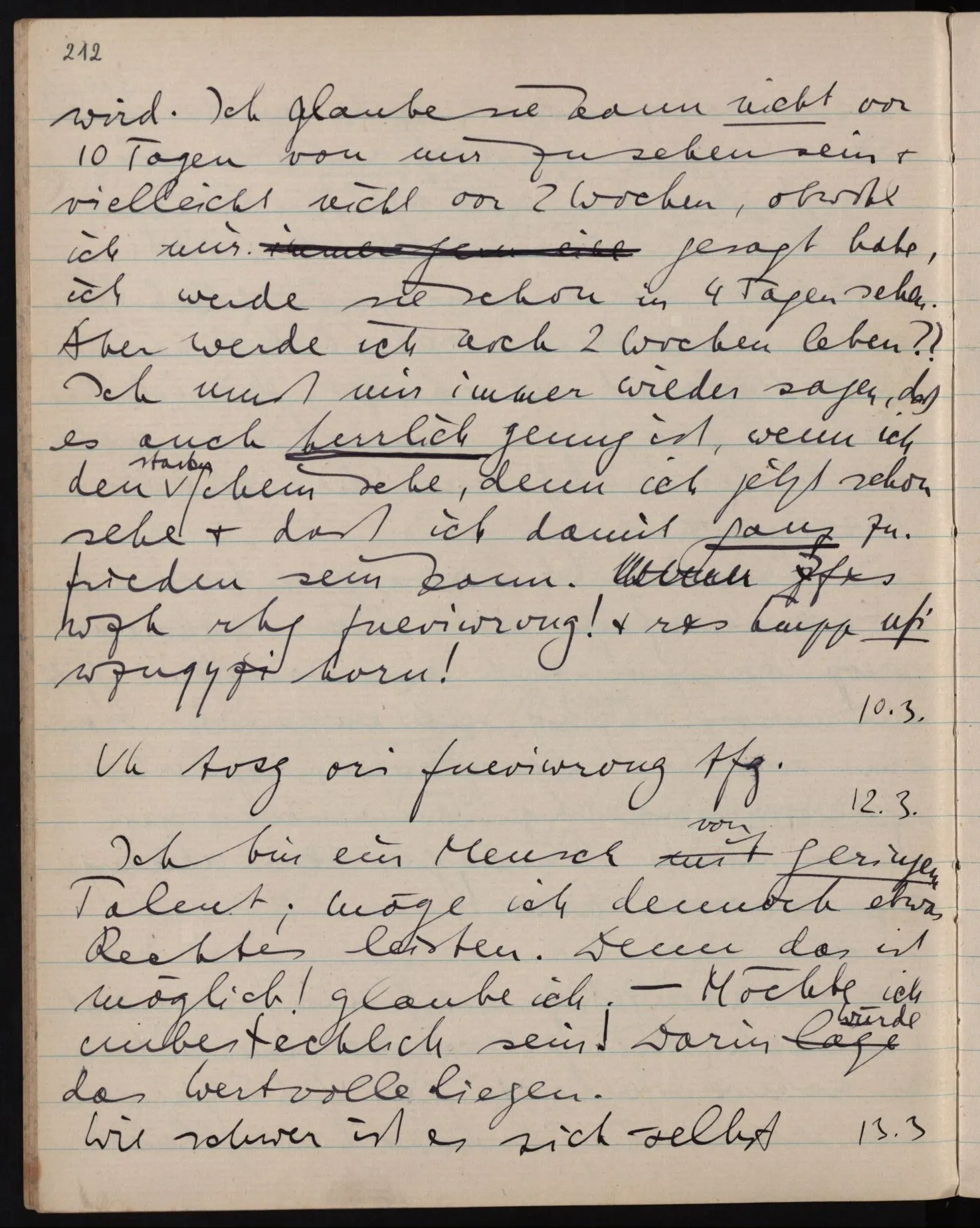 12.03.1937 Ich bin ein Mensch von geringem Talent; möge ich dennoch etwas Rechtes leisten. Denn das ist möglich! glaube ich. – Möchte ich unbestechlich sein! Darin würde das Wertvolle liegen.