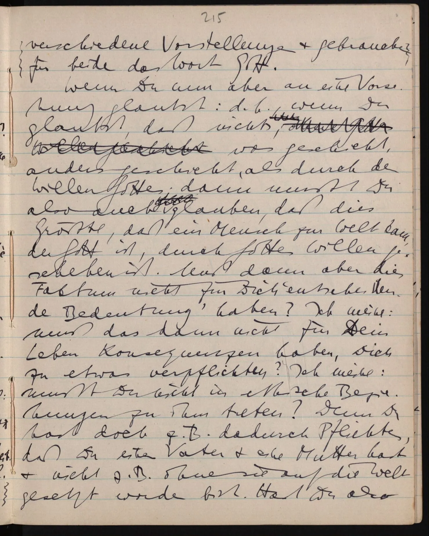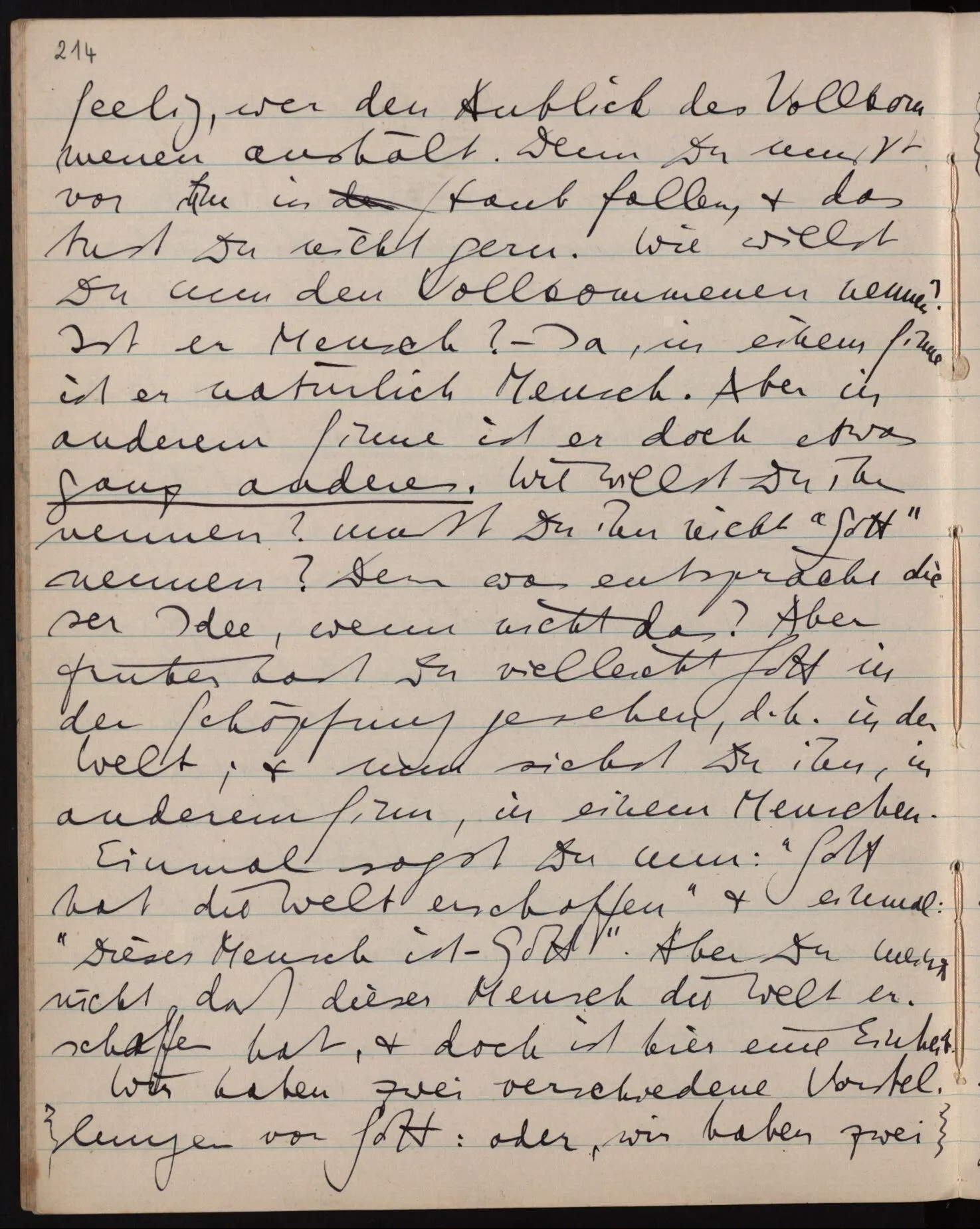 15.03.1937 Sich selbst zu erkennen ist furchtbar, weil man zugleich die wesentliche Forderung erkennt, &, daß man ihr nicht genügt. Es gibt aber kein besseres Mittel sich selbst kennen zu lernen, als den Vollkommenen zu sehen. Daher muß der Vollkommene einen Sturm der Empörung in den Menschen wecken; wenn sie sich nicht ganz, & gar demütigen wollen. Ich glaube, die Worte: “Selig, wer sich nicht an mir ärgert”, meinen: Selig, wer den Anblick des Vollkommenen aushält. Denn Du mußt vor ihm in Staub fallen, & das tust Du nicht gern. Wie willst Du nun den Vollkommenen nennen? Ist er Mensch? – Ja, in einem Sinne ist er natürlich Mensch. Aber in anderem Sinne ist er doch etwas ganz anderes. Wie willst Du ihn nennen? mußt Du ihn nicht “Gott” nennen? Denn was entspräche dieser Idee, wenn nicht das? Aber früher hast Du vielleicht Gott in der Schöpfung gesehen, d.h. in der Welt; & nun siehst Du ihn, in anderem Sinn, in einem Menschen. Einmal sagst Du nun: “Gott hat die Welt erschaffen” & einmal: “Dieser Mensch ist – Gott”. Aber Du meinst nicht, daß dieser Mensch die Welt erschaffen hat, & doch ist hier eine Einheit. Wir haben zwei verschiedene Vorstellungen von Gott: oder, wir haben zwei verschiedene Vorstellungen & gebrauchen für beide das Wort “Gott”. Wenn Du nun aber an eine Vorsehung glaubst: d.h., wenn Du glaubst, daß nichts, was geschieht, anders geschieht, als durch den Willen Gottes; dann mußt Du also auch glauben, daß dies Größte, daß ein Mensch zur Welt kam, der Gott ist, durch Gottes Willen geschehen ist. Muß dann aber dies Faktum nicht für Dich ‘entscheidende Bedeutung’ haben? Ich meine: muß das dann nicht für Dein Leben Konsequenzen haben, Dich zu etwas verpflichten? Ich meine: mußt Du nicht in ethische Beziehungen zu ihm treten? Denn Du hast doch z.B. dadurch Pflichten, daß Du einen Vater & eine Mutter hast & nicht z.B. ohne sie auf die Welt gesetzt worden bist. Hast Du also nicht auch Pflichten durch & gegen jenes Faktum? Empfinde ich nun aber solche Pflichten? Mein Glaube ist zu schwach. Ich meine, mein Glaube an die Vorsehung, mein Gefühl: “es geschieht alles durch Gottes Willen”. Und dies ist nicht eine Meinung – auch nicht eine Überzeugung, sondern eine Attitude den Dingen & dem Geschehen gegenüber. Möge ich nicht frivol werden! Hast Du eine wertvolle Bemerkung 16.03.1937 gefunden; & sei es auch nur ein Halbedelstein, so mußt Du ihn jetzt richtig fassen. Ich dachte heute: “Arrangiere ich nicht meine Gedanken, wie meine Schwester Gretl die Möbel in einem Zimmer?” Und dieser Gedanke war mir zuerst nicht angenehm. Ich dachte gestern an den Ausdruck: “ein reines Herz”; warum habe ich keines? Das heißt doch: warum sind meine Gedanken so unrein! Eitelkeit, Schwindel, Mißgunst ist immer wieder in meinen Gedanken. Möge Gott mein Leben so lenken, daß es anders wird.
