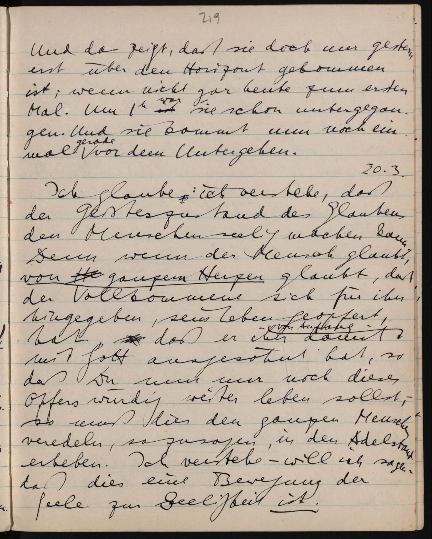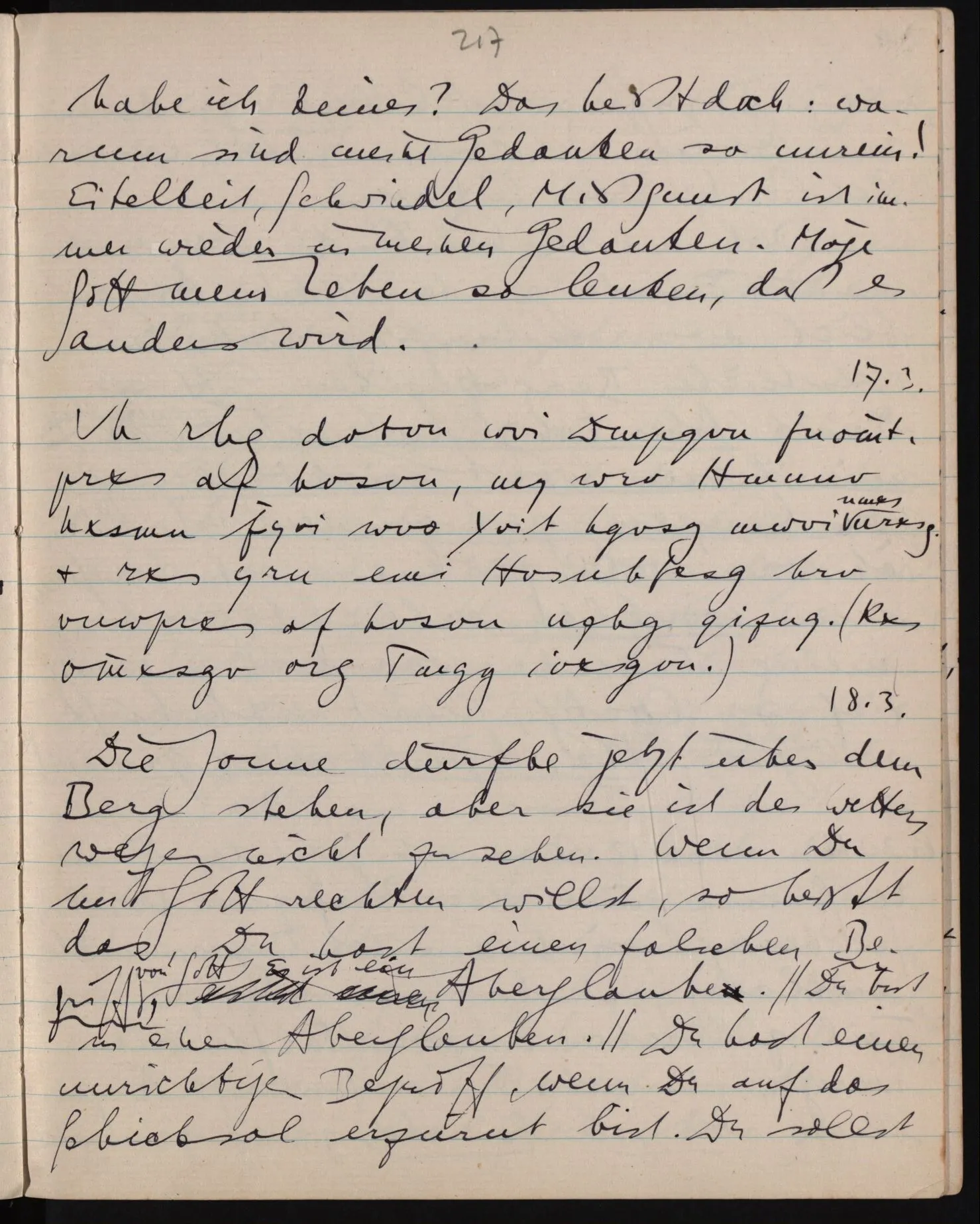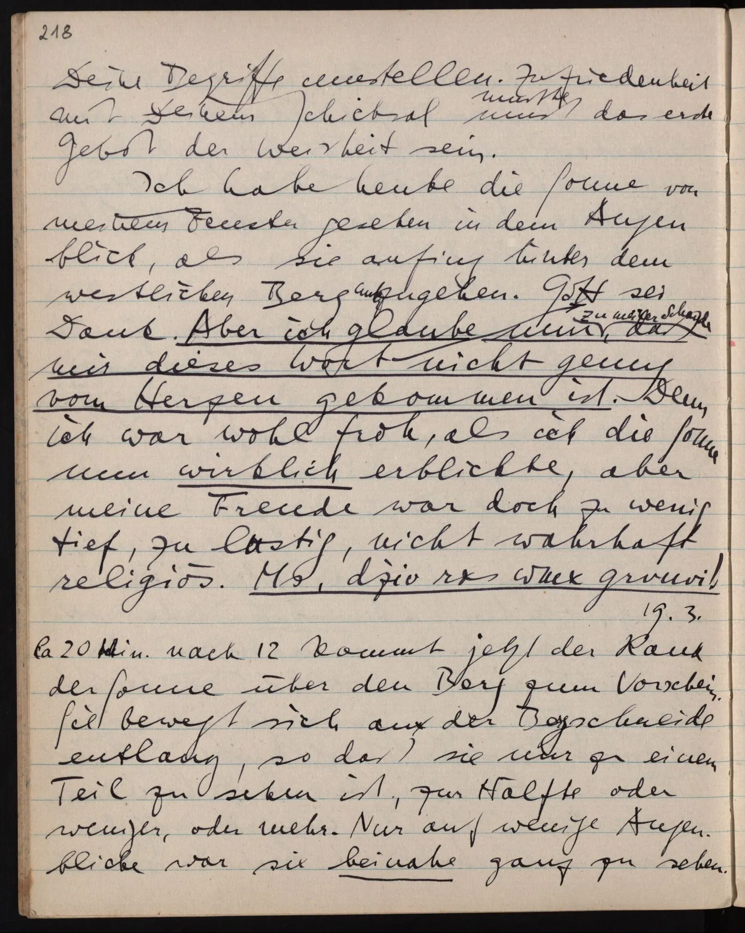 17.03.1937 Es ist wegen der Wolken unmöglich zu sehen, ob die Sonne schon über dem Berg steht oder noch nicht & ich bin vor Sehnsucht sie endlich zu sehen fast krank. (Ich möchte mit Gott rechten.)