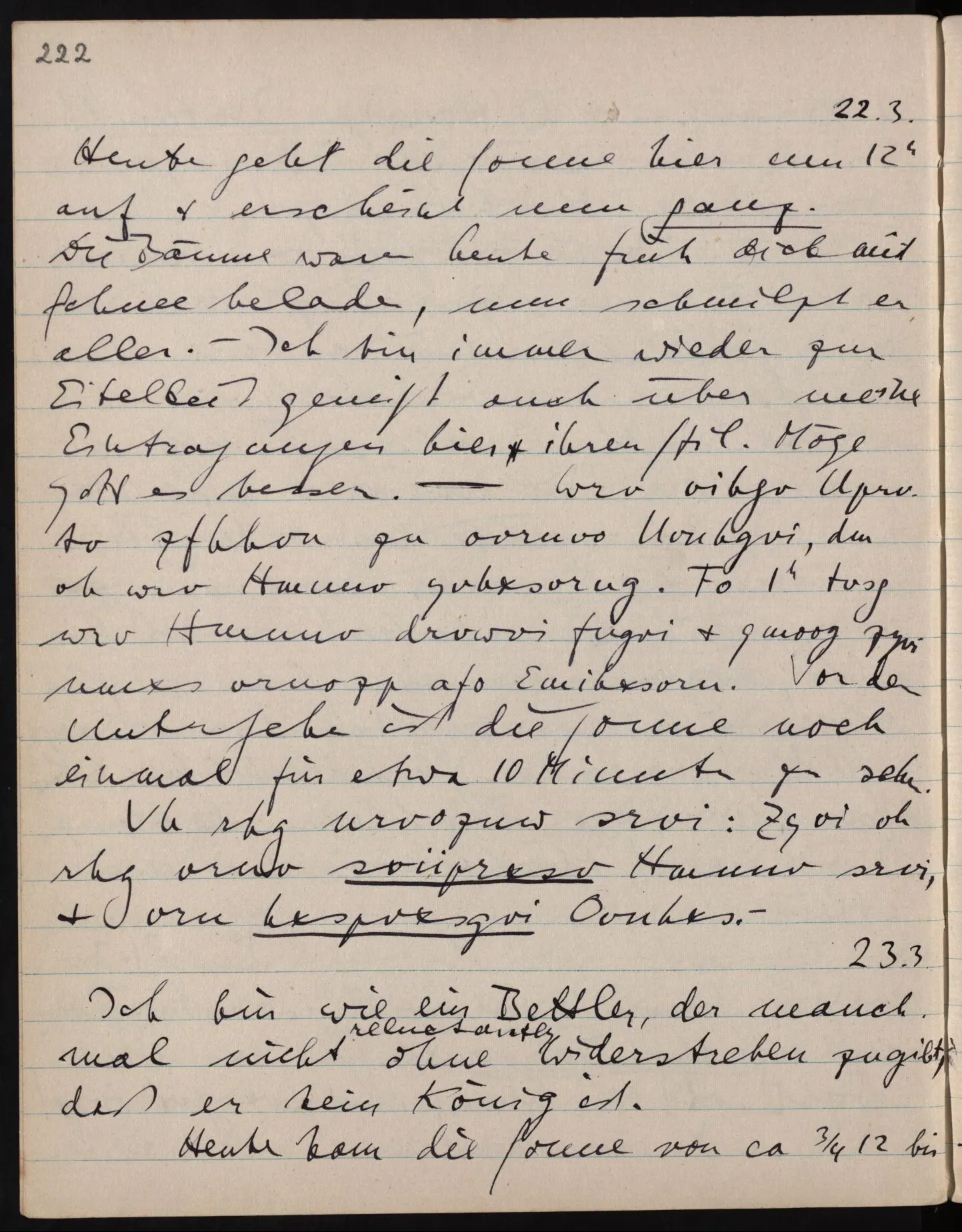 22.03.1937 Heute geht die Sonne hier um 12h auf & erscheint nun ganz. Die Bäume waren heute früh dick mit Schnee beladen, nun schmilzt er aller. – Ich bin immer wieder zur Eitelkeit geneigt auch über meine Eintragungen hier & ihren Stil. Möge Gott es bessern. – Die erste Fliege außen an meinem Fenster, wo es die Sonne bescheint. Um 1h geht die Sonne wieder unter & kommt aber noch einmal zum Vorschein. Vor dem Untergehen ist die Sonne noch einmal für etwa 10 Minuten zu sehen. Es ist niemand hier: Aber es ist eine herrliche Sonne hier, & ein schlechter Mensch. –