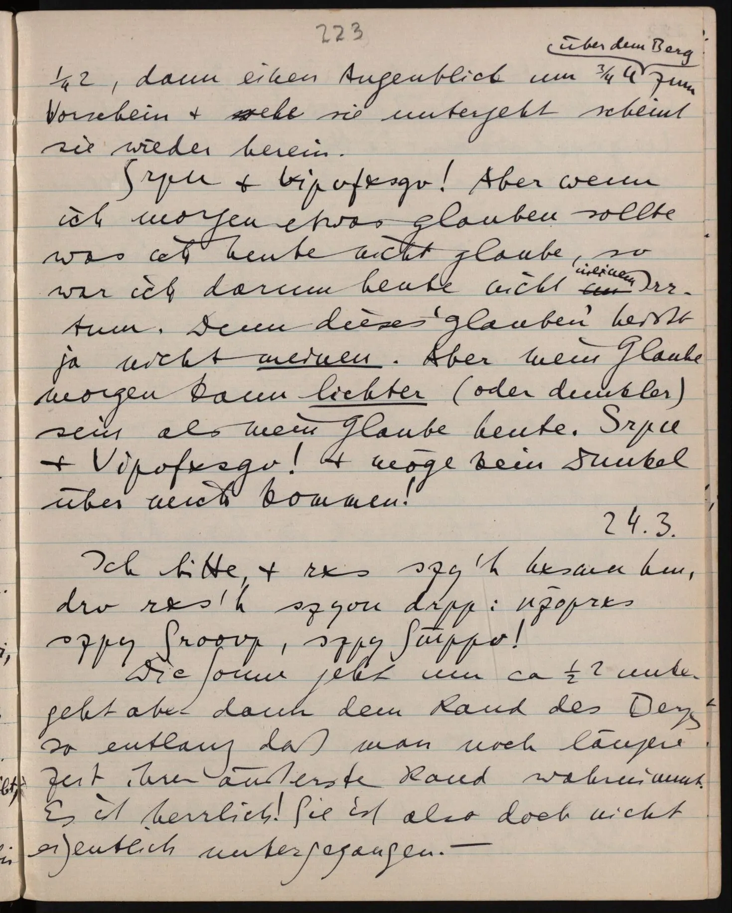 23.03.1937 Ich bin wie ein Bettler, der manchmal nicht ohne Widerstreben zugibt, daß er kein König ist. Heute kam die Sonne von ca. 12 bis ¼2, dann einen Augenblick um 4 über dem Berg zum Vorschein & ehe sie untergeht scheint sie wieder herein. Hilf & erleuchte! Aber wenn ich morgen etwas glauben sollte was ich heute nicht glaube, so war ich darum heute nicht in einem Irrtum. Denn dieses ‘glauben’ heißt ja nicht meinen. Aber mein Glaube morgen kann lichter (oder dunkler) sein als mein Glaube heute. Hilf & erleuchte! & möge kein Dunkel über mich kommen!