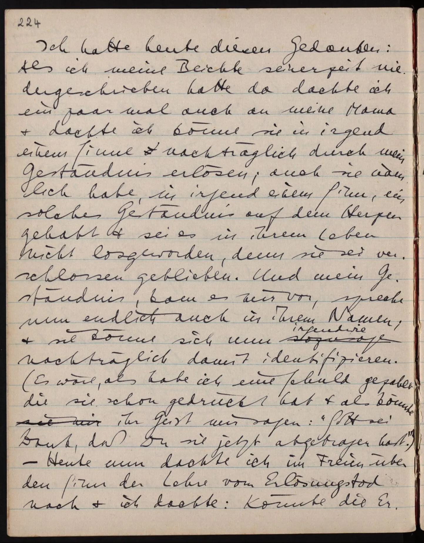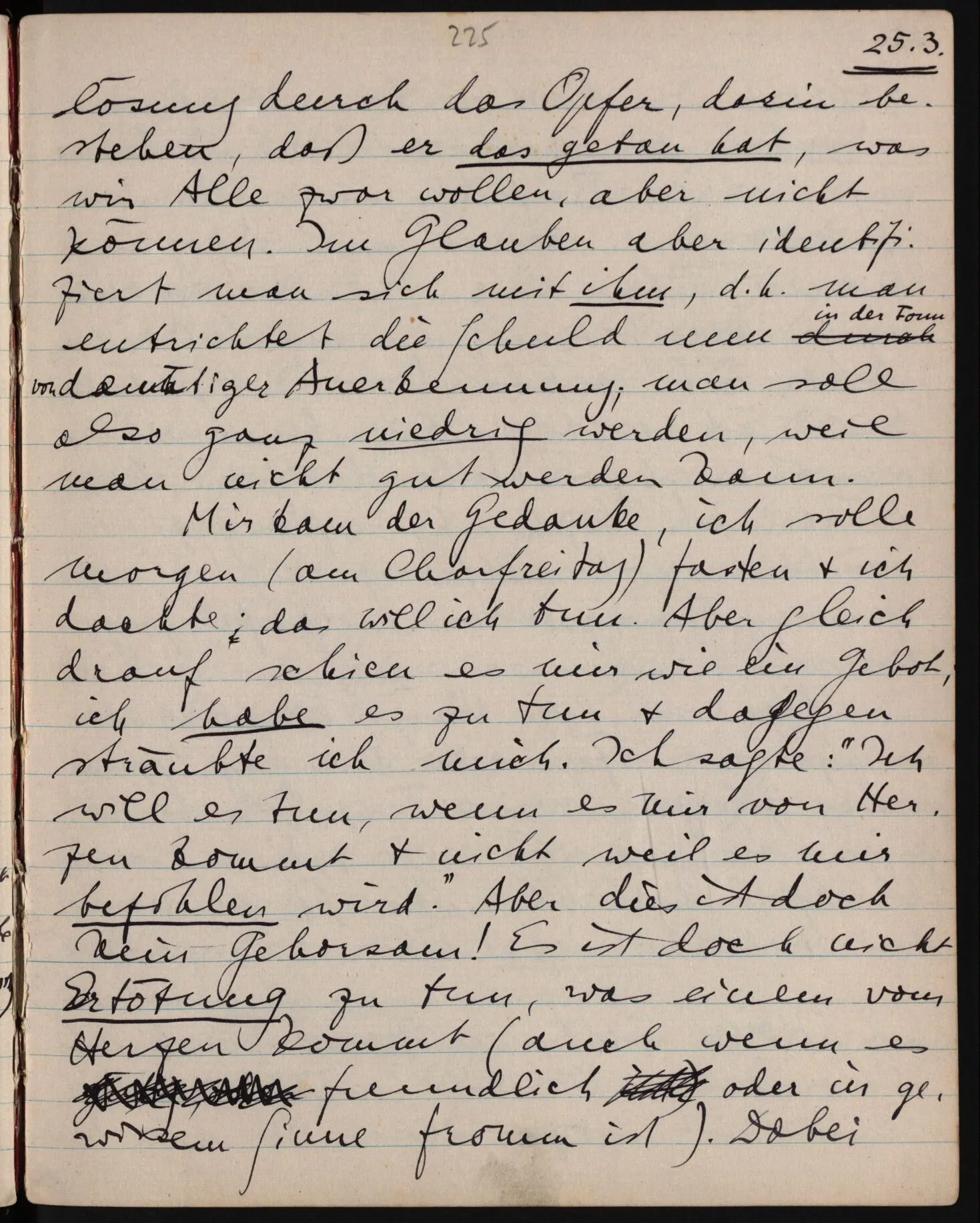24.03.1937 Ich bitte, & ich hab’s schon so, wie ich’s haben will: nämlich halb Himmel, halb Hölle! Die Sonne geht um ca. ½2 unter geht aber dann dem Rand des Berges so entlang daß man noch längere Zeit ihren äußersten Rand wahrnimmt. Es ist herrlich! Sie ist also doch nicht eigentlich untergegangen. – Ich hatte heute diesen Gedanken: Als ich meine Beichte seinerzeit niedergeschrieben hatte da dachte ich ein paar mal auch an meine Mama & dachte ich könne sie in irgend einem Sinne nachträglich durch mein Geständnis erlösen; auch sie nämlich habe, in irgend einem Sinn, ein solches Geständnis auf dem Herzen gehabt & sei es in ihrem Leben nicht losgeworden, denn sie sei verschlossen geblieben. Und mein Geständnis, kam es mir vor, spreche nun endlich auch in ihrem Namen; & sie könne sich nun irgendwie nachträglich damit identifizieren. (Es wäre, als habe ich eine Schuld gezahlt die sie schon gedrückt hat & als könnte ihr Geist mir sagen: “Gott sei Dank, daß Du sie jetzt abgetragen hast.”) – Heute nun dachte ich im Freien über den Sinn der Lehre vom Erlösungstod nach & ich dachte: Könnte die Erlösung 25.03.1937 durch das Opfer, darin bestehen, daß er das getan hat, was wir Alle zwar wollen, aber nicht können. Im Glauben aber identifiziert man sich mit ihm, d.h. man entrichtet die Schuld nun in der Form von demütiger Anerkennung; man soll also ganz niedrig werden, weil man nicht gut werden kann. Mir kam der Gedanke, ich solle morgen (am Karfreitag) fasten & ich dachte: das will ich tun. Aber gleich drauf schien es mir wie ein Gebot, ich habe es zu tun & dagegen sträubte ich mich. Ich sagte: “Ich will es tun, wenn es mir von Herzen kommt & nicht weil es mir befohlen wird.” Aber dies ist doch kein Gehorsam! Es ist doch nicht Ertötung zu tun, was einem vom Herzen kommt (auch wenn es freundlich oder in gewissem Sinne fromm ist). Dabei stirbst Du doch nicht. Dagegen stirbst Du gerade beim Gehorsam gegen einen Befehl, aus bloßem Gehorsam. Das ist eine Agonie, kann, soll, aber eine fromme Agonie sein. Wenigstens, so versteh’ ich’s. Aber ich selbst! – Ich gestehe, daß ich nicht absterben will, obwohl ich verstehe, daß es das Höhere ist. Das ist furchtbar; & möge diese Furchtbarkeit durch einen Lichtschein erleuchtet werden! Habe ein paar Nächte ziemlich schlecht geschlafen & fühle mich wie tot, kann nicht arbeiten; meine Gedanken sind trübe & ich bin deprimiert aber in einer finstern Weise. (D.h., ich fürchte mich vor gewissen religiösen Gedanken.)