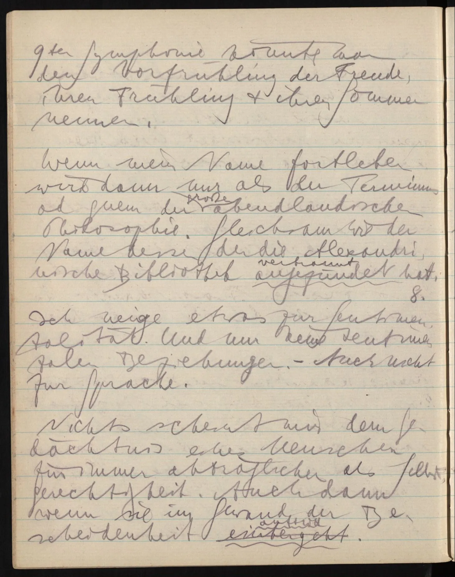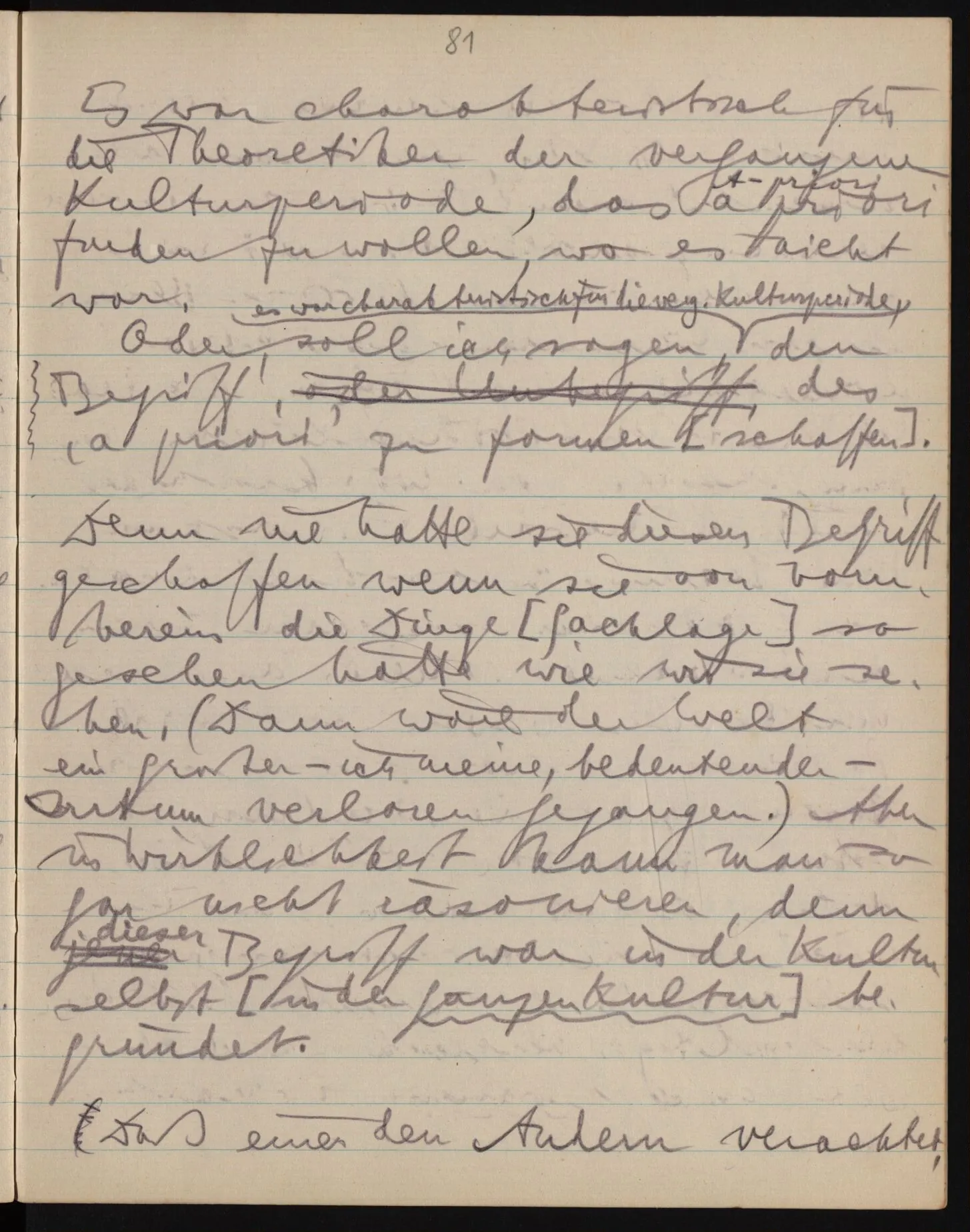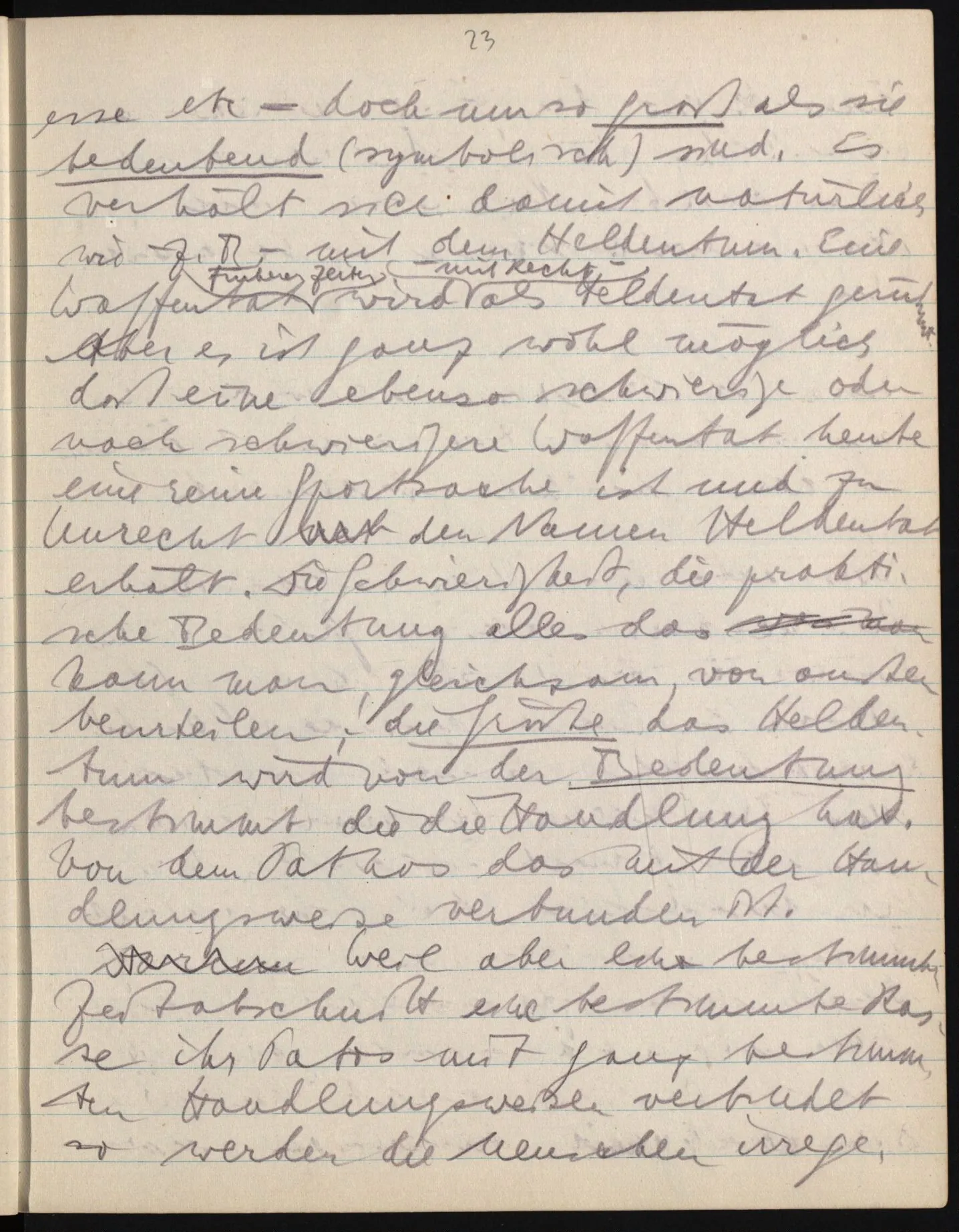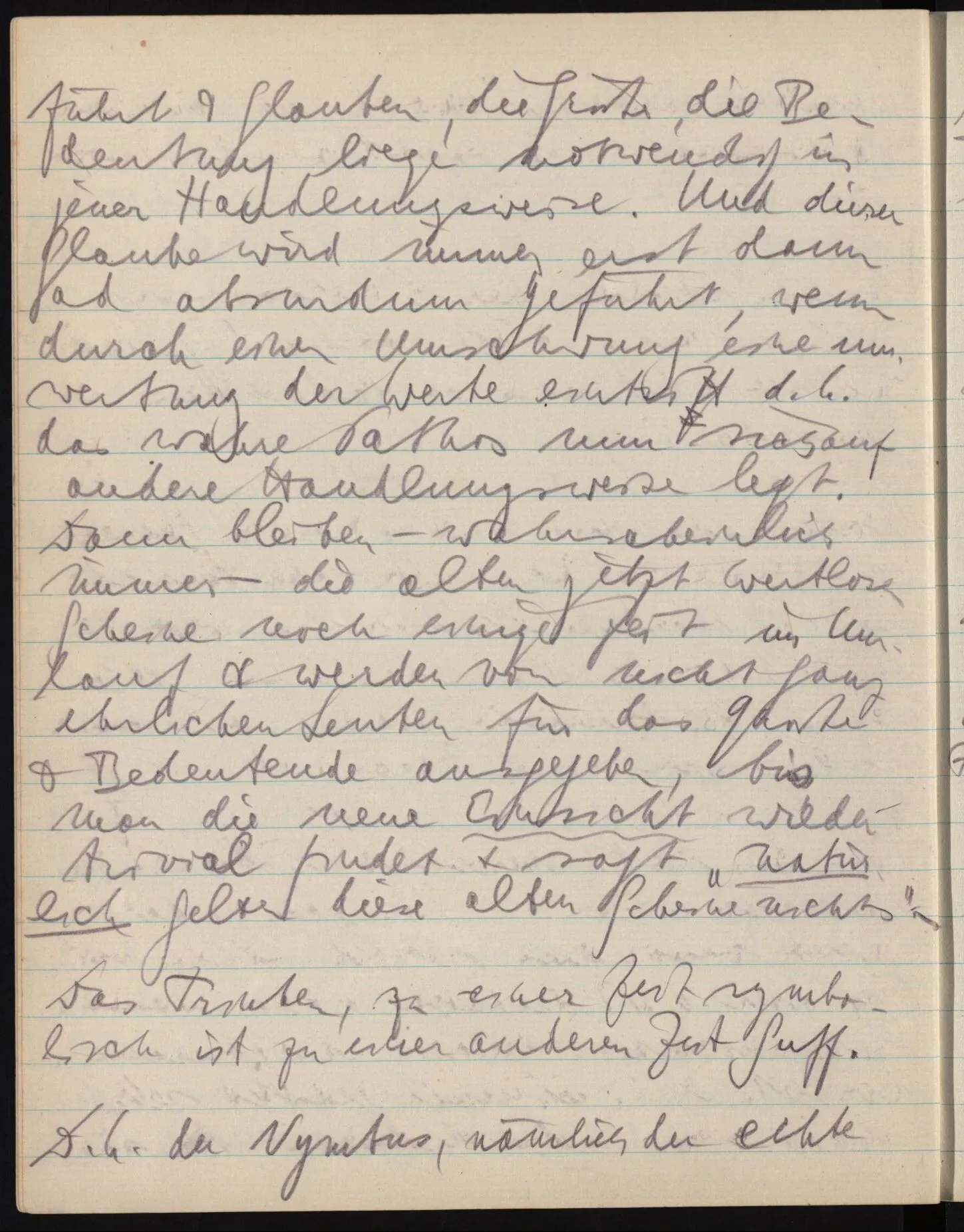 Wir sehen in der Kopernikanischen Entdeckung etwas Großes – weil wir wissen daß sie ihrer Zeit etwas Großes bedeutete & vielleicht auch weil noch ein Ausklang dieser Bedeutung zu uns herüber kommt – & nun schließen wir per analogiam daß die Entdeckungen Einsteins etc. zum mindesten etwas ebenso Großes sind. Aber sie sind – wenn auch von noch so großem praktischem Wert, vielseitigem Interesse etc. – doch nur so groß als sie bedeutend (symbolisch) sind. Es verhält sich damit natürlich wie – z.B. – mit dem Heldentum. Eine Waffentat früherer Zeiten wird – mit Recht – als Heldentat gerühmt. Aber es ist ganz wohl möglich daß eine ebenso schwierige oder noch schwierigere Waffentat heute eine reine Sportsache ist und zu Unrecht den Namen „Heldentat” erhält. Die Schwierigkeit, die praktische Bedeutung alles das kann man, gleichsam, von außen beurteilen; die Größe das Heldentum wird von der Bedeutung bestimmt die die Handlung hat. Von dem Pathos das mit der Handlungsweise verbunden ist. Weil aber ein bestimmter Zeitabschnitt eine bestimmte Rasse ihr Pathos mit ganz bestimmten Handlungsweisen verbindet so werden die Menschen irregeführt & glauben, die Größe, die Bedeutung liege notwendig in jener Handlungsweise. Und dieser Glaube wird immer erst dann ad absurdum geführt, wenn durch einen Umschwung eine Umwertung der Werte eintritt d.h. das wahre Pathos nun sich auf andere Handlungsweisen legt. Dann bleiben – wahrscheinlich immer – die alten jetzt wertlosen Scheine noch einige Zeit im Umlauf & werden von nicht ganz ehrlichen Leuten für das Große & Bedeutende ausgegeben, bis man die neue Einsicht wieder trivial findet & sagt „natürlich gelten diese alten Scheine nichts”.