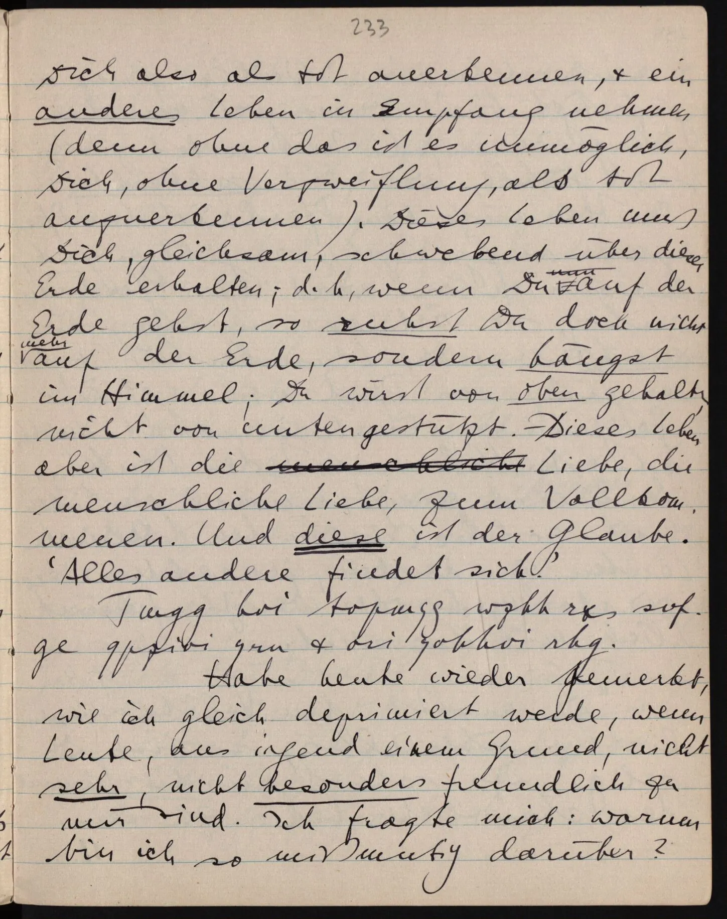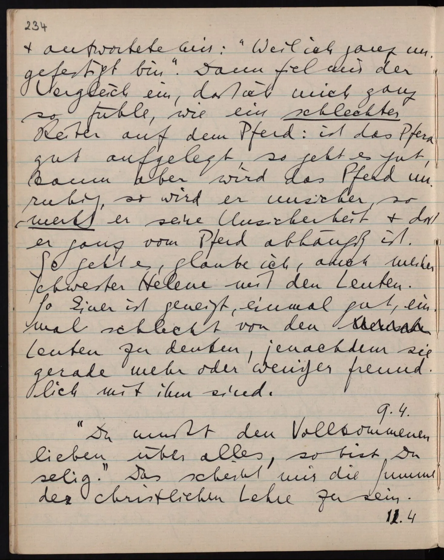 06.04.1937 Eine Auslegung der christlichen Lehre: Wach vollkommen auf! Wenn Du das tust, erkennst Du, daß Du nicht taugst; & damit hört die Freude an dieser Welt für Dich auf. Und sie kann auch nicht wiederkommen, wenn Du wach bleibst. Du brauchst aber nun Erlösung, – sonst bist Du verloren. Du mußt aber am Leben bleiben (und diese Welt ist für Dich tot) so brauchst Du ein neues Licht anderswoher. In diesem Licht kann keine Klugheit, oder Weisheit, sein; denn für diese Welt bist Du tot. (Denn sie ist das Paradies, in dem Du aber Deiner Sündigkeit wegen nichts anfangen kannst.) Du mußt Dich also als tot anerkennen, & ein anderes Leben in Empfang nehmen (denn ohne das ist es unmöglich, Dich, ohne Verzweiflung, als tot anzuerkennen). Dieses Leben muß Dich, gleichsam, schwebend über dieser Erde erhalten; d.h., wenn Du auf der Erde gehst, so ruhst Du doch nicht mehr auf der Erde, sondern hängst im Himmel; Du wirst von oben gehalten, nicht von unten gestützt. – Dieses Leben aber ist die Liebe, die menschliche Liebe, zum Vollkommenen. Und diese ist der Glaube. ‘Alles andere findet sich.’ Gott sei gelobt daß ich heute klarer bin & mir besser ist. Habe heute wieder gemerkt, wie ich gleich deprimiert werde, wenn Leute, aus irgend einem Grund, nicht sehr, nicht besonders freundlich zu mir sind. Ich fragte mich: warum bin ich so mißmutig darüber? & antwortete mir: “Weil ich ganz ungefestigt bin”. Dann fiel mir der Vergleich ein, daß ich mich ganz so fühle, wie ein schlechter Reiter auf dem Pferd: ist das Pferd gut aufgelegt, so geht es gut, kaum aber wird das Pferd unruhig, so wird er unsicher, so merkt er seine Unsicherheit & daß er ganz vom Pferd abhängig ist. So geht es, glaube ich, auch meiner Schwester Helene mit den Leuten. So Einer ist geneigt, einmal gut, einmal schlecht von den Leuten zu denken, jenachdem sie gerade mehr oder weniger freundlich mit ihm sind.