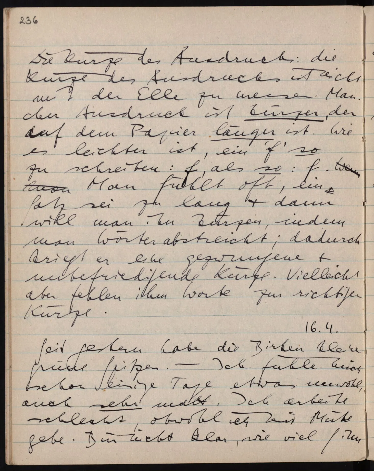 Die Kürze des Ausdrucks: die Kürze des Ausdrucks ist nicht mit der Elle zu messen. Mancher Ausdruck ist kürzer, der auf dem Papier länger ist. Wie es leichter ist, ein ‘f’ so zu schreiben: , als so: . Man fühlt oft, ein Satz sei zu lang & dann will man ihn kürzen, indem man Wörter abstreicht; dadurch kriegt er eine gezwungene & unbefriedigende Kürze. Vielleicht aber fehlen ihm Worte zur richtigen Kürze.