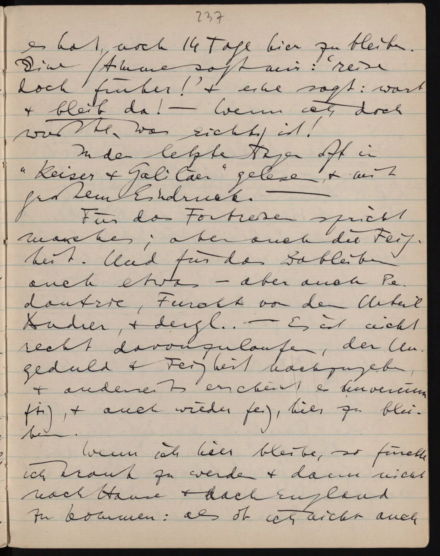 16.04.1937 Seit gestern haben die Birken kleine grüne Spitzen. – Ich fühle mich schon einige Tage etwas unwohl, auch sehr matt. Ich arbeite schlecht, obwohl ich mir Mühe gebe. Bin nicht klar, wie viel Sinn es hat, noch 14 Tage hier zu bleiben. Eine Stimme sagt mir: ‘reise doch früher!’ & eine sagt: wart & bleib da! – Wenn ich doch wüßte was richtig ist! In den letzten Tagen oft in “Kaiser & Galiläer” gelesen, & mit großem Eindruck. – Für das Fortreisen spricht manches; aber auch die Feigheit. Und für das Dableiben auch etwas – aber auch Pedanterie, Furcht vor dem Urteil Andrer, & dergl..– Es ist nicht recht davonzulaufen, der Ungeduld & Feigheit nachzugeben, & anderseits erscheint es unvernünftig, & auch wieder feig, hier zu bleiben. Wenn ich hier bleibe, so fürchte ich krank zu werden & dann nicht nach Hause & nach England zu kommen: als ob ich nicht auch in Wien krank werden oder verunglücken könnte etc.! Schwerer ist es hier zu bleiben, als wegzufahren.