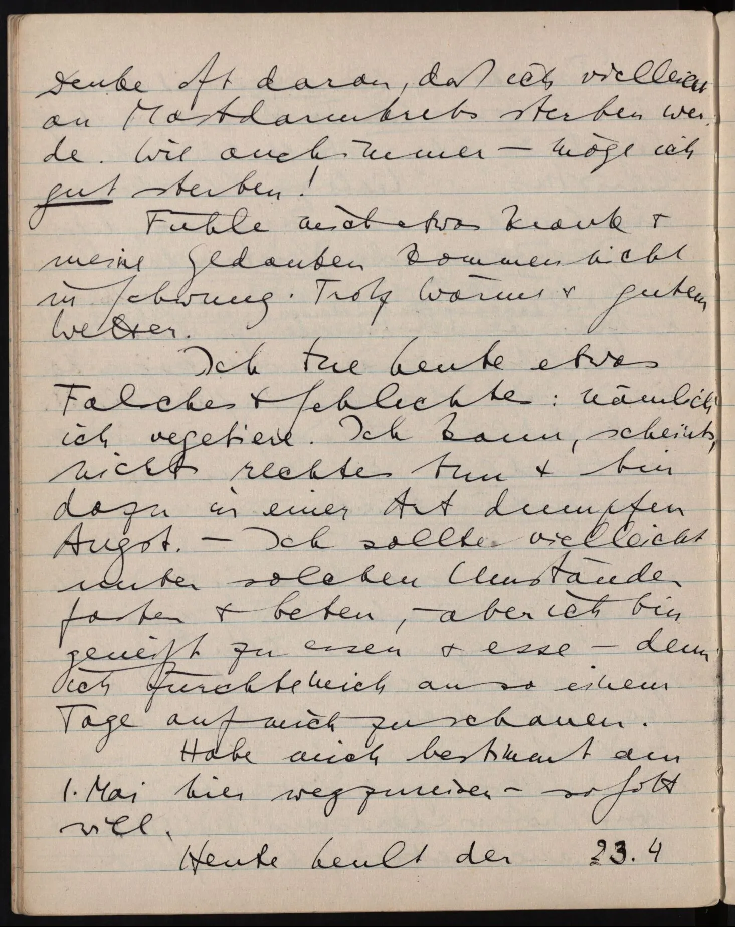 Heute heult der 23.04.1937 Wind ums Haus, was mir immer sehr arg ist. Es beängstigt & stört mich. Ich bemühe mich gegen meine traurigen & bösen Gefühle zu streiten; aber meine Kraft erlahmt so schnell.