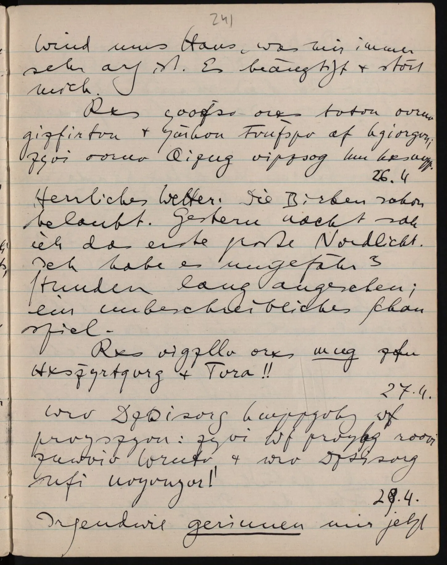 26.04.1937 Herrliches Wetter. Die Birken schon belaubt. Gestern nacht sah ich das erste große Nordlicht. Ich habe es ungefähr 3 Stunden lang angesehen; ein unbeschreibliches Schauspiel. Ich ertappe mich oft auf Schäbigkeit & Geiz!!