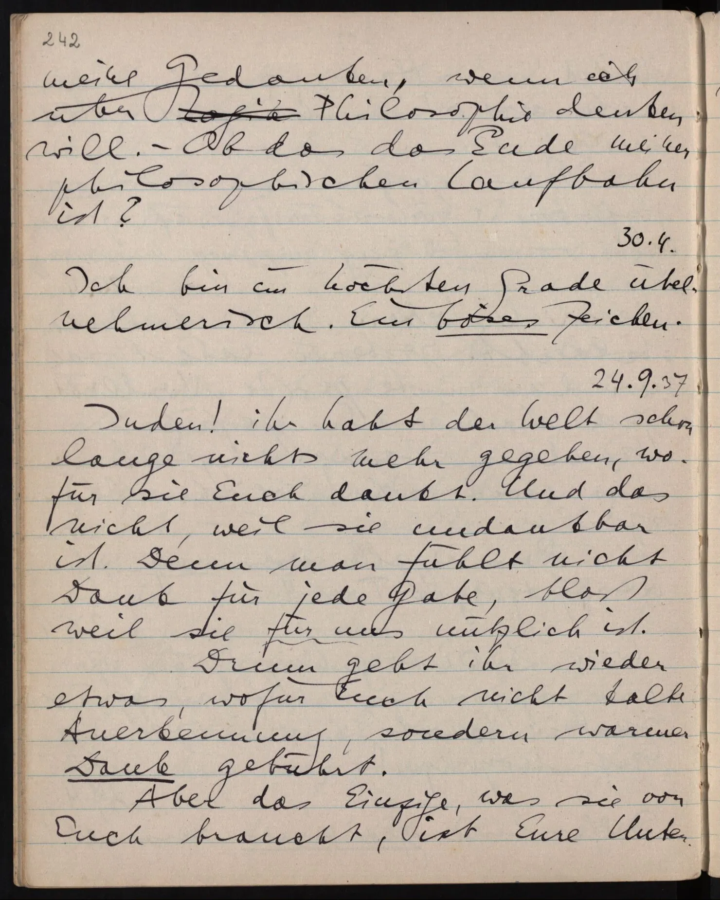 29.04.1937 Irgendwie gerinnen mir jetzt meine Gedanken, wenn ich über Philosophie denken will. – Ob das das Ende meiner philosophischen Laufbahn ist?