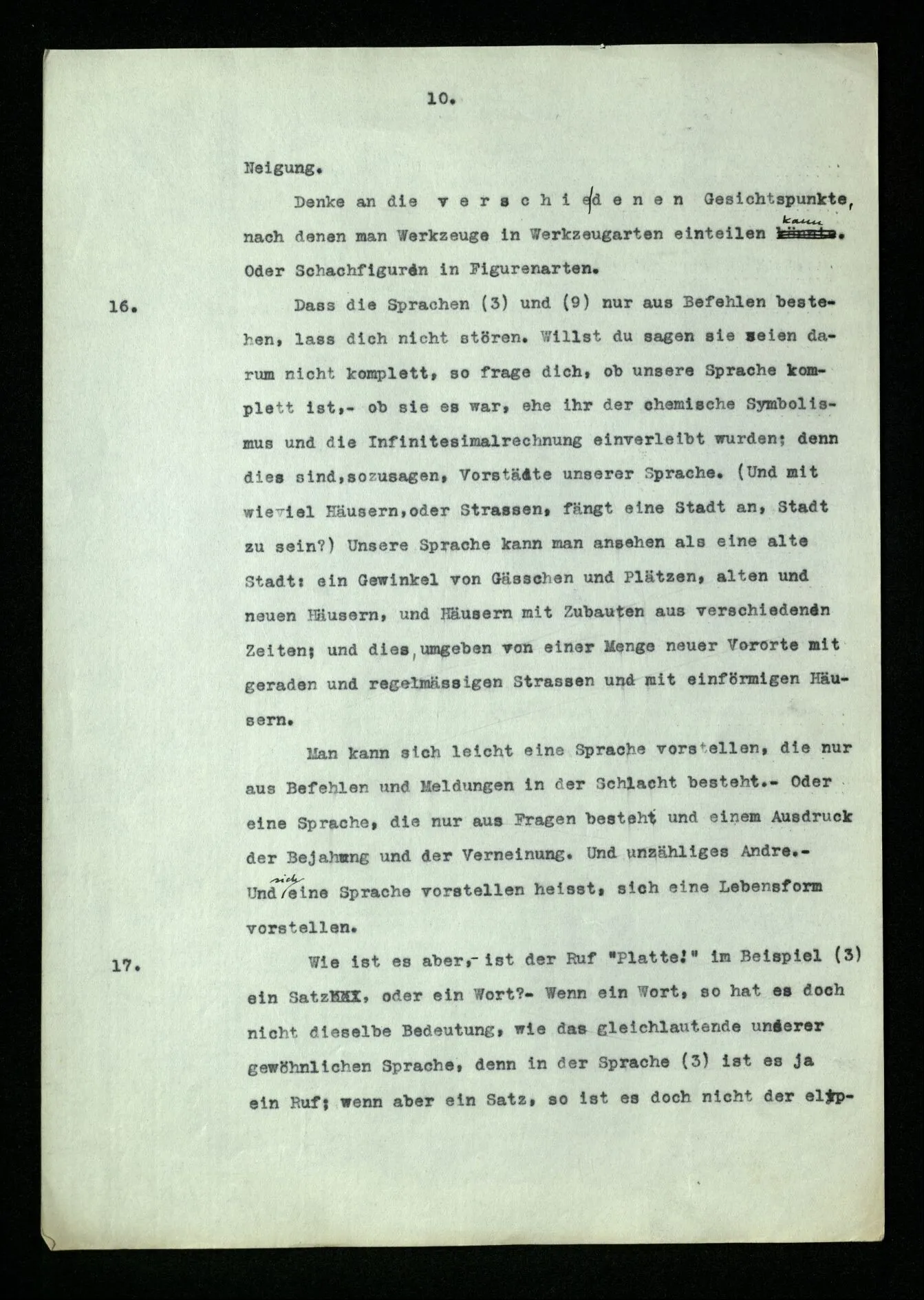 16. Daß die Sprachen (3) und (9) nur aus Befehlen bestehen, laß dich nicht stören. Willst du sagen sie seien darum nicht komplett, so frage dich, ob unsere Sprache komplett ist, – ob sie es war, ehe ihr der chemische Symbolismus und die Infinitesimalrechnung einverleibt wurden; denn dies sind, sozusagen, Vorstädte unserer Sprache. (Und mit wieviel Häusern, oder Straßen, fängt eine Stadt an, Stadt zu sein?) Unsere Sprache kann man ansehen als eine alte Stadt: ein Gewinkel von Gäßchen und Plätzen, alten und neuen Häusern, und Häusern mit Zubauten aus verschiedenen Zeiten; und dies, umgeben von einer Menge neuer Vororte mit geraden und regelmäßigen Straßen und mit einförmigen Häusern. Man kann sich leicht eine Sprache vorstellen, die nur aus Befehlen und Meldungen in der Schlacht besteht. – Oder eine Sprache, die nur Fragen besteht und einem Ausdruck der Bejahung und der Verneinung. Und unzähliges Andre. – Und sich eine Sprache vorstellen heißt, sich eine Lebensform vorstellen.