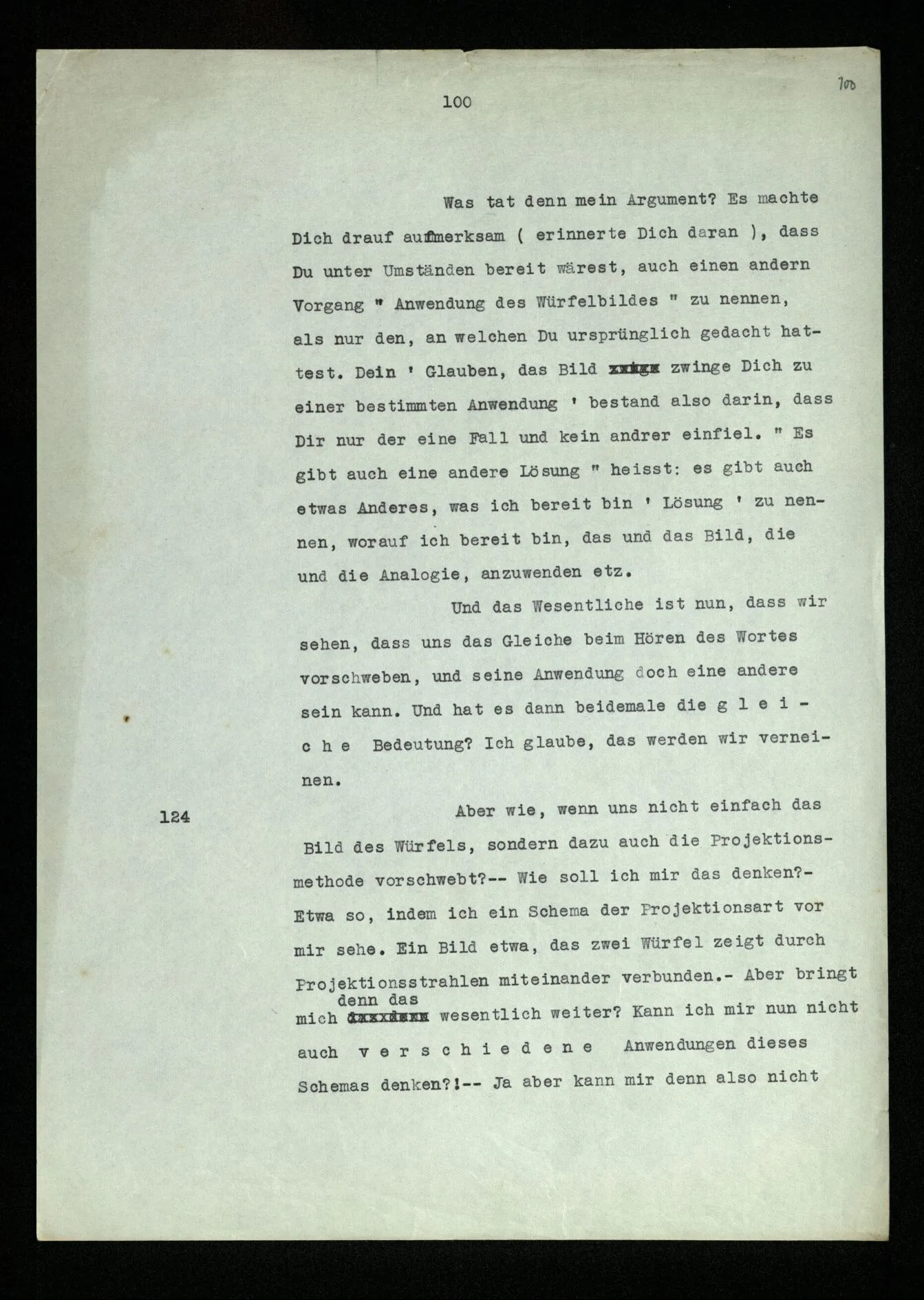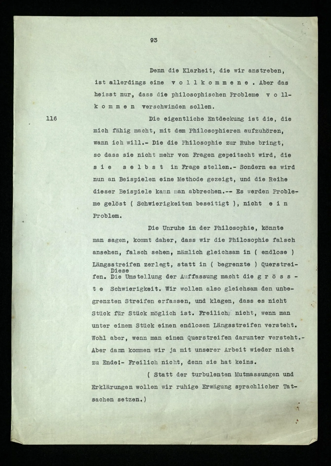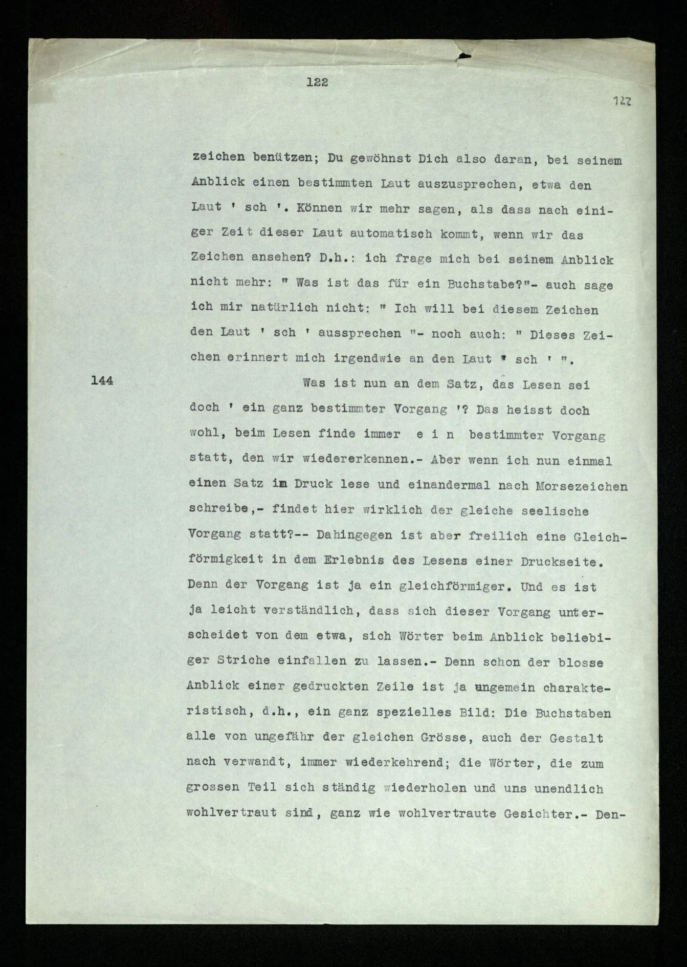 144 Was ist nun an dem Satz, das Lesen sei doch ‘ein ganz bestimmter Vorgang’? Das heißt doch wohl, beim Lesen finde immer ein bestimmter Vorgang statt, den wir wiedererkennen. – Aber wenn ich nun einmal einen Satz im Druck lese und einandermal nach Morsezeichen schreibe, – findet hier wirklich der gleiche seelische Vorgang statt? – – – Dahingegen ist aber freilich eine Gleichförmigkeit in dem Erlebnis des Lesens einer Druckseite. Denn der Vorgang ist ja ein gleichförmiger. Und es ist ja leicht verständlich, daß sich dieser Vorgang unterscheidet von dem etwa, sechs Wörter beim Anblick beliebiger Striche einfallen zu lassen. – Denn schon der bloße Anblick einer gedruckten Zeile ist ja ungemein charakteristisch, d.h., ein ganz spezielles Bild: Die Buchstaben alle von ungefähr der gleichen Größe, auch der Gestalt nach verwandt, immer wiederkehrend; die Wörter, die zum großen Teil sich ständig wiederholen und uns unendlich wohlvertraut sind, ganz wie wohlvertraute Gesichter. – Denke an das Unbehagen, das wir empfinden, wenn die Rechtschreibung eines Wortes geändert wird (und an die noch tieferen Gefühle, die Fragen der Schreibung von Wörtern aufgeregt haben). Freilich, nicht jede Zeichenform hat sich uns tief eingeprägt. Ein Zeichen, wie Russells “~” für die Verneinung, kann durch ein beliebiges anderes ersetzt werden, ohne daß tiefe Gefühle in uns aufgeregt würden. – Bedenke, daß das gesehene Wortbild uns in ähnlicher Weise vertraut ist, wie das gehörte.