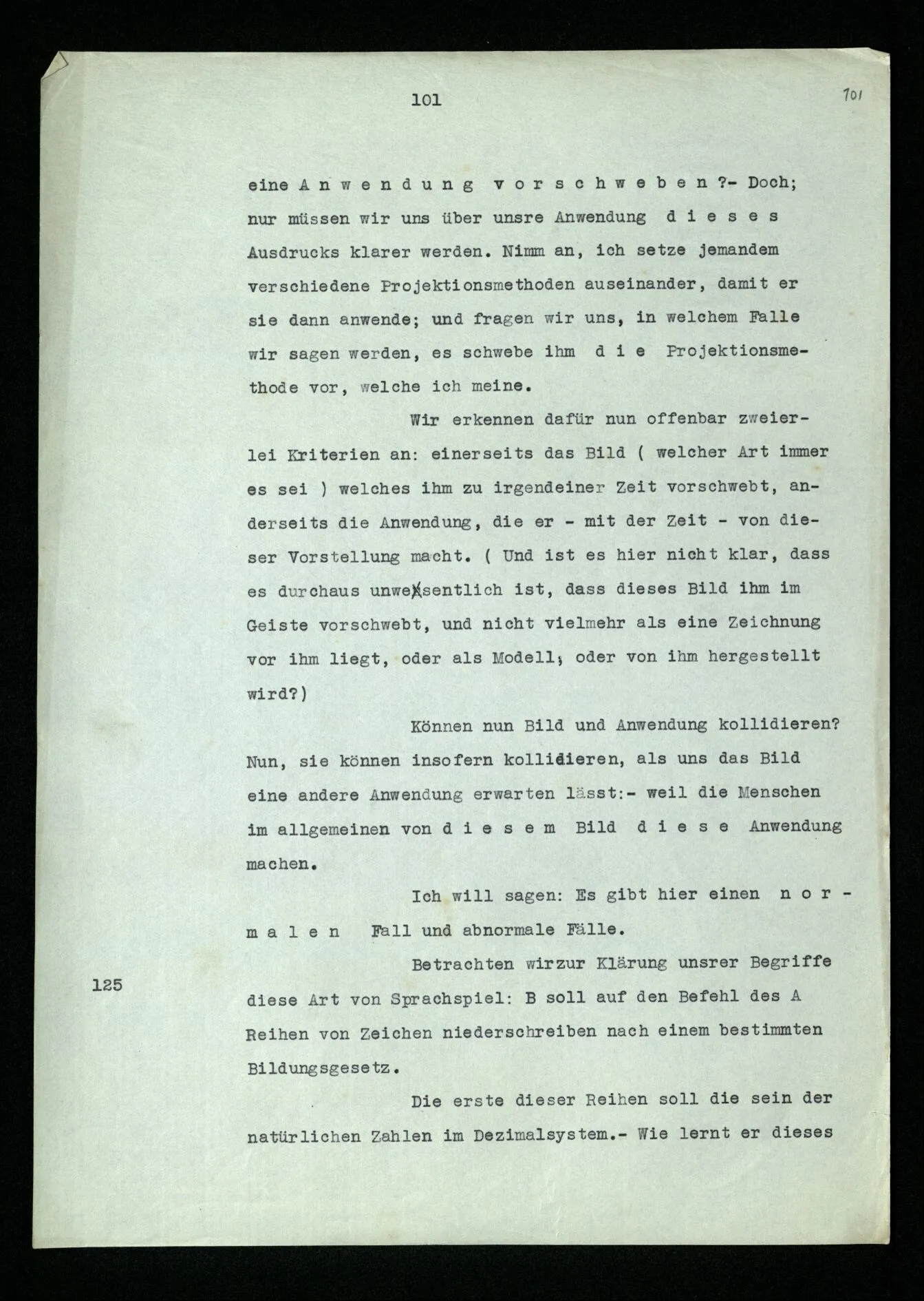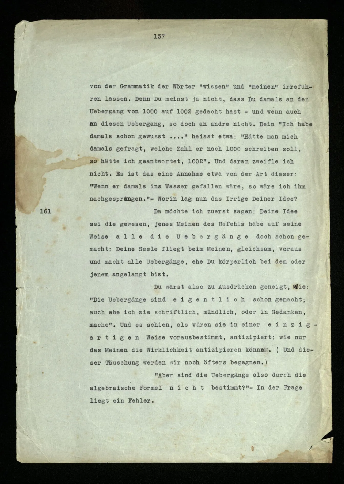 161 Da möchte ich zuerst sagen: Deine Idee sei die gewesen, jenes Meinen des Befehls habe auf seine Weise alle die Übergänge doch schon gemacht: Deine Seele fliegt beim Meinen, gleichsam, voraus und macht alle Übergänge, ehe Du körperlich bei dem oder jenem angelangt bist. Du warst also zu Ausdrücken geneigt, wie: “Die Übergänge sind eigentlich schon gemacht; auch ehe ich sie schriftlich, mündlich, oder in Gedanken, mache”. Und es schien, als wären sie in einer einzigartigen Weise vorausbestimmt, antizipiert: wie nur das Meinen die Wirklichkeit antizipieren können. (Und dieser Täuschung werden wir noch öfters begegnen.) “Aber sind die Übergänge also durch die algebraische Formel nicht bestimmt?” – In der Frage liegt ein Fehler.