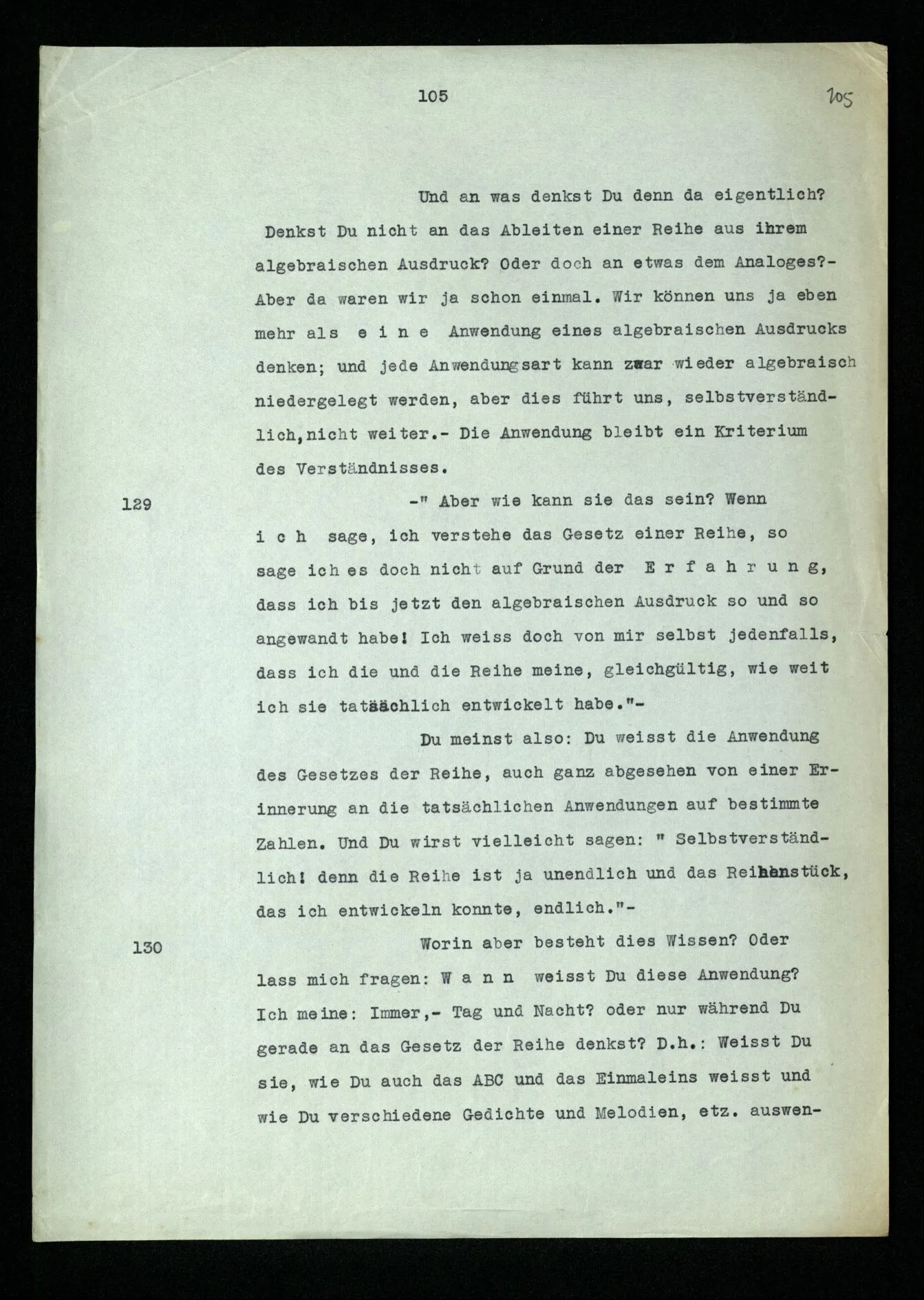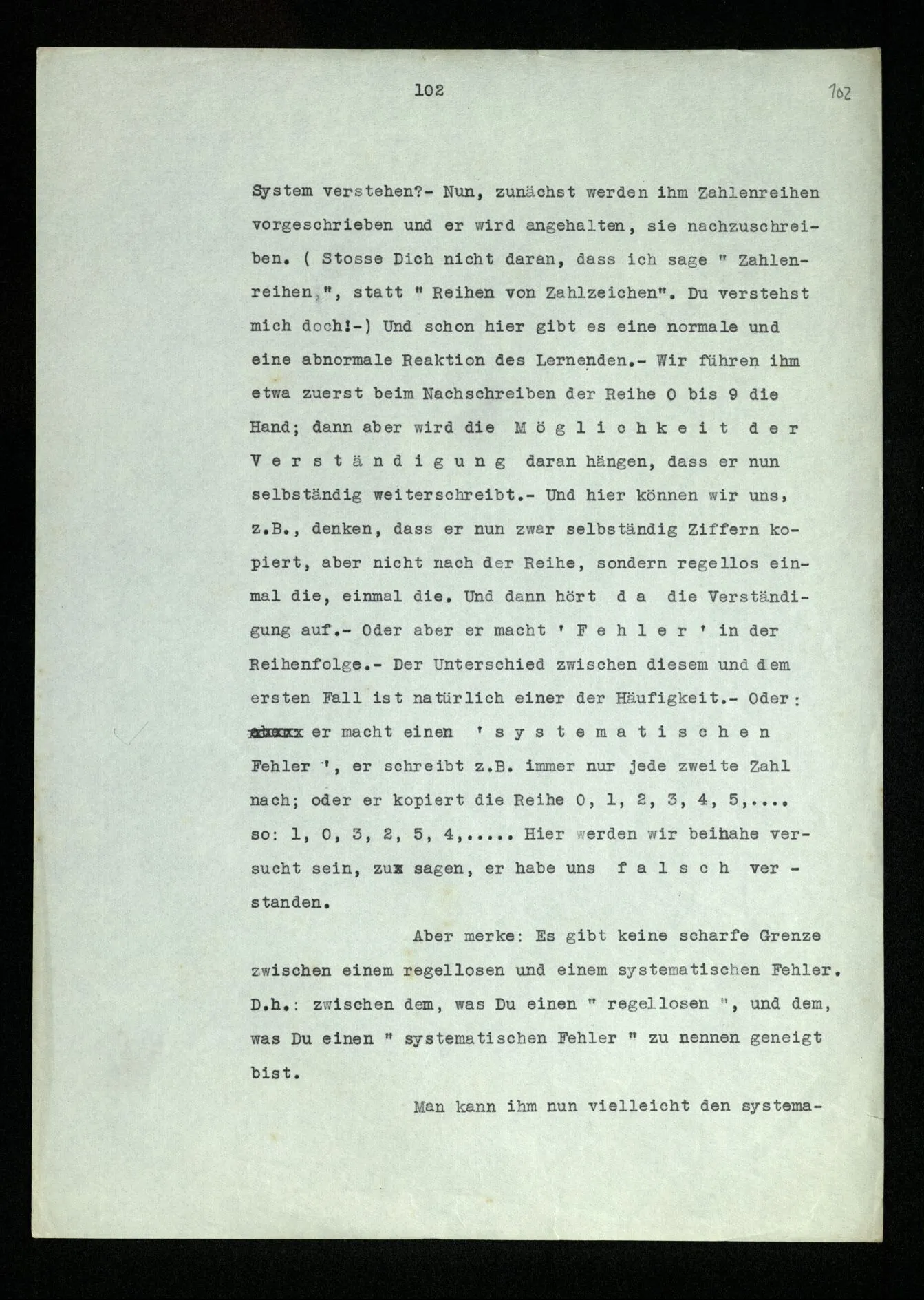 160 “Ich habe aber doch auch damals, als ich den Befehl gab, schon gewußt, daß er auf ‘1000’ ‘1002’ schreiben soll!” – Gewiß; und Du kannst sogar sagen, Du habest es damals gemeint; nur sollst Du Dich nicht von der Grammatik der Wörter “wissen” und “meinen” irreführen lassen. Denn Du meinst ja nicht, daß Du damals an den Übergang von 1000 auf 1002 gedacht hast – und wenn auch an diesen Übergang, so doch an andre nicht. Dein “Ich habe damals schon gewußt …” heißt etwa: “Hätte man mich damals gefragt, welche Zahl er nach 1000 schreiben soll, so hätte ich geantwortet, 1002”. Und daran zweifle ich nicht. Es ist das eine Annahme etwa von der Art dieser: “Wenn er damals ins Wasser gefallen wäre, so wäre ich ihm nachgesprungen.” – Worin lag nun das Irrige Deiner Idee?