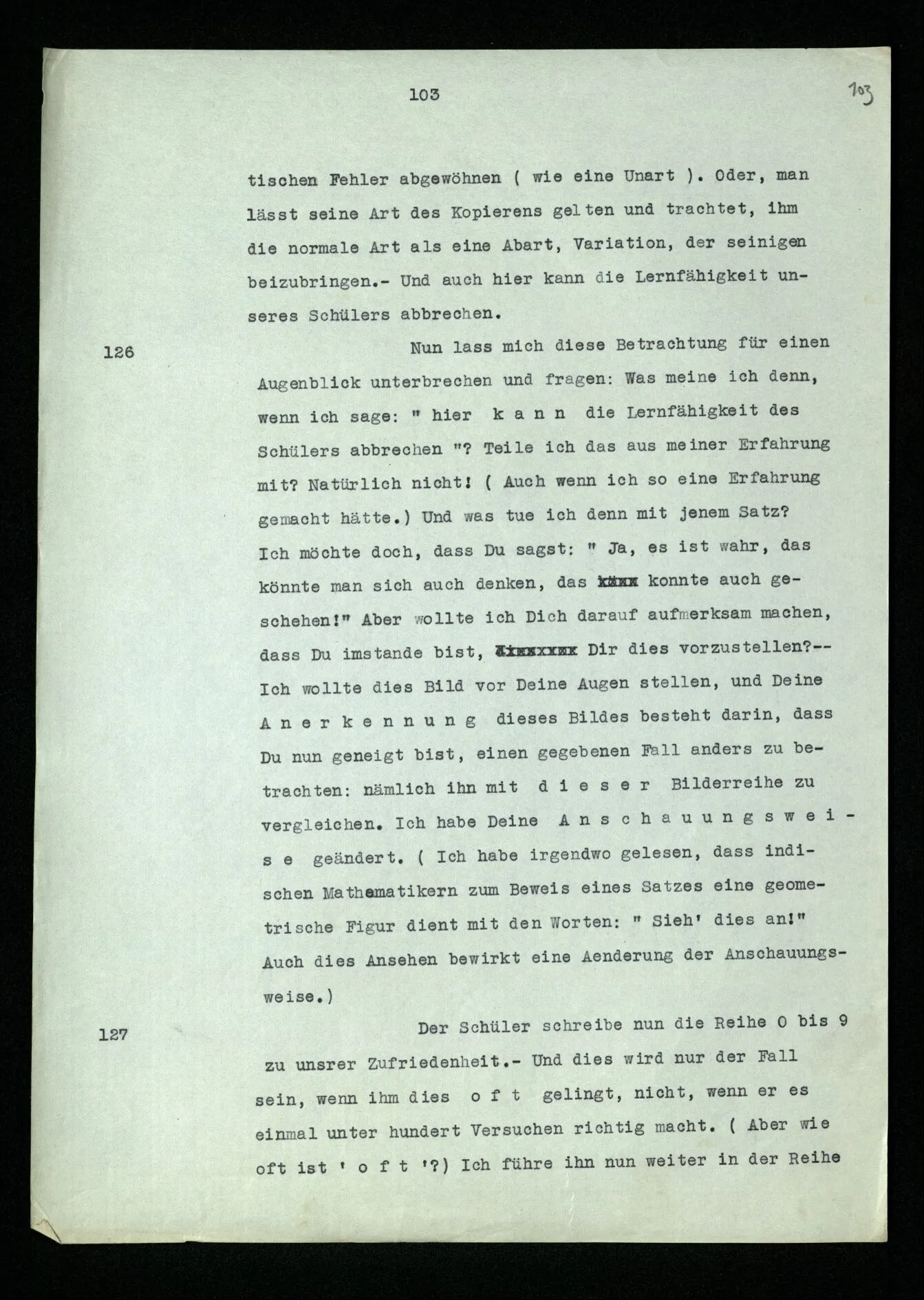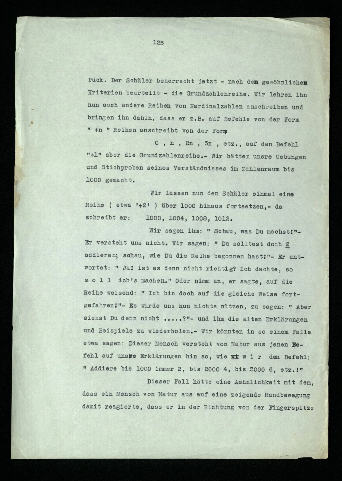 158 Gehen wir nun zu unserm Beispiel (125) zurück. Der Schüler beherrscht jetzt – nach den gewöhnlichen Kriterien beurteilt – die Grundzahlenreihe. Wir lehren ihn nun auch andere Reihen von Kardinalzahlen anschreiben und bringen ihn dahin, daß er z.B. auf Befehle von der Form “+n” Reihen anschreibt von der Form
