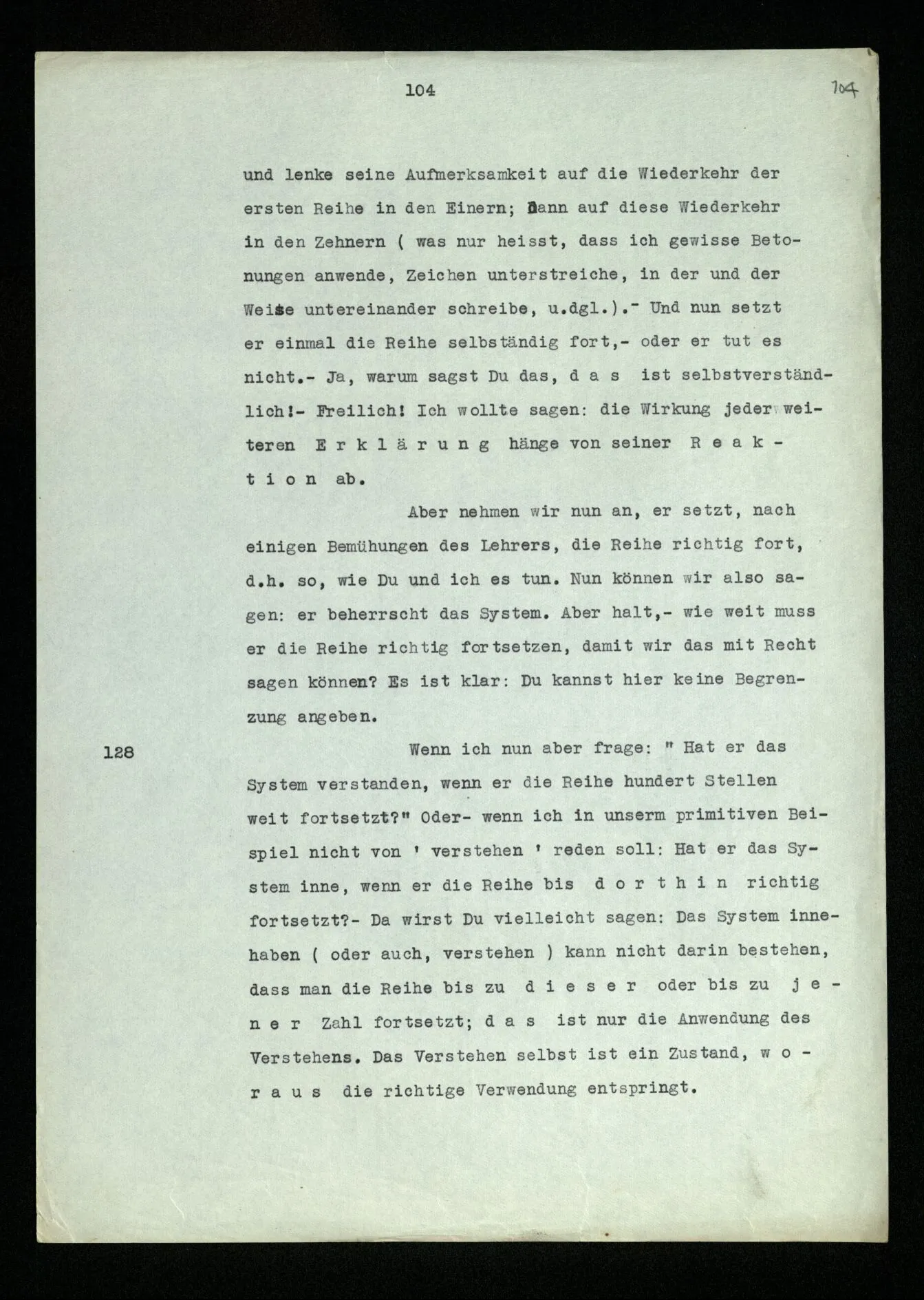0, n, 2n, 3n, etc., auf den Befehl “ + 1” aber die Grundzahlenreihe. – Wir hätten unsre Übungen und Stichproben seines Verständnisses im Zahlenraum bis 1000 gemacht. Wir lassen nun den Schüler einmal eine Reihe (etwa ‘ + 2’) über 1000 hinaus fortsetzen, – da schreibt er: 1000, 1004, 1008, 1012. Wir sagen ihm: “Schau, was Du machst!” – Er versteht uns nicht. Wir sagen: “Du solltest doch 2 addieren; schau, wie Du die Reihe begonnen hast!” – Er antwortet: “Ja! ist es denn nicht richtig? Ich dachte, so soll ich’s machen.” Oder nimm an, er sagte, auf die Reihe weisend: “Ich bin doch auf die gleiche Weise fortgefahren!” – Es würde uns nun nichts nützen, zu sagen: “Aber siehst Du denn nicht …?” – und ihm die alten Erklärungen und Beispiele zu wiederholen. – Wir könnten in so einem Falle etwa sagen: Dieser Mensch versteht von Natur aus jenen Befehl auf unsre Erklärungen hin so, wie wir den Befehl: “Addiere bis 1000 immer 2, bis 2000 4, bis 3000 6, etc.!” Dieser Fall hätte eine Ähnlichkeit mit dem, daß ein Mensch von Natur aus auf eine zeigende Handbewegung damit reagierte, daß er in der Richtung von der Fingerspitze zur Handwurzel blickt, statt in der Richtung zur Fingerspitze.