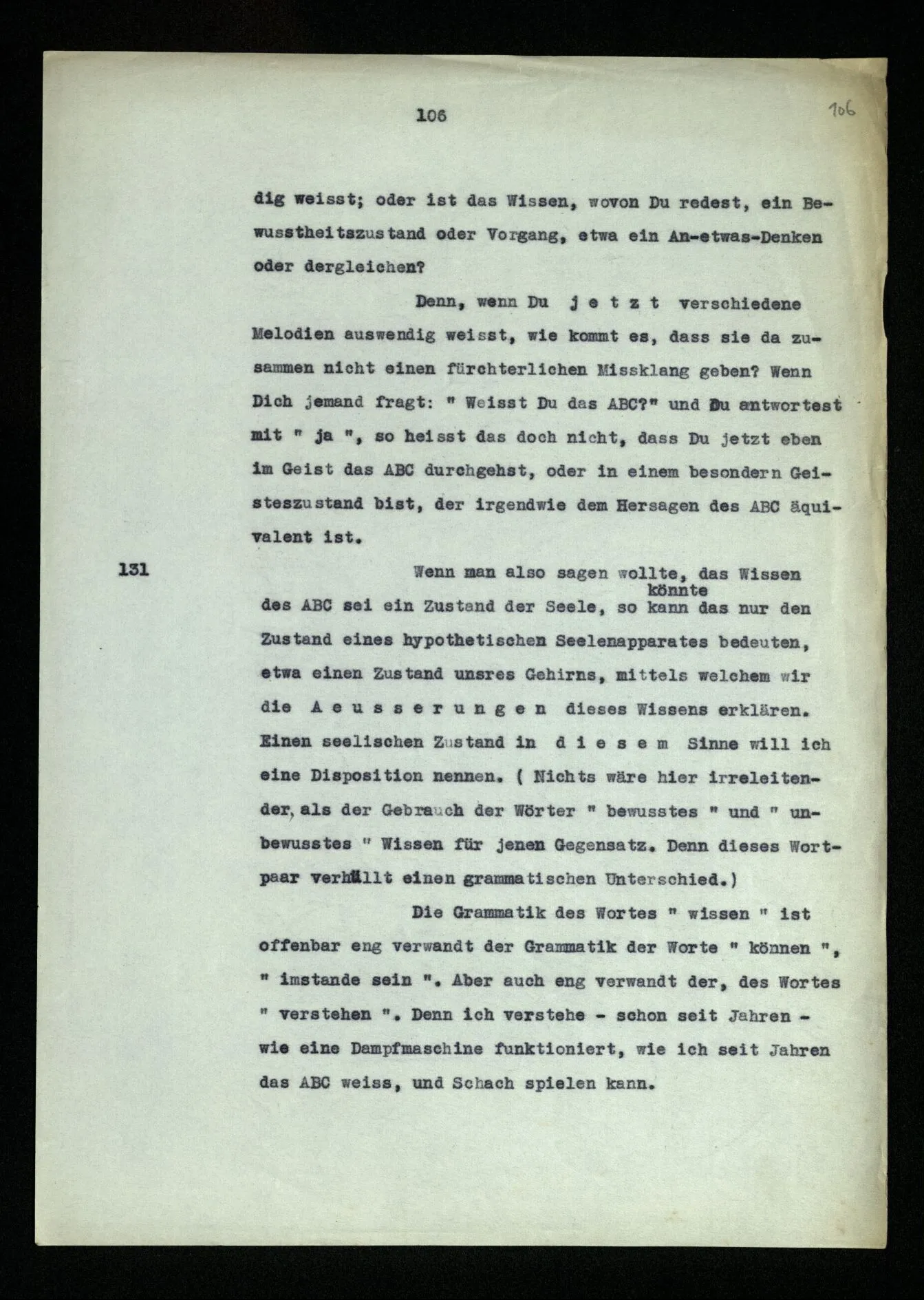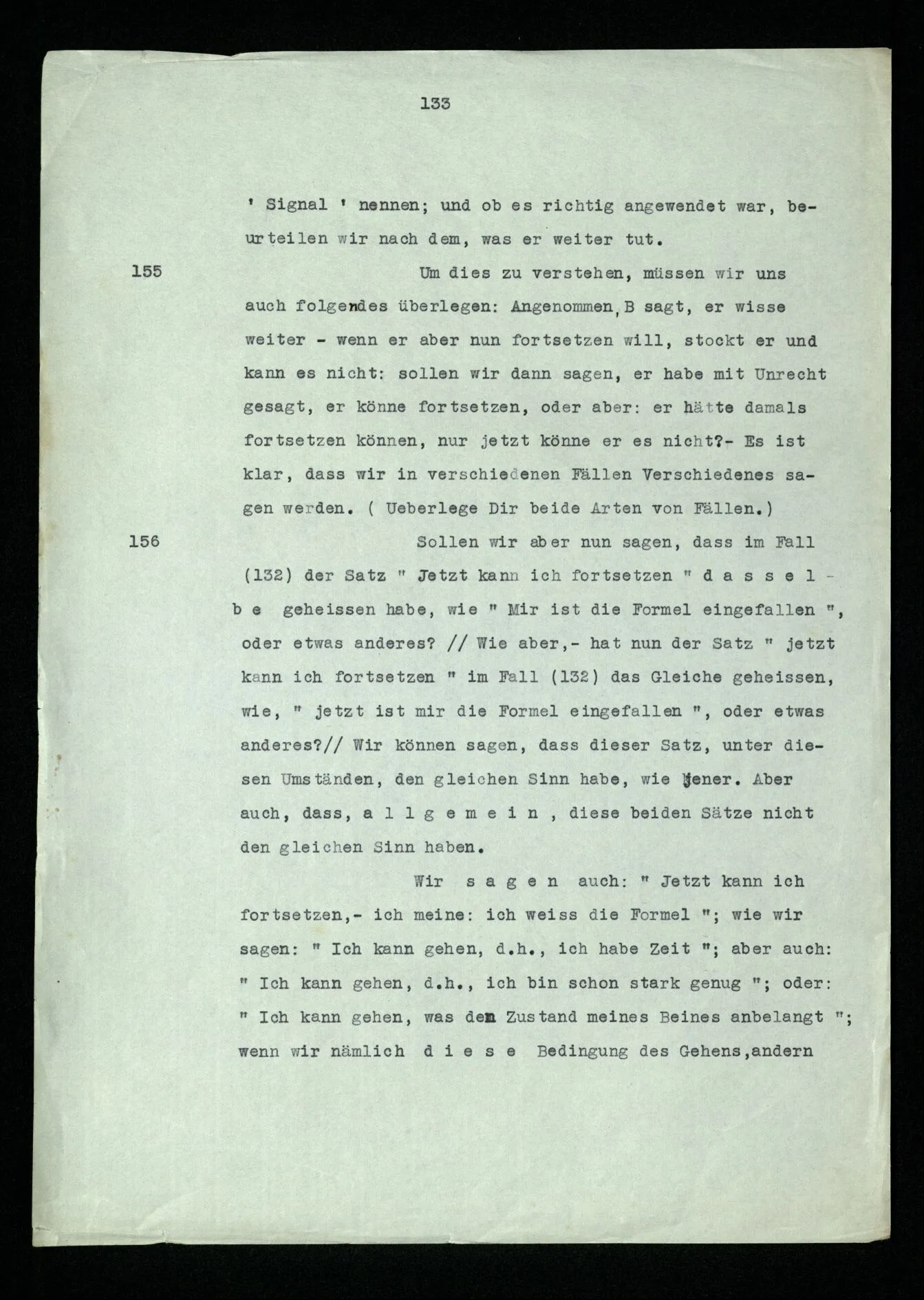 155 Um dies zu verstehen, müssen wir uns auch folgendes überlegen: Angenommen, B sagt, er wisse weiter – wenn er aber nun fortsetzen will, stockt er und kann es nicht: sollen wir dann sagen, er habe mit Unrecht gesagt, er könne fortsetzen, oder aber: er hätte damals fortsetzen können, nur jetzt könne er es nicht? – Es ist klar, daß wir in verschiedenen Fällen Verschiedenes sagen werden. (Überlege Dir beide Arten von Fällen.)